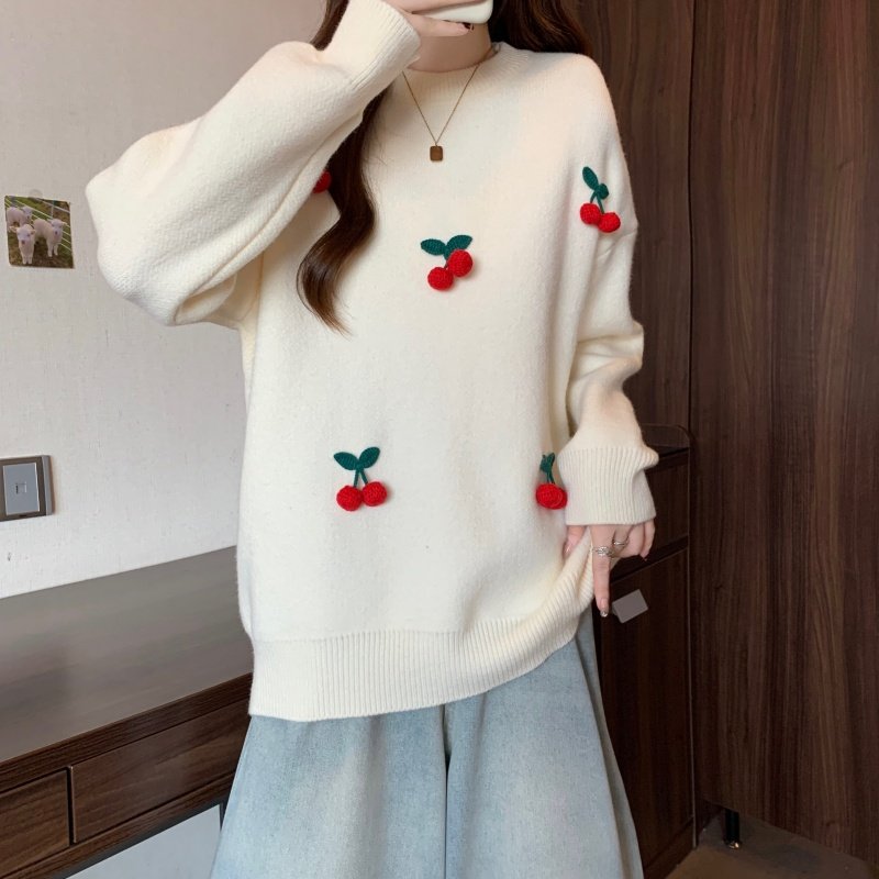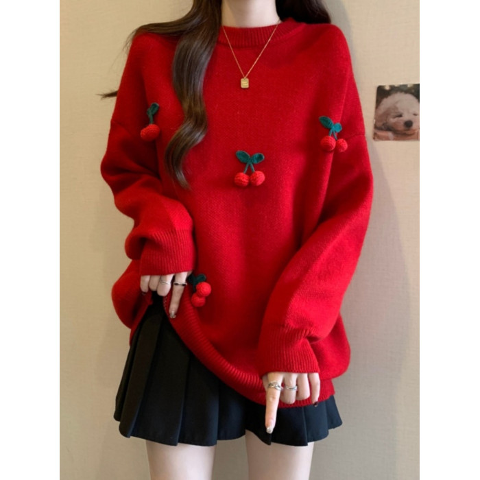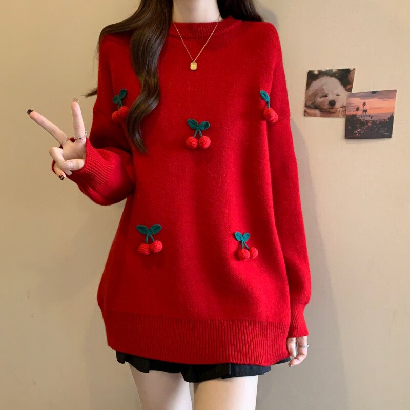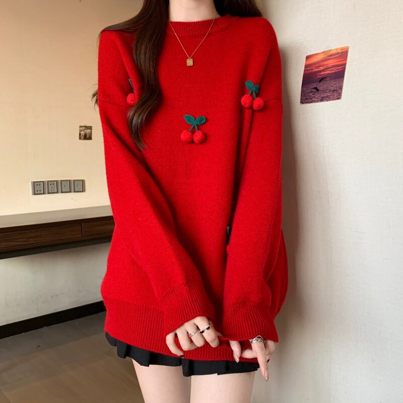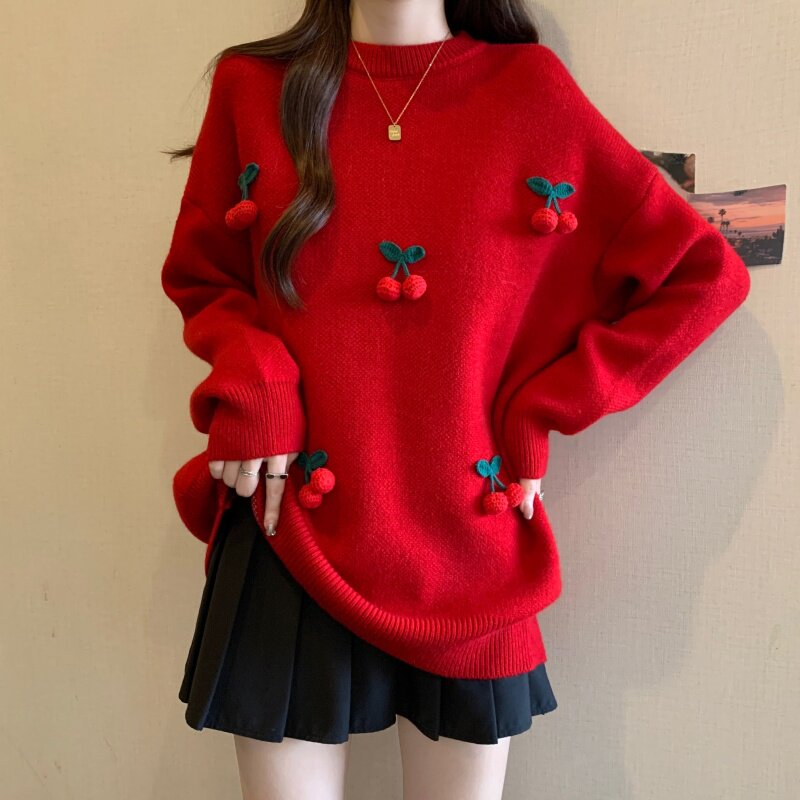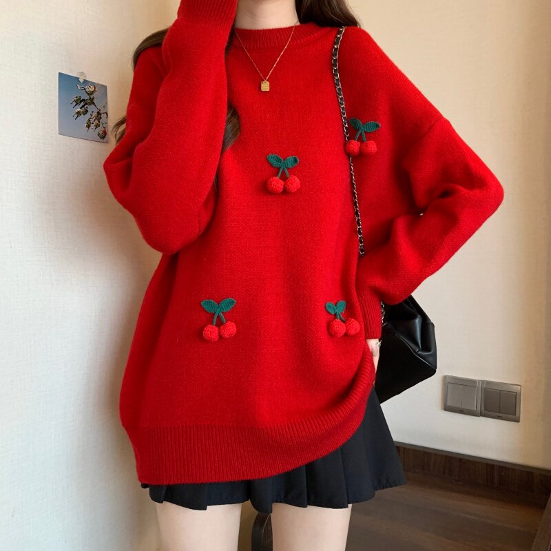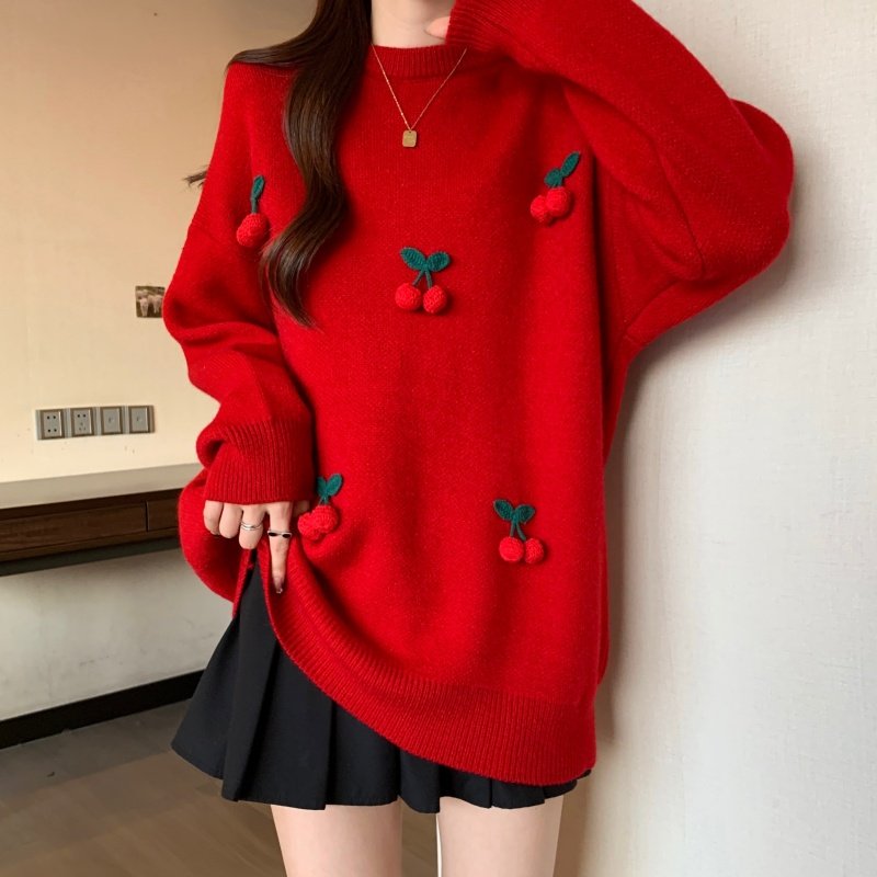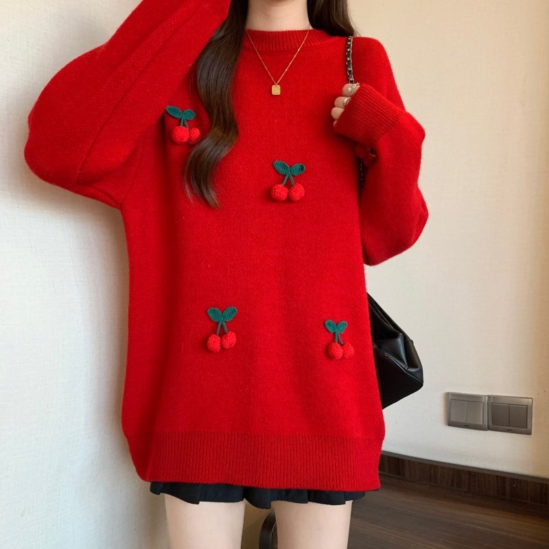 高級感新年聖誕紅色櫻桃加厚毛衣上衣大碼女裝秋冬款慵懶風針織衫