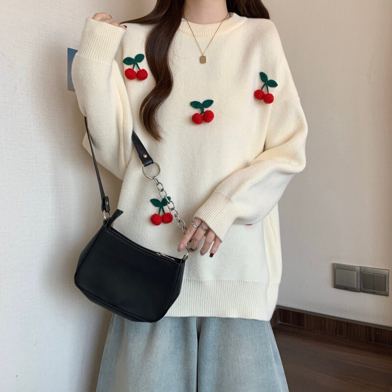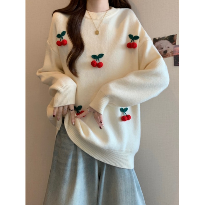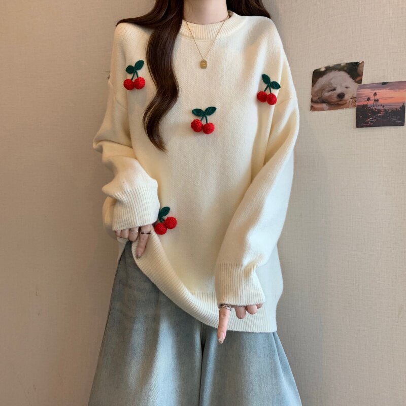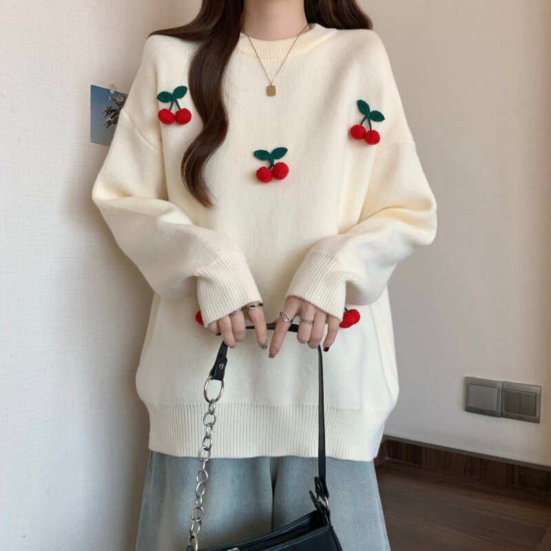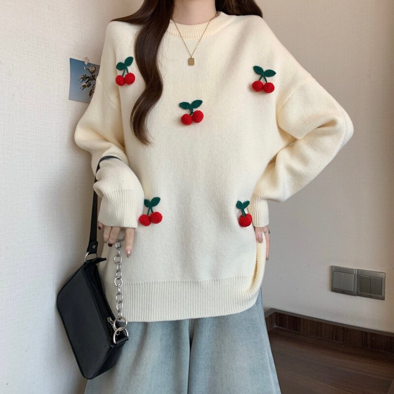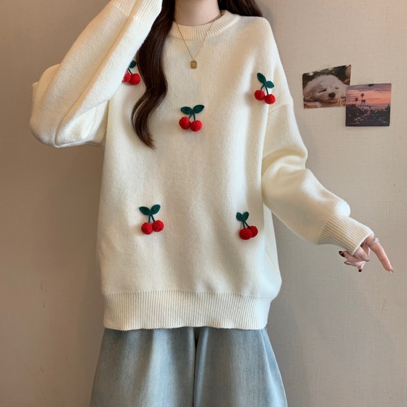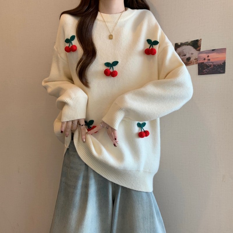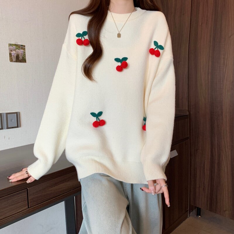 高級感新年聖誕紅色櫻桃加厚毛衣上衣大碼女裝秋冬款慵懶風針織衫