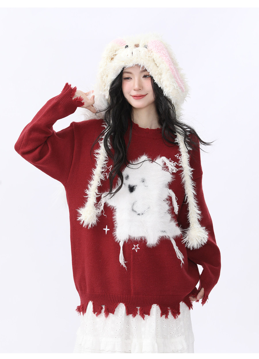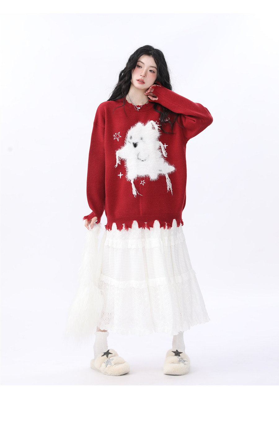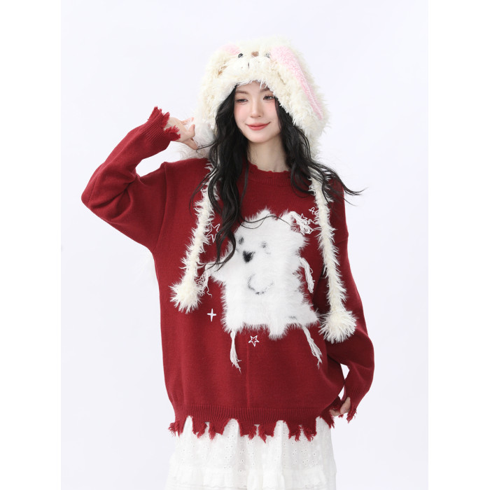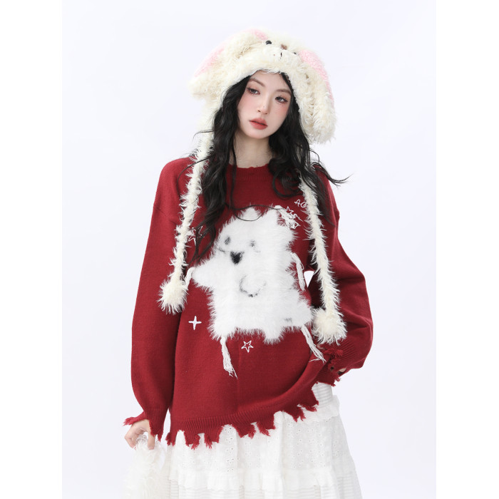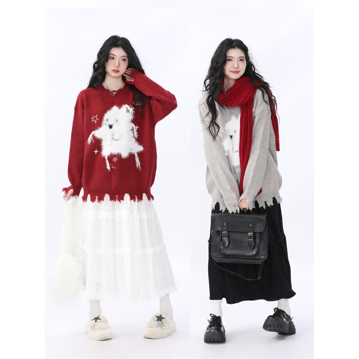 AONW慵懶風小幽靈不規則毛衣寬松休閒外套聖誕紅色針織衫上衣女