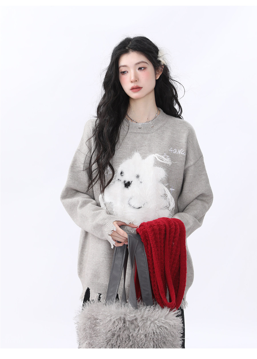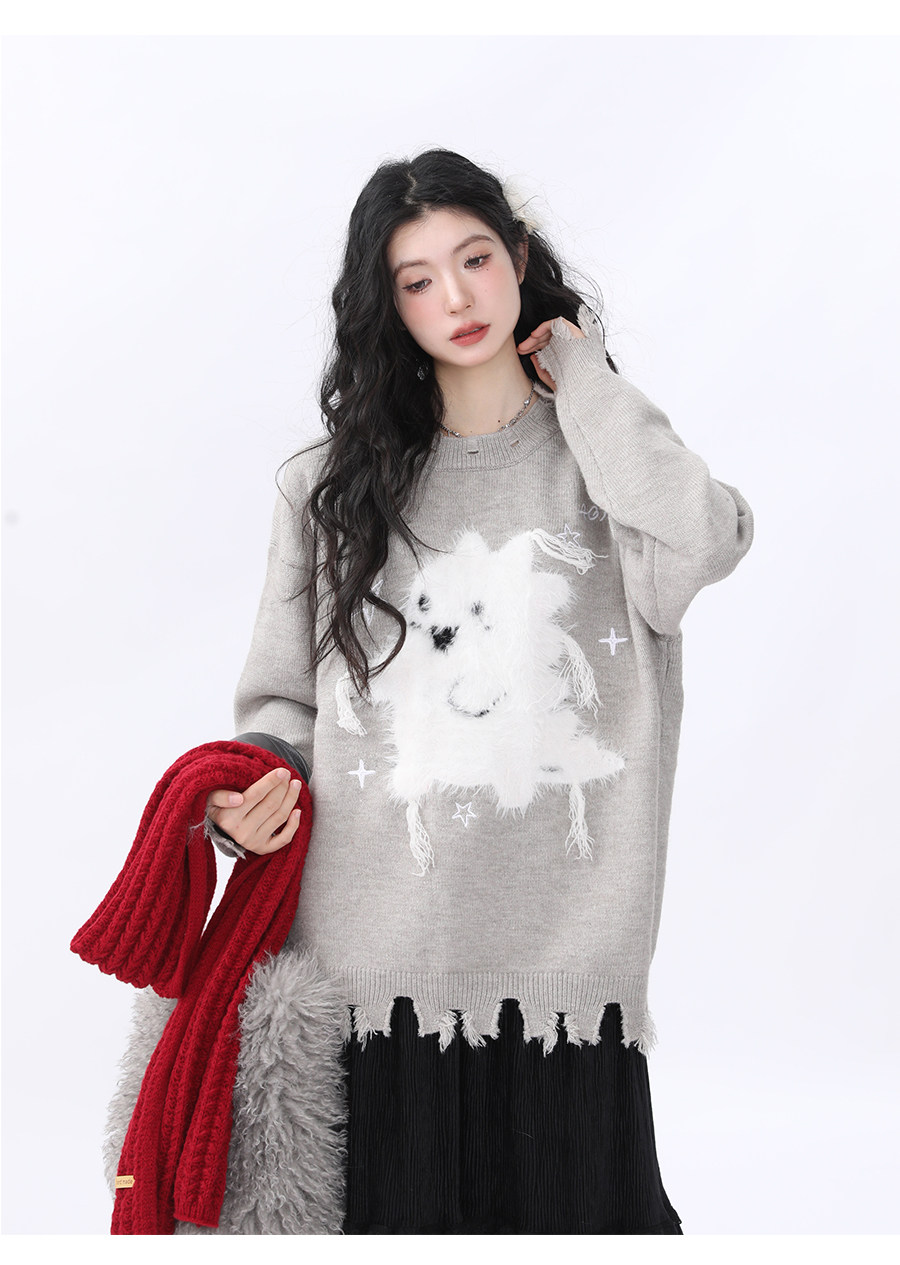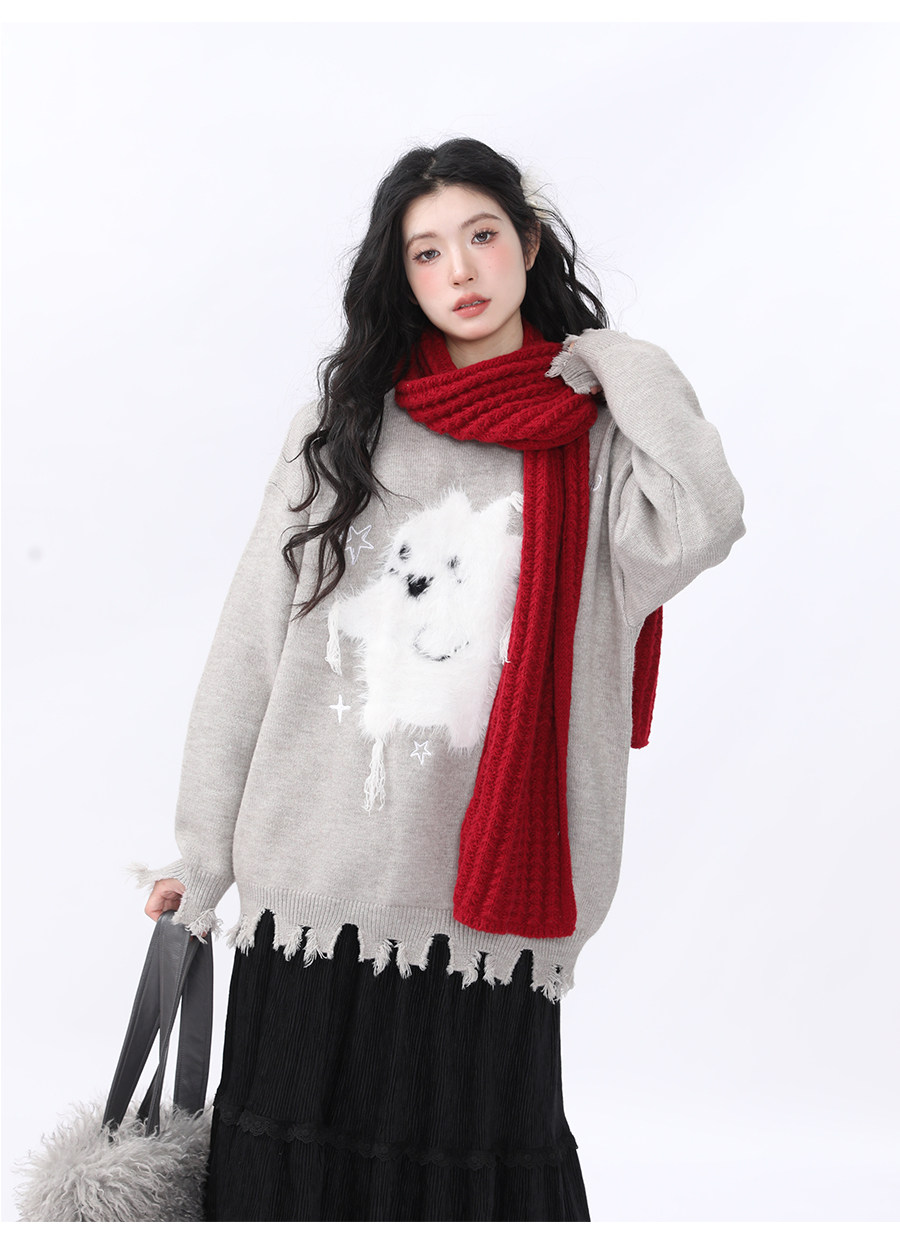 AONW慵懶風小幽靈不規則毛衣寬松休閒外套聖誕紅色針織衫上衣女