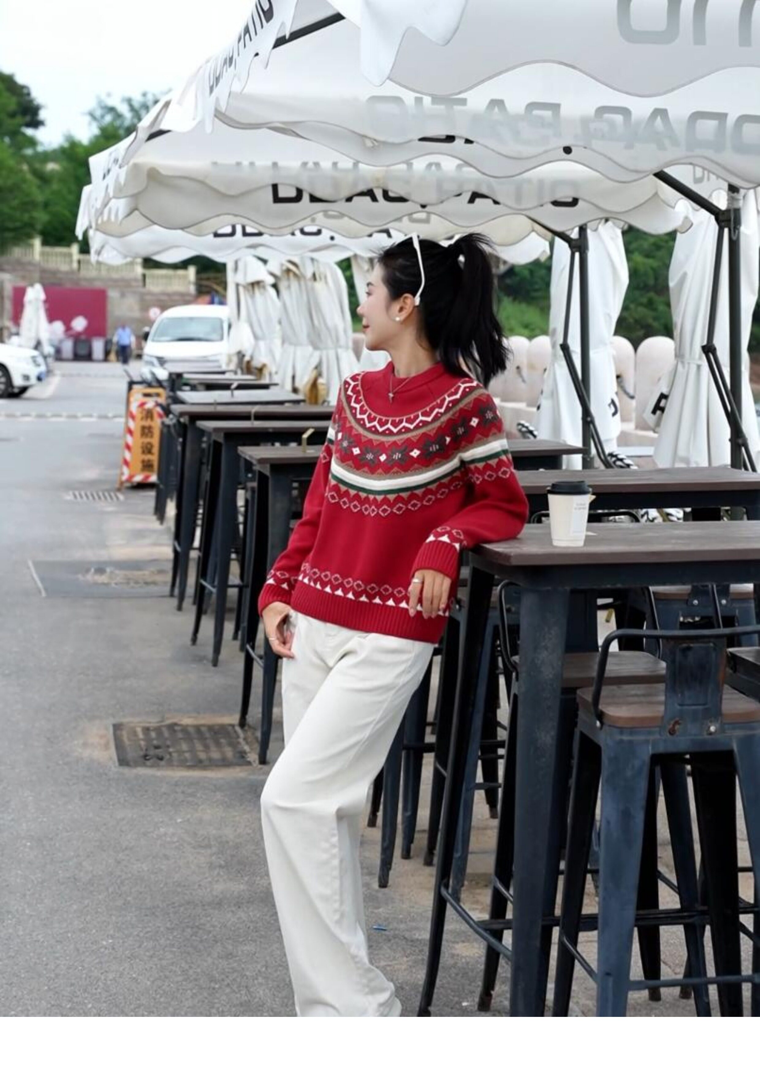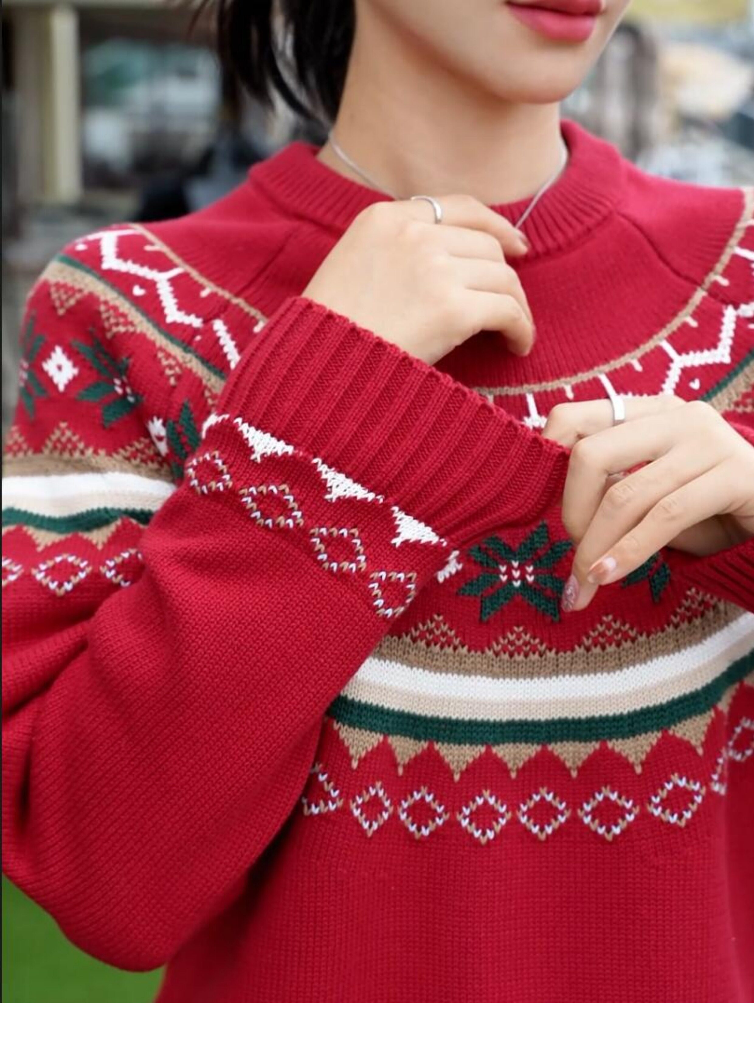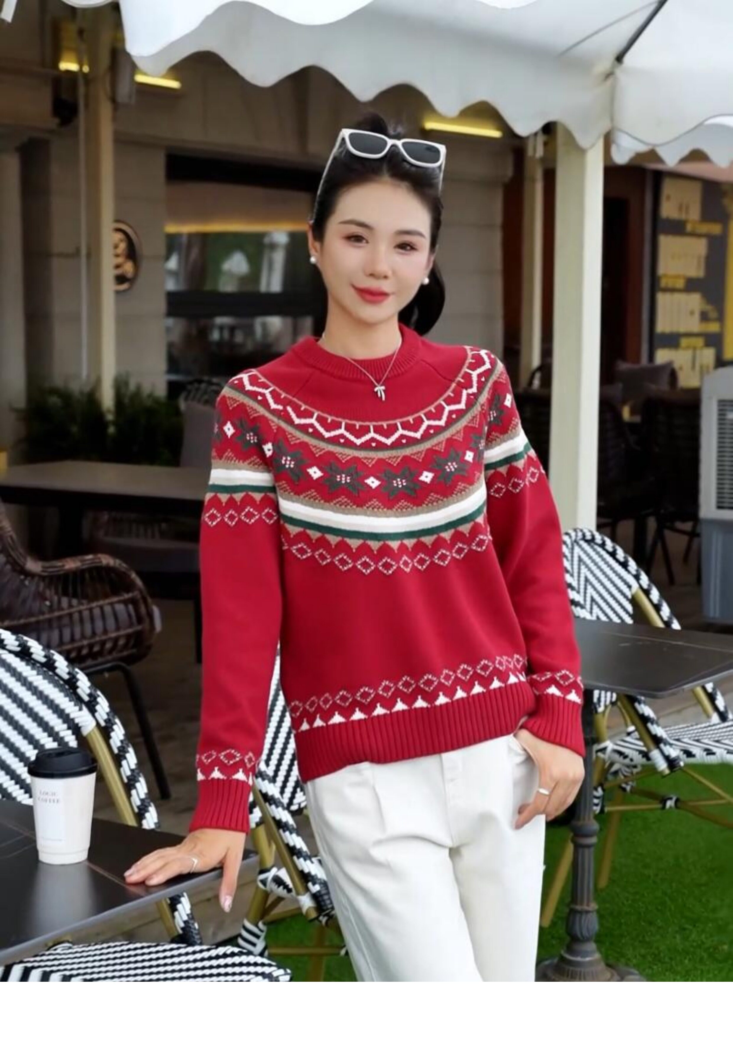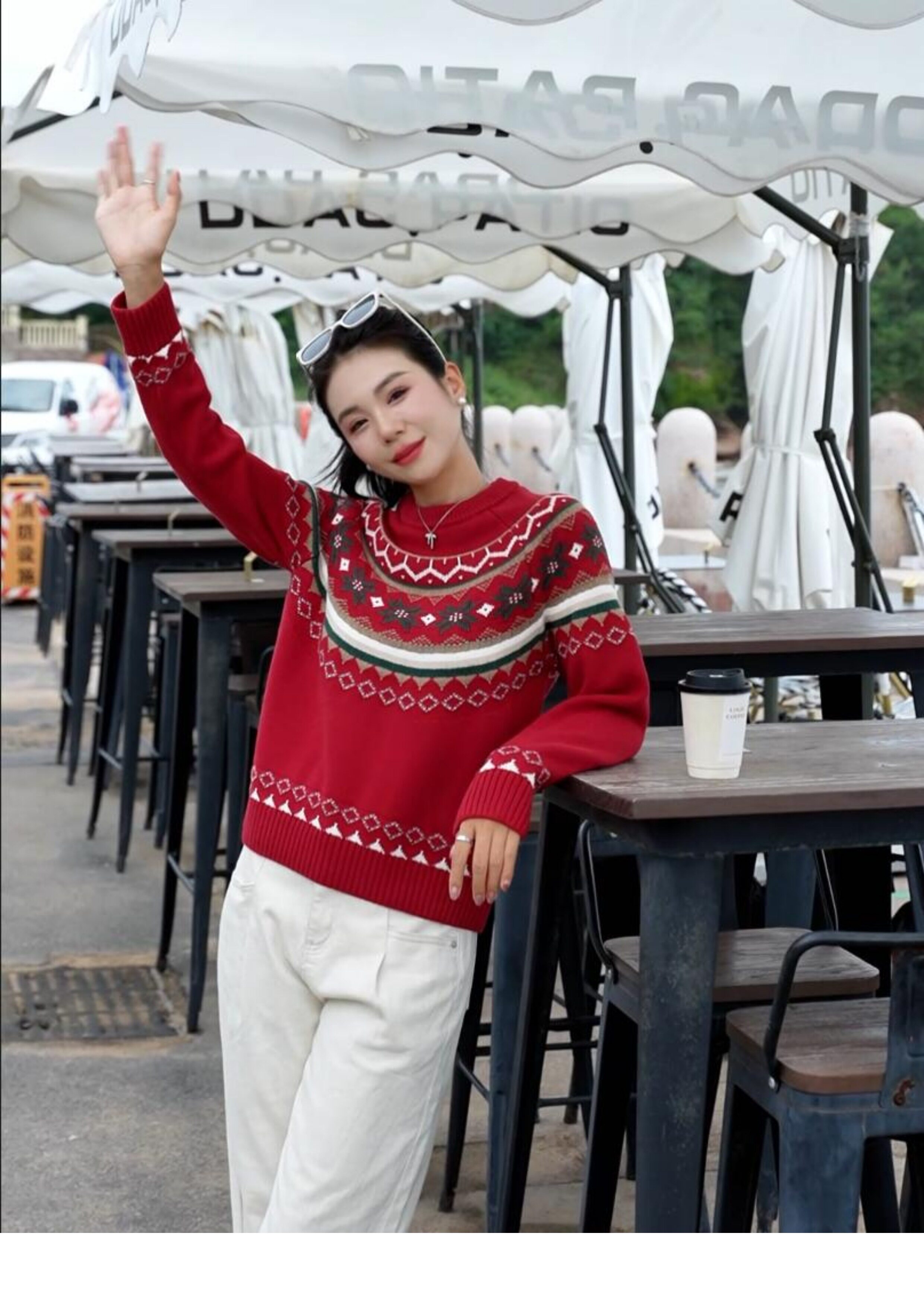 100%全棉線費爾島聖誕紅彩色圓領寬松針織衫女士單穿百搭加厚毛衣