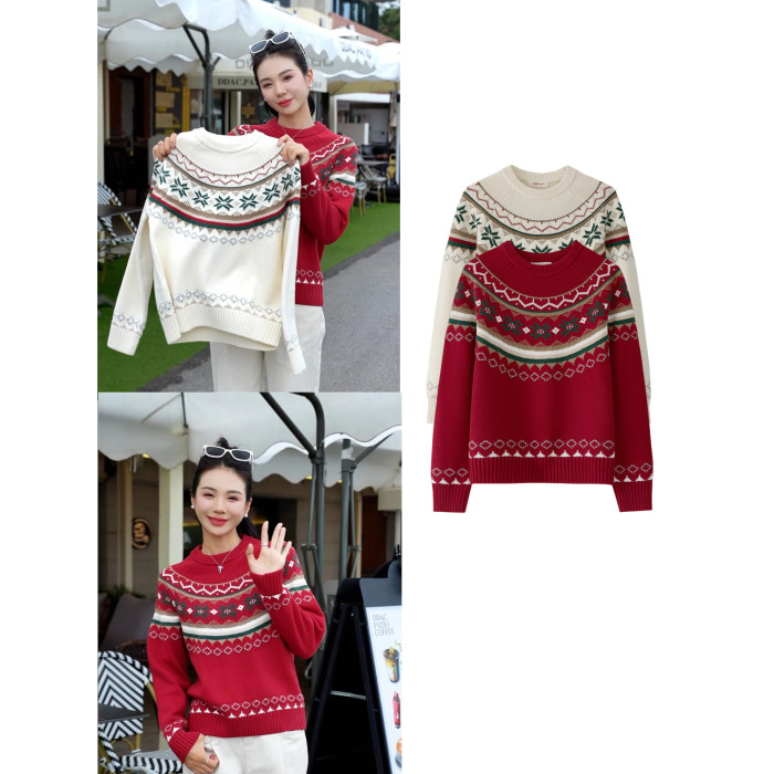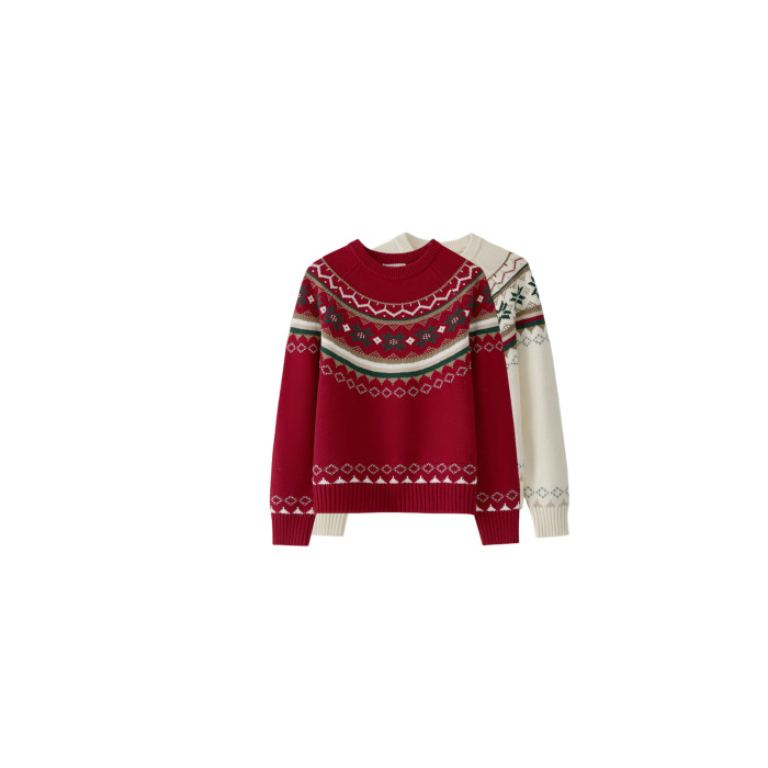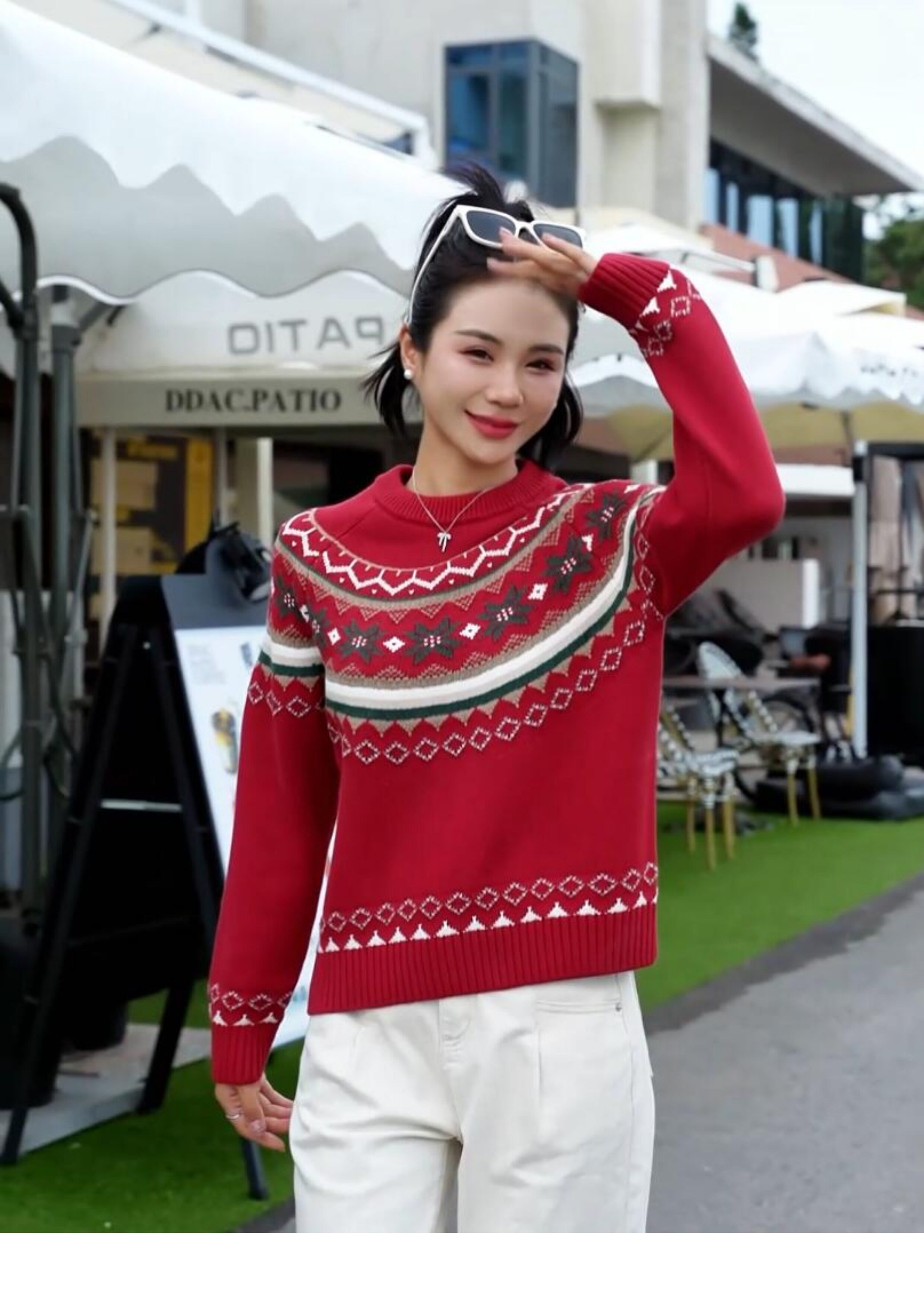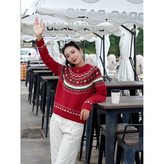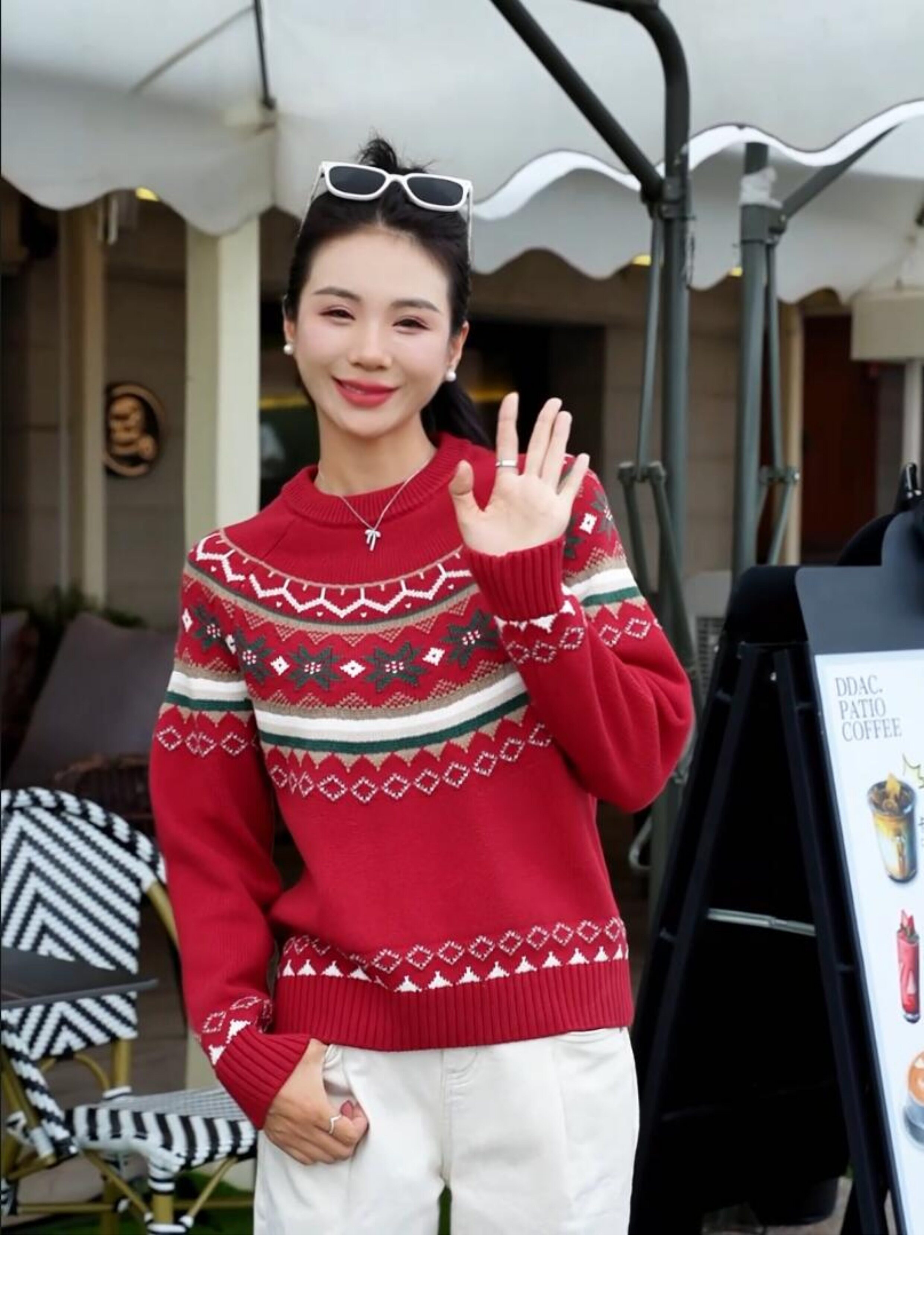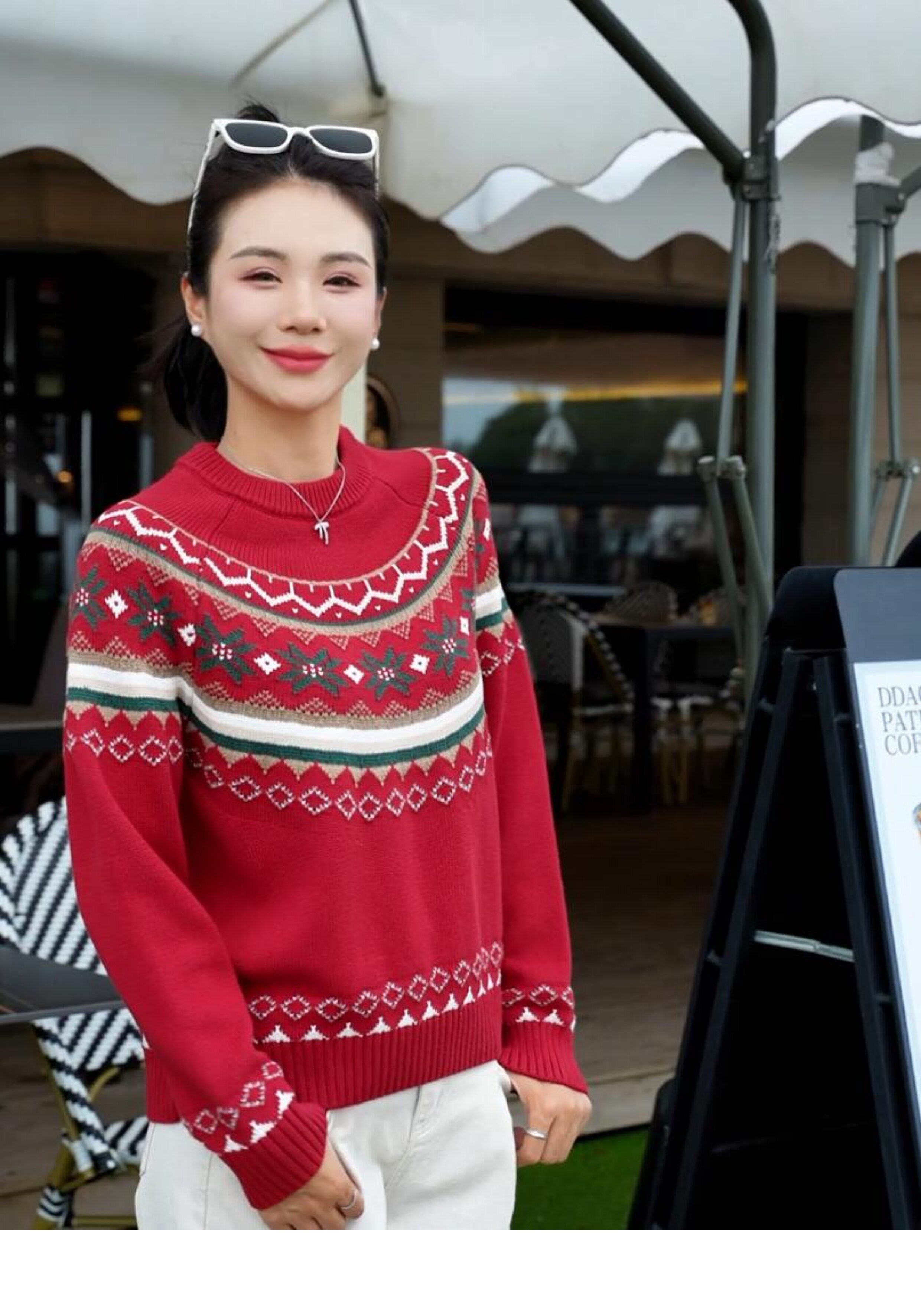 100%全棉線費爾島聖誕紅彩色圓領寬松針織衫女士單穿百搭加厚毛衣