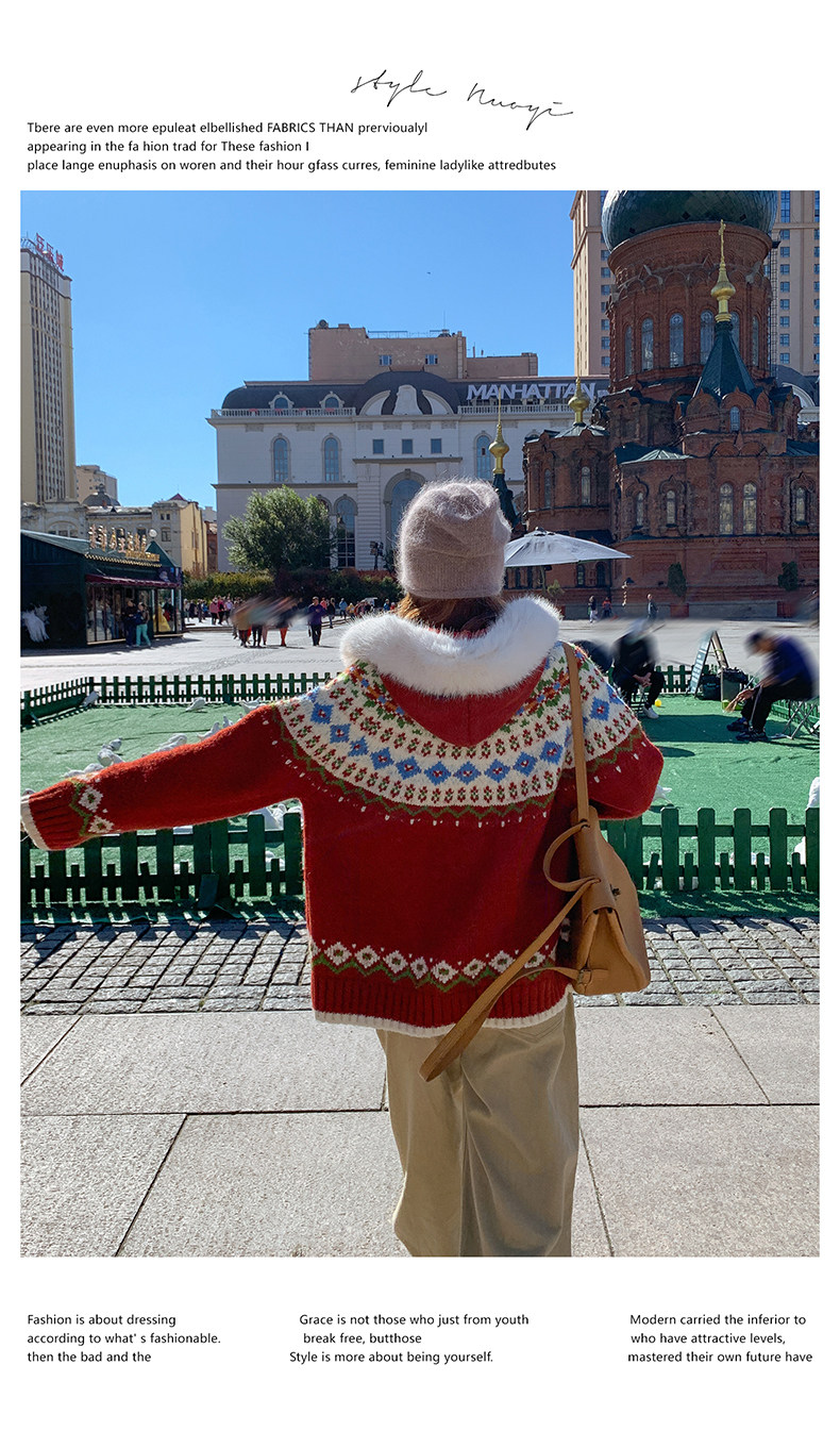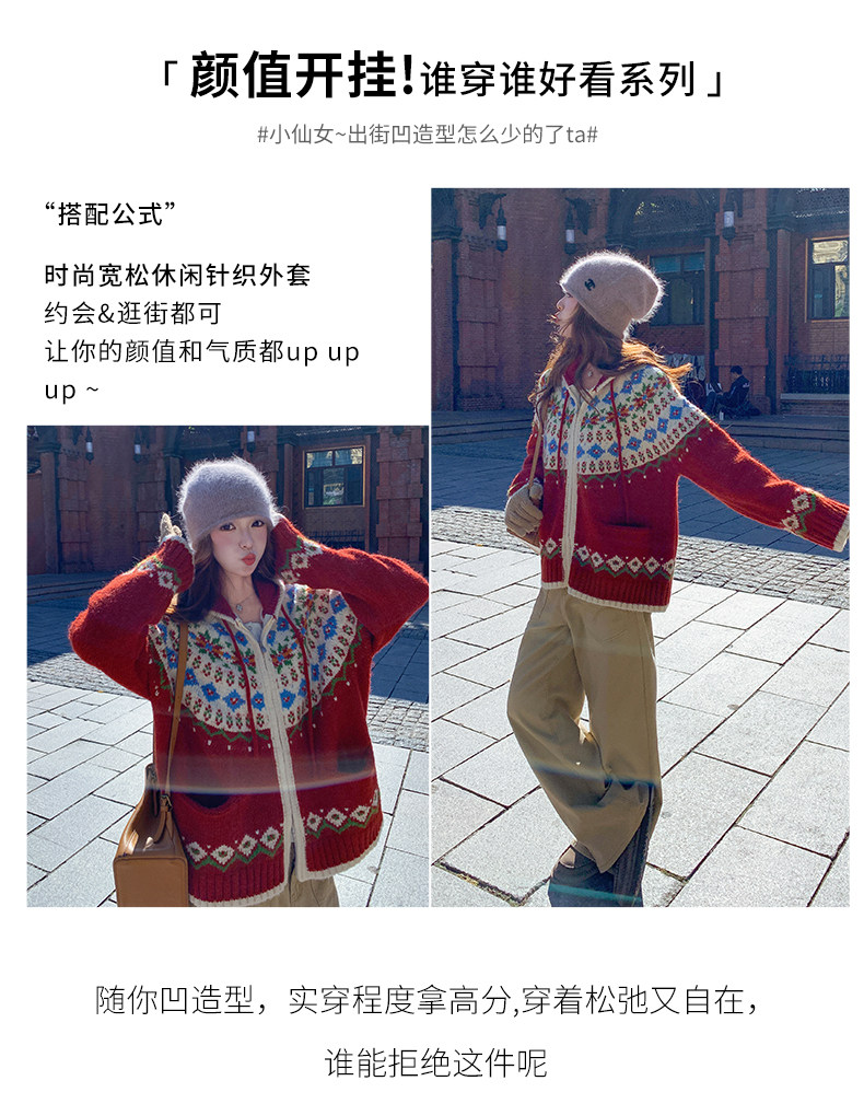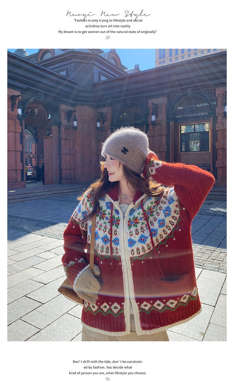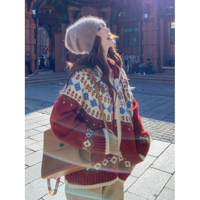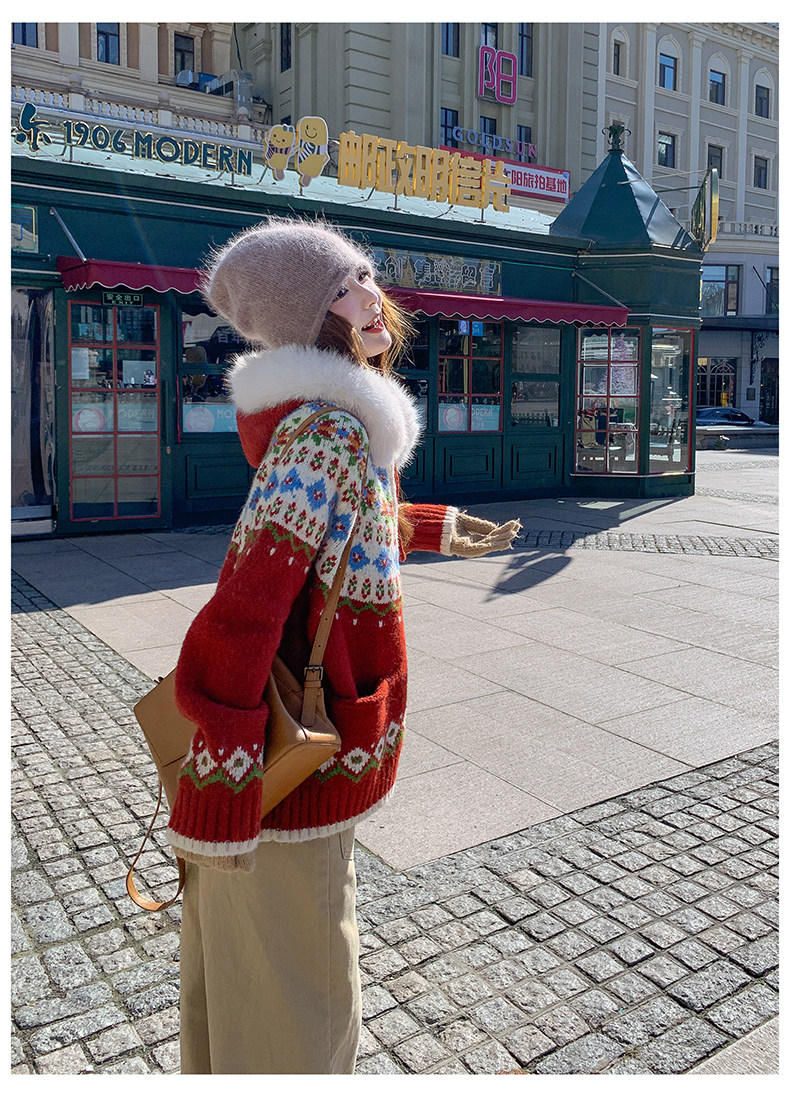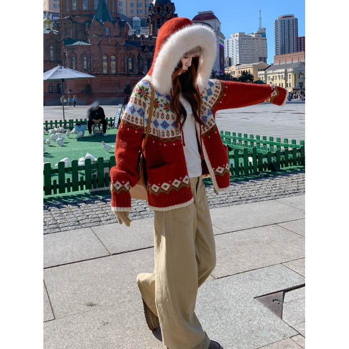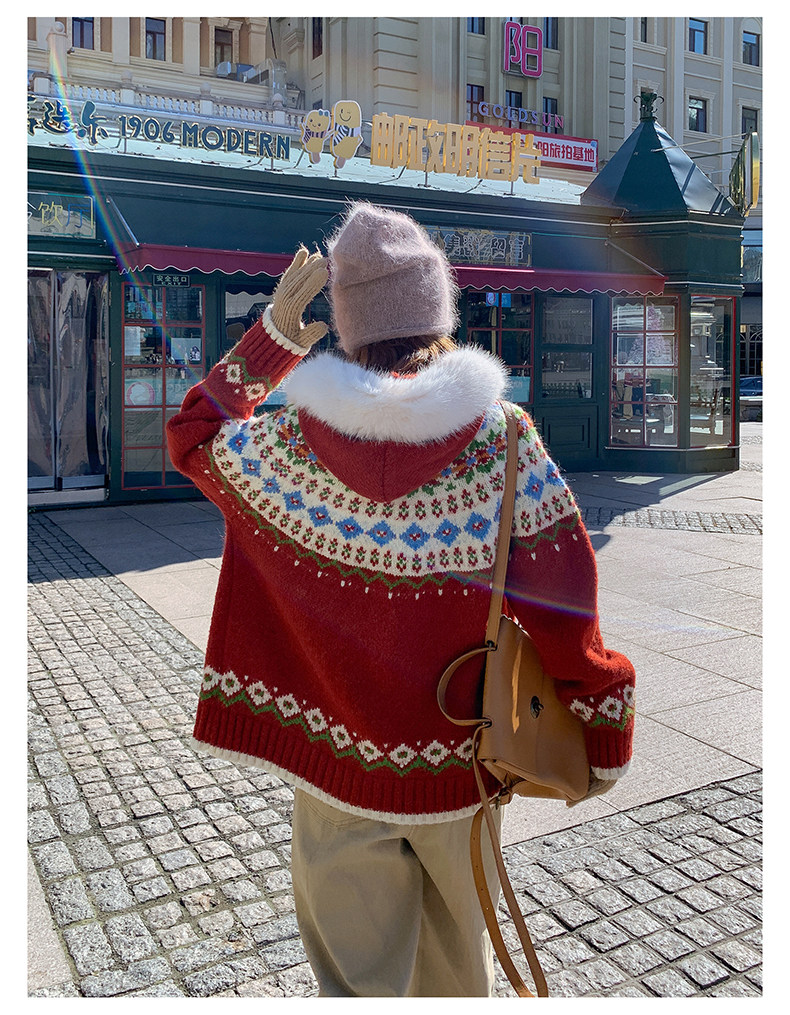 聖誕紅復古印花撞色連帽費爾島毛領針織外套女秋冬2025新韓系氣質
