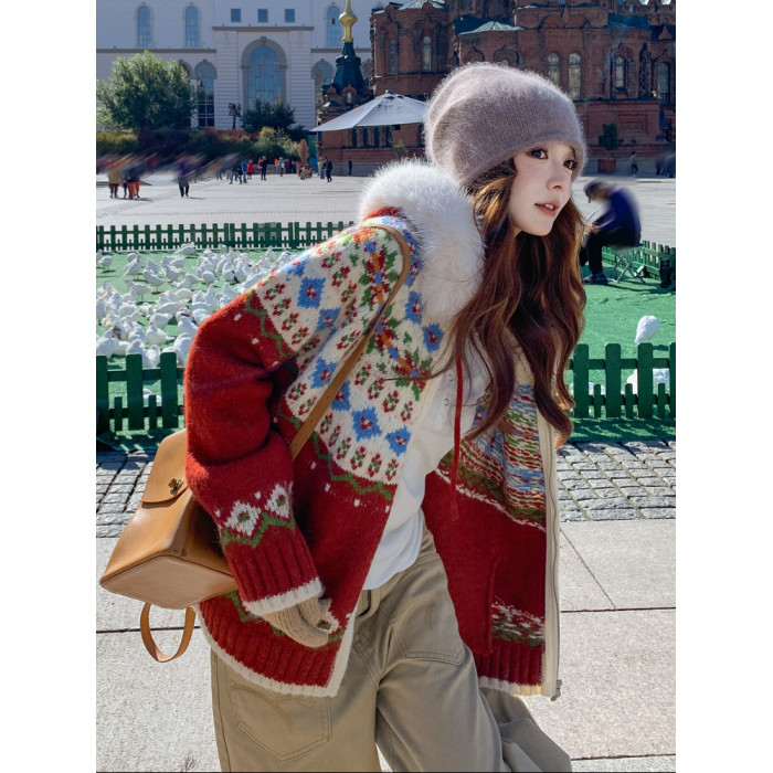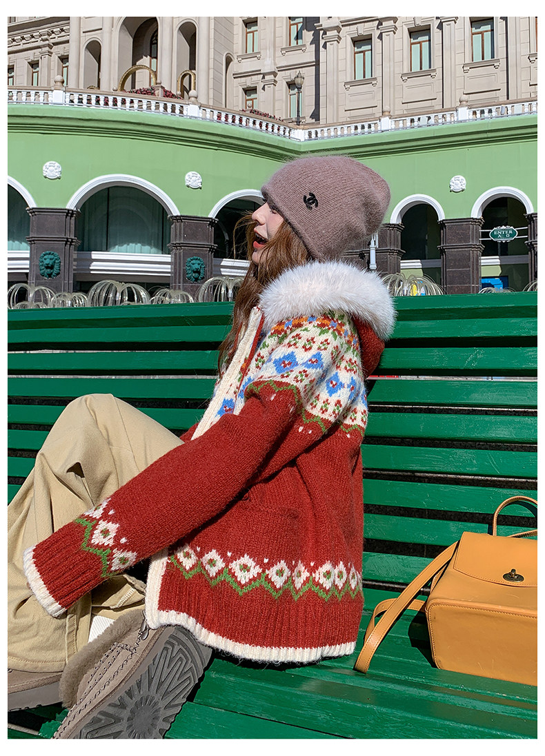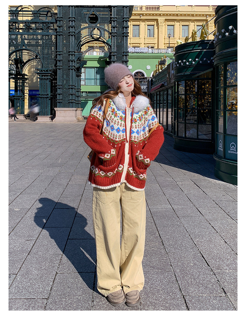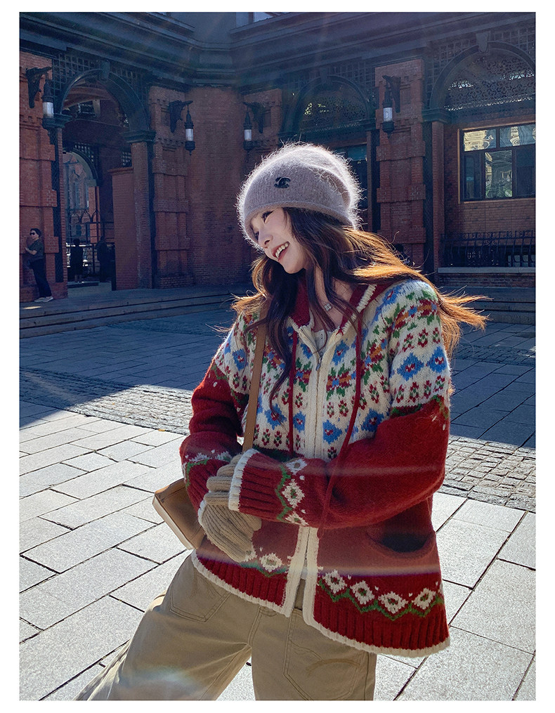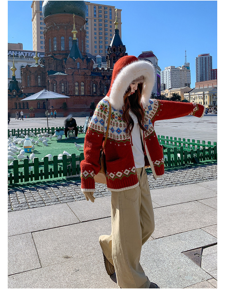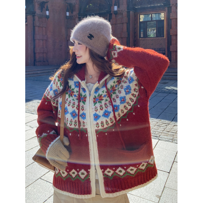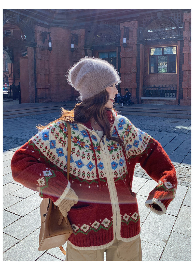 聖誕紅復古印花撞色連帽費爾島毛領針織外套女秋冬2025新韓系氣質