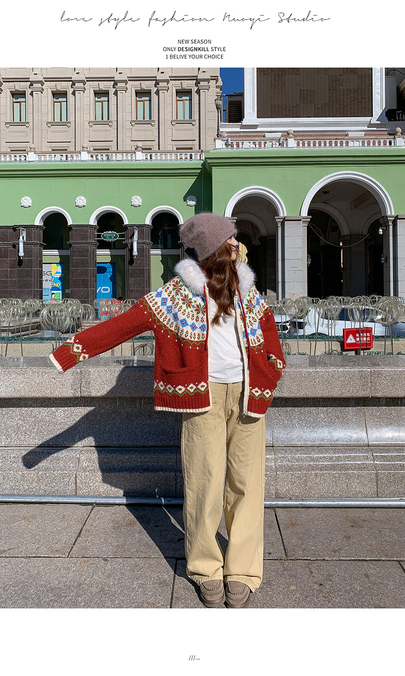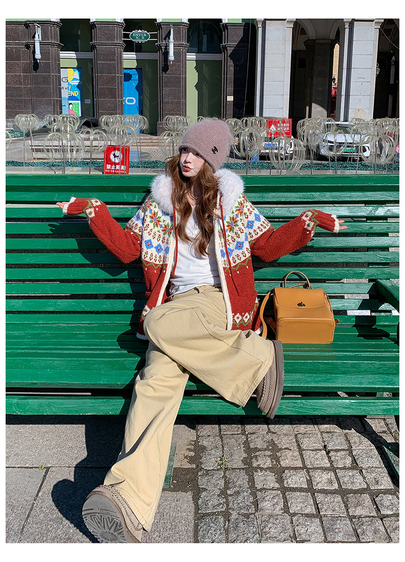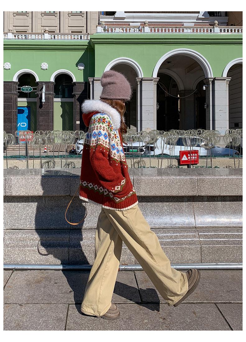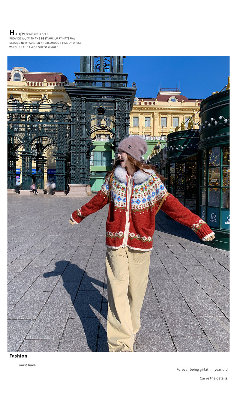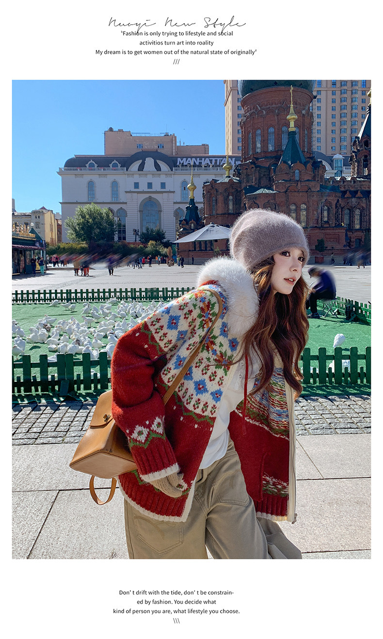 聖誕紅復古印花撞色連帽費爾島毛領針織外套女秋冬2025新韓系氣質