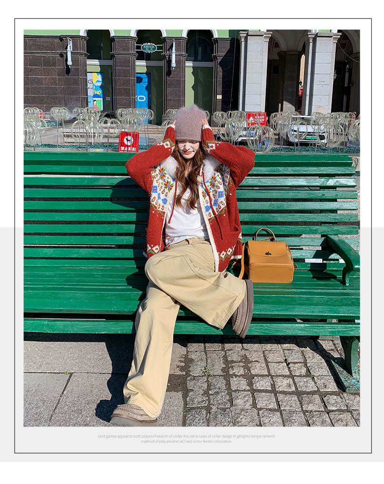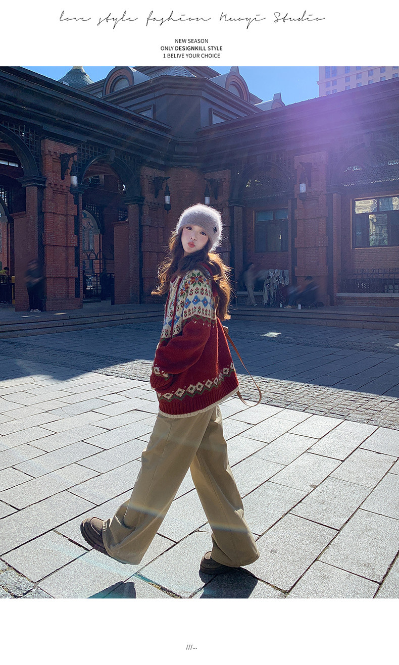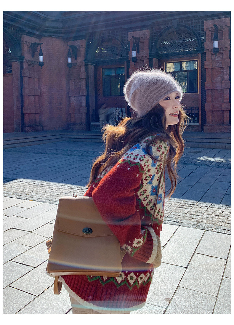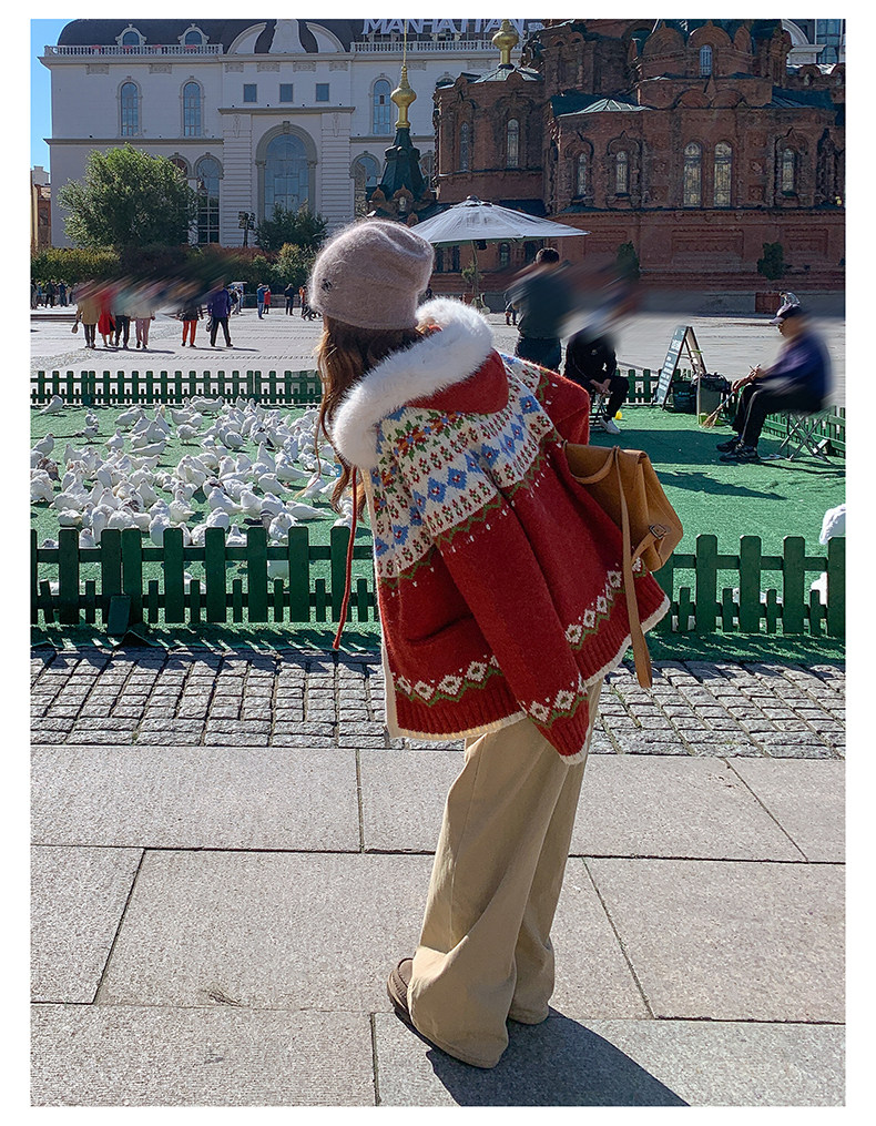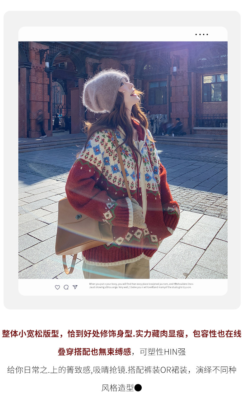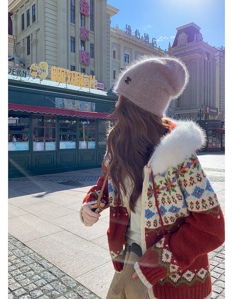 聖誕紅復古印花撞色連帽費爾島毛領針織外套女秋冬2025新韓系氣質