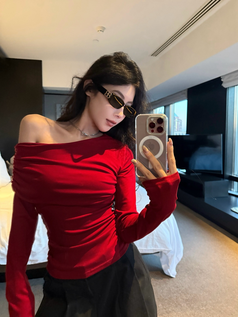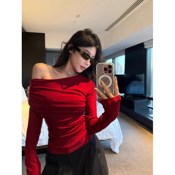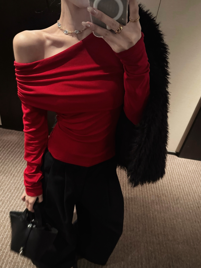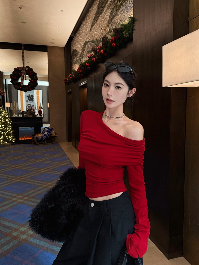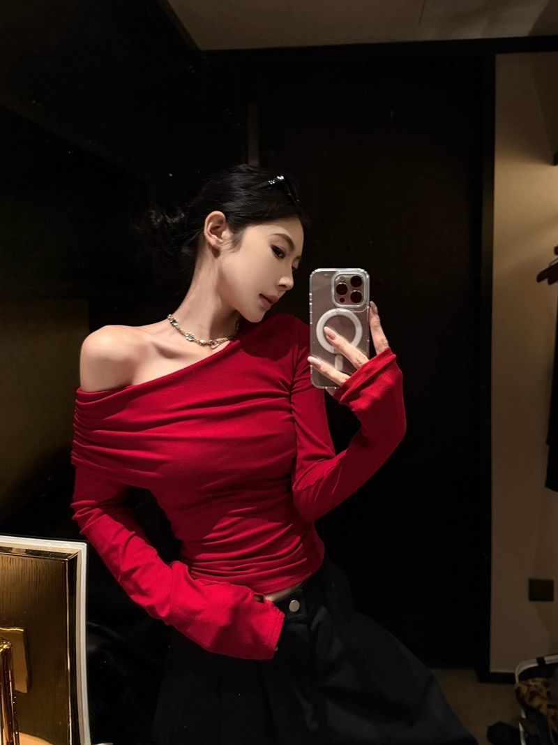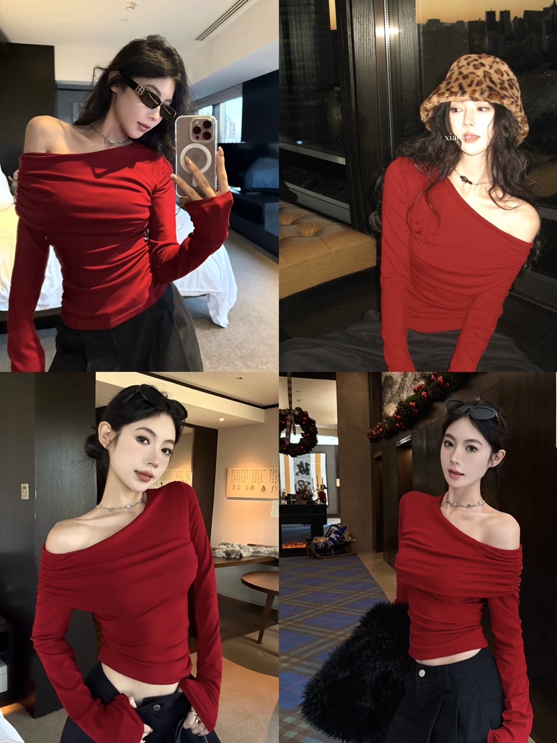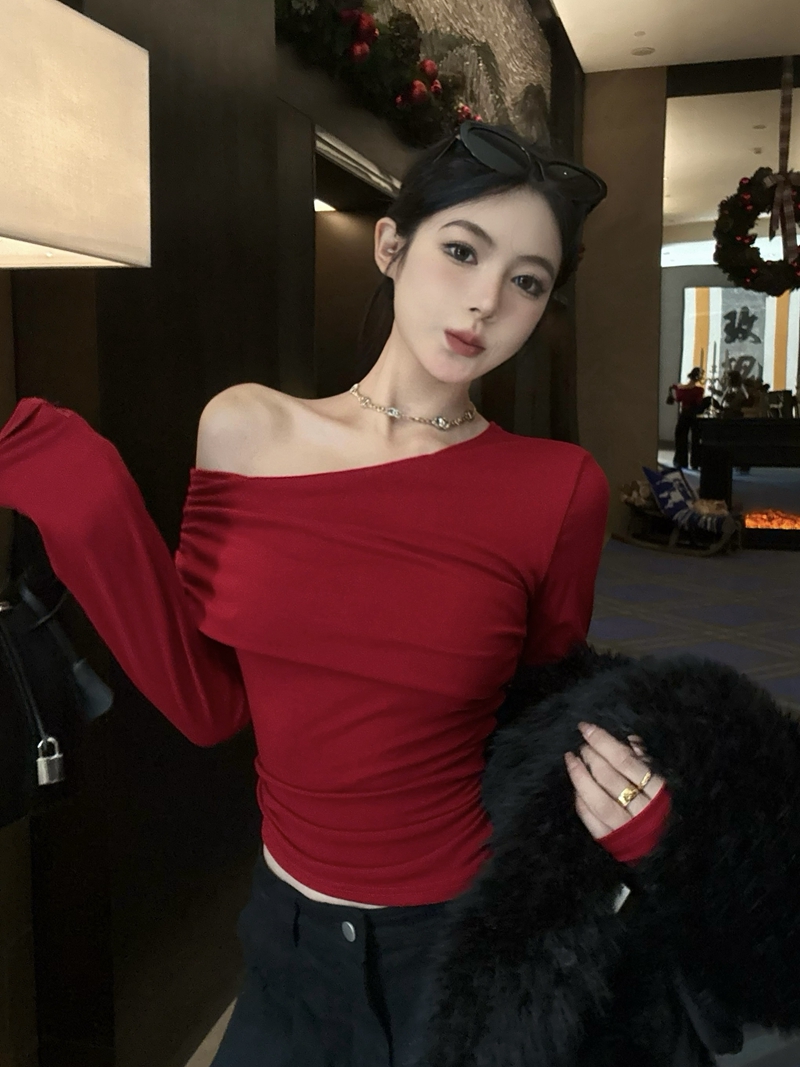 不規則斜肩長袖t恤女秋冬純欲性感一字肩上衣聖誕紅色打底衫內搭