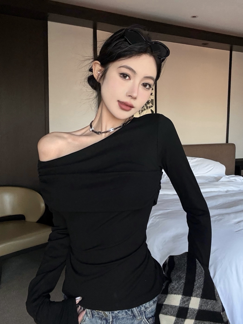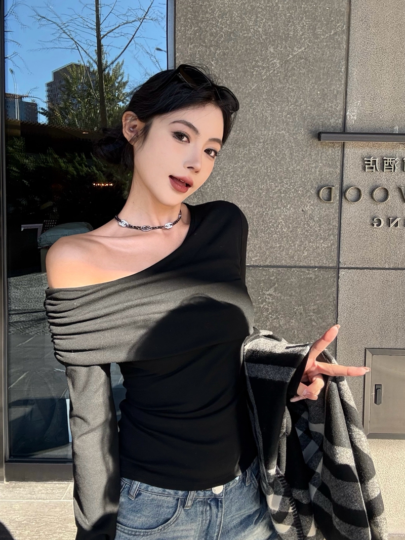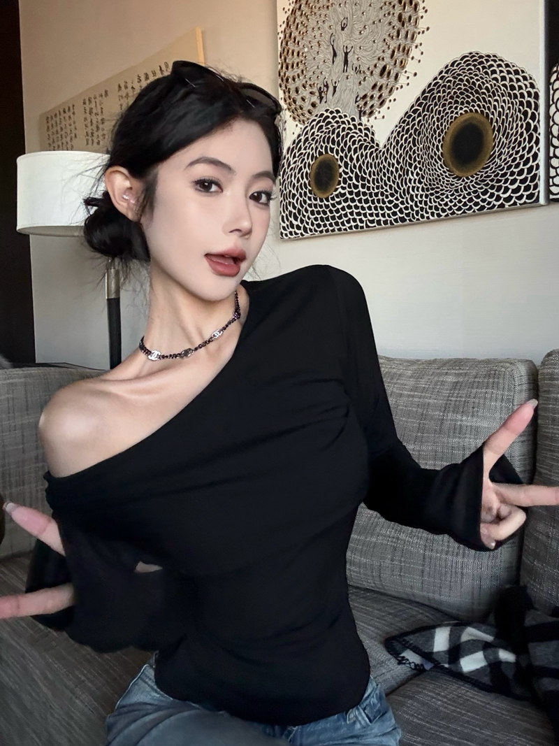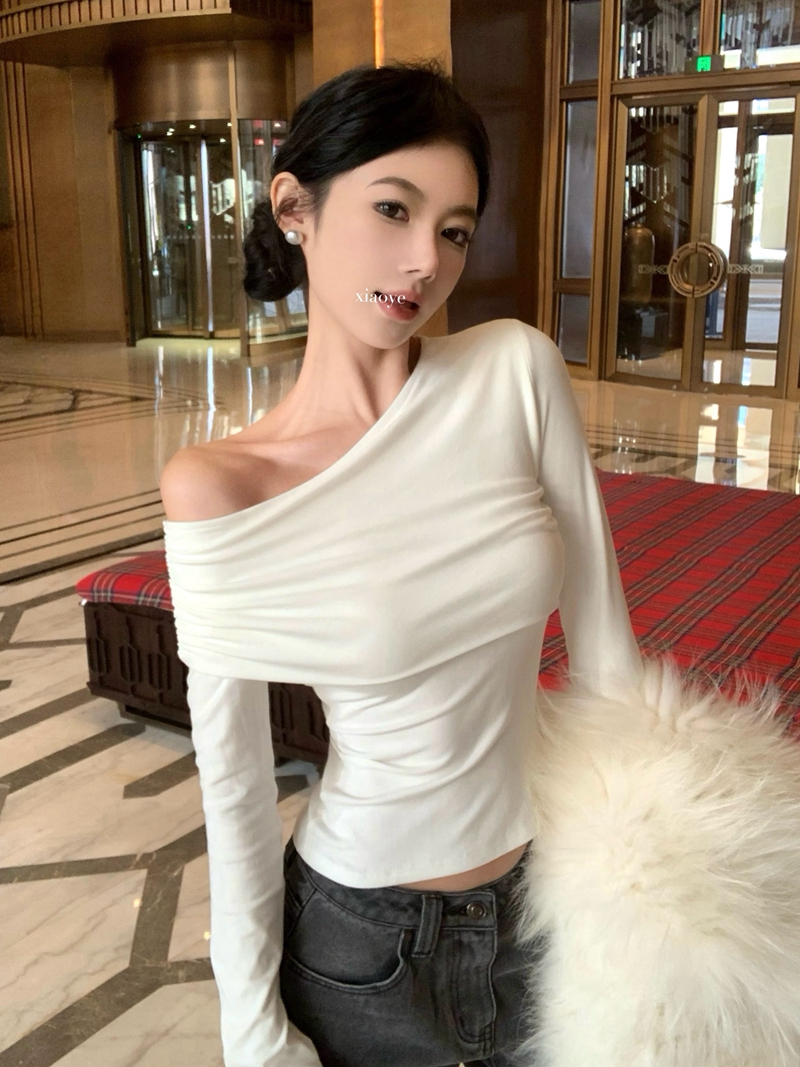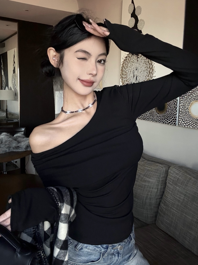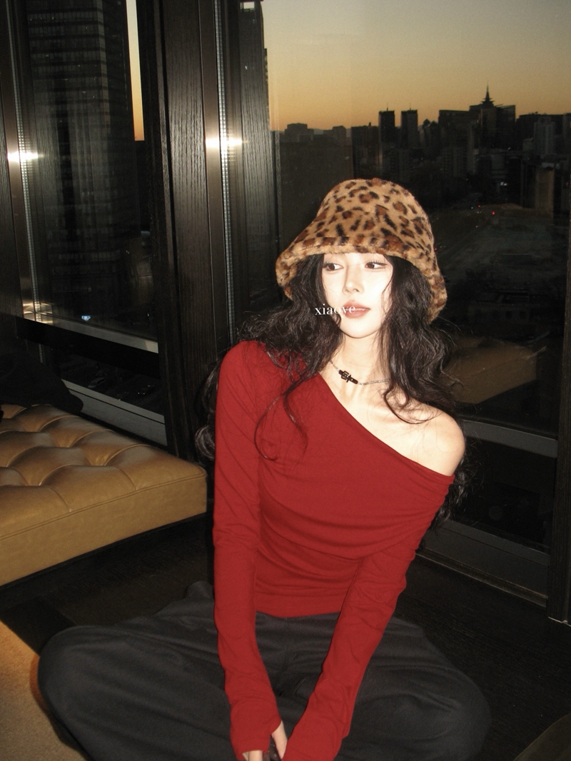 不規則斜肩長袖t恤女秋冬純欲性感一字肩上衣聖誕紅色打底衫內搭