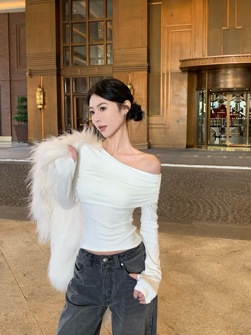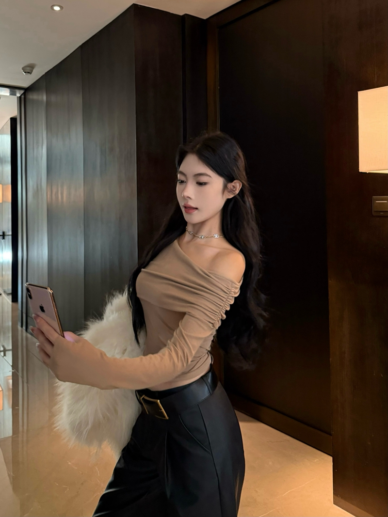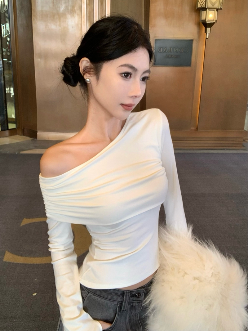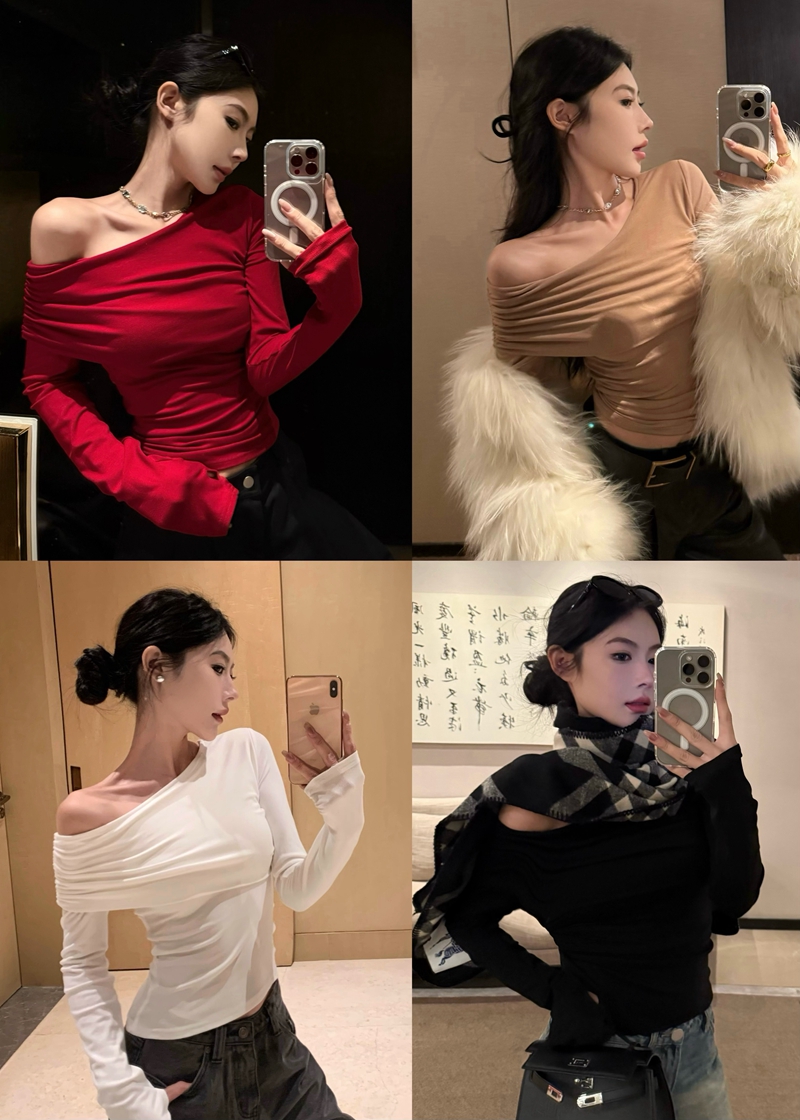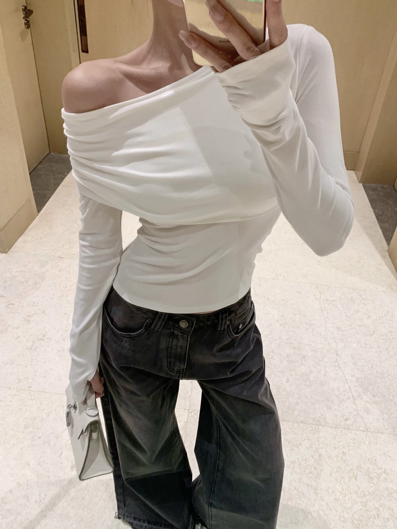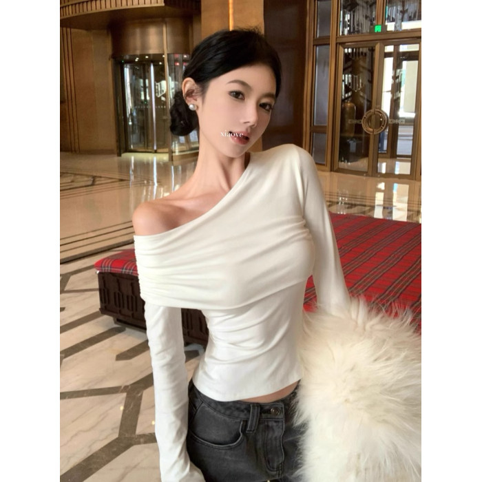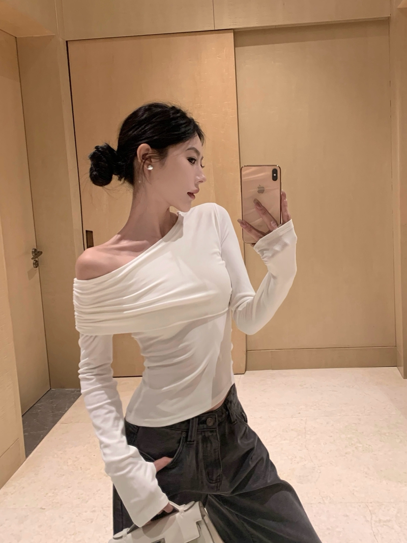 不規則斜肩長袖t恤女秋冬純欲性感一字肩上衣聖誕紅色打底衫內搭