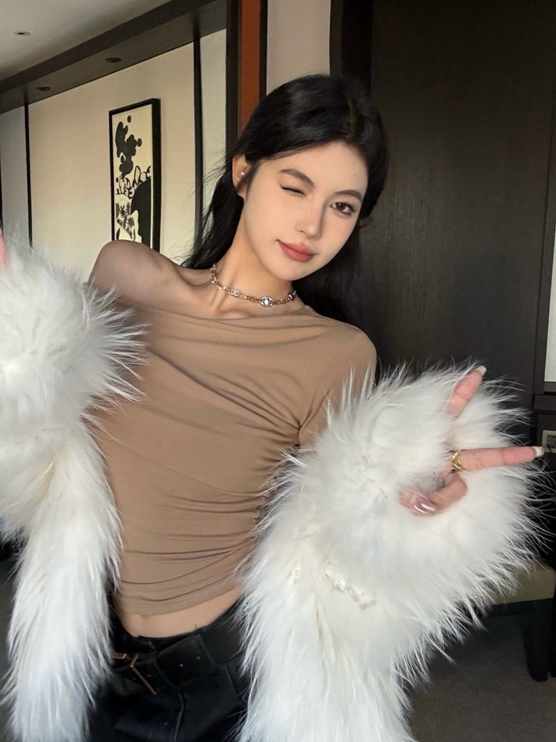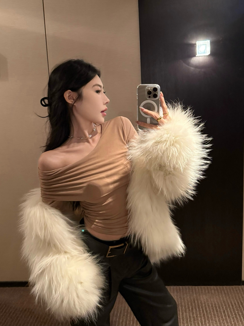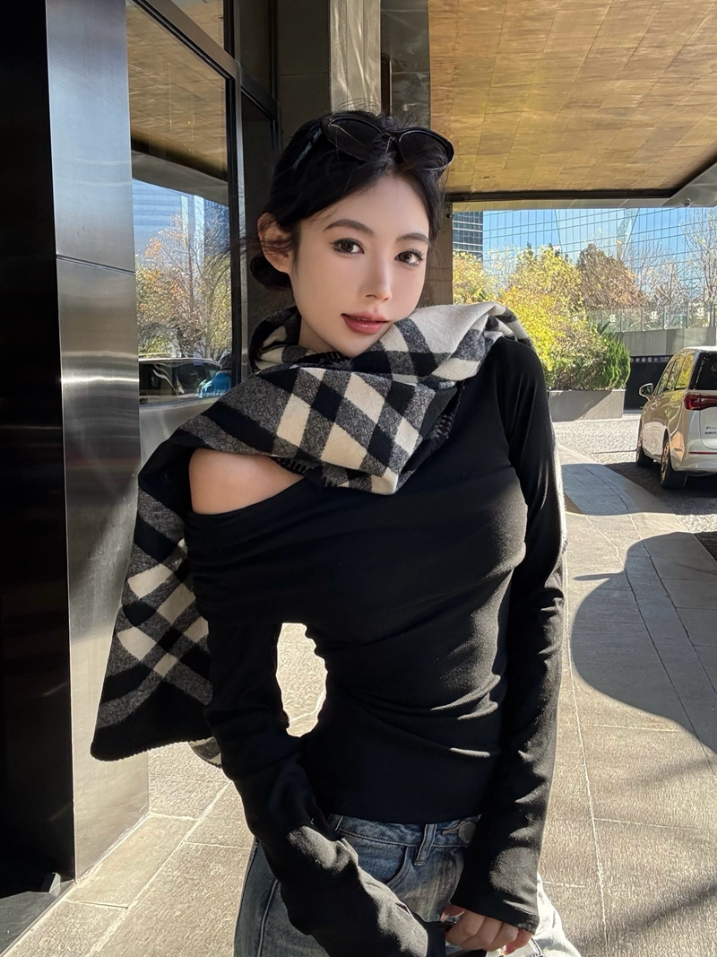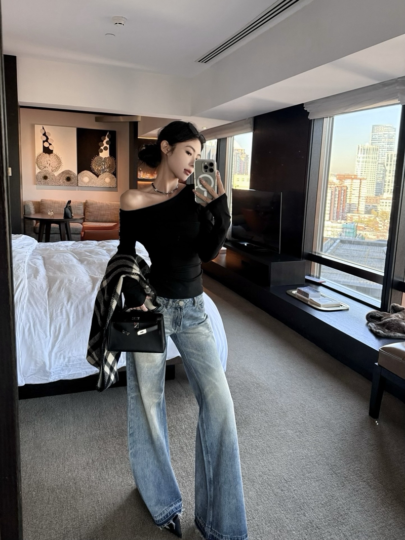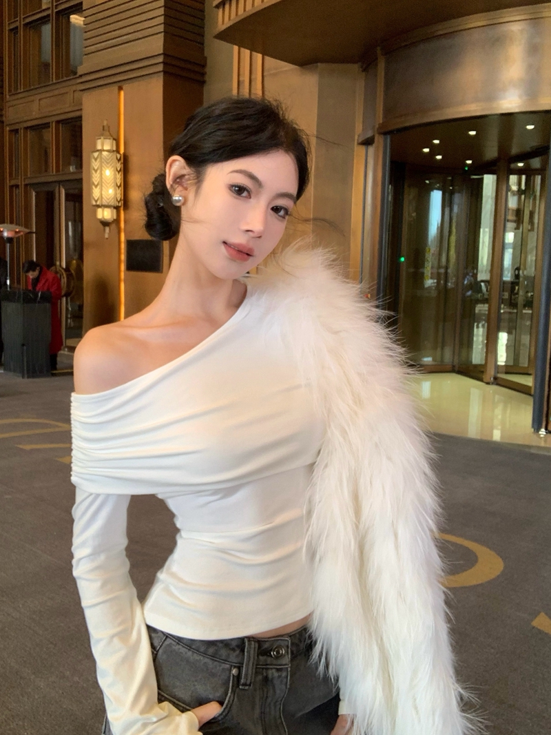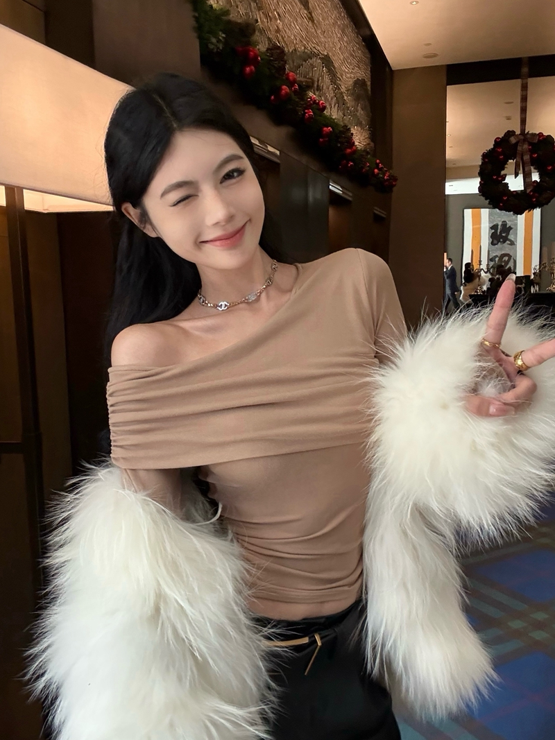 不規則斜肩長袖t恤女秋冬純欲性感一字肩上衣聖誕紅色打底衫內搭