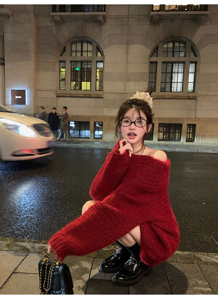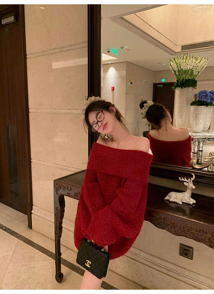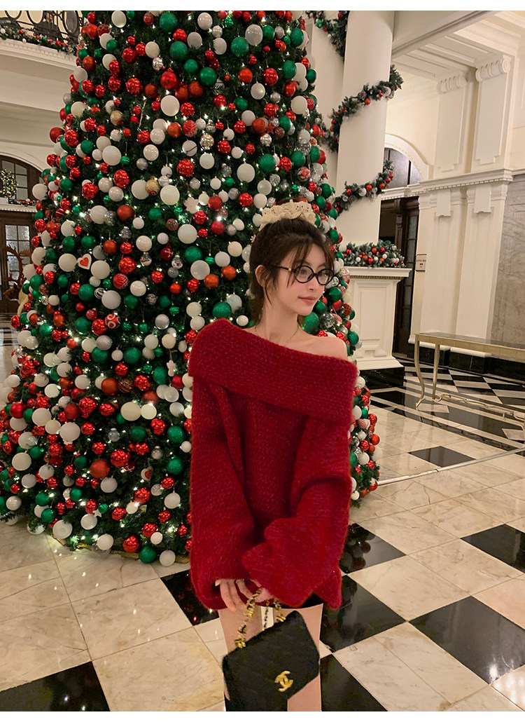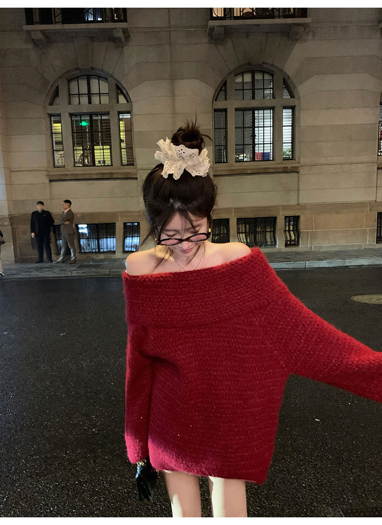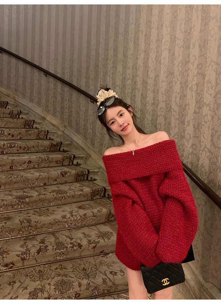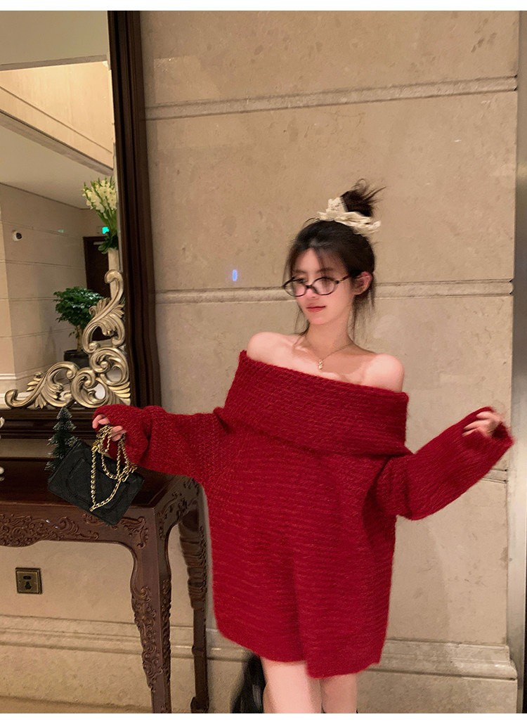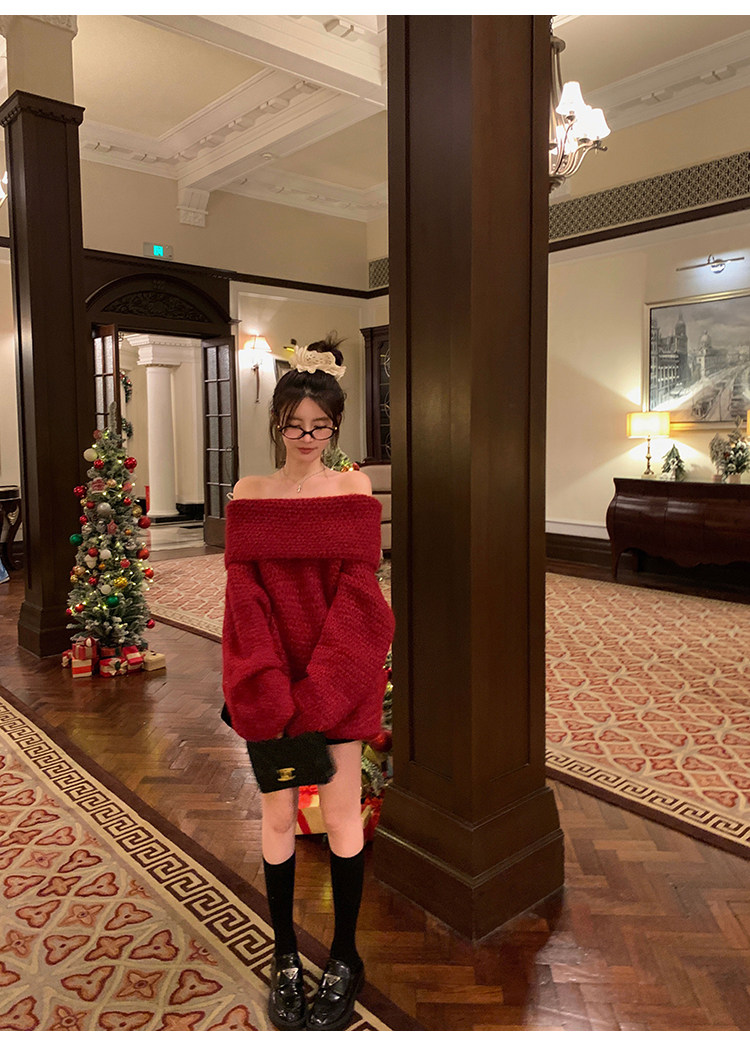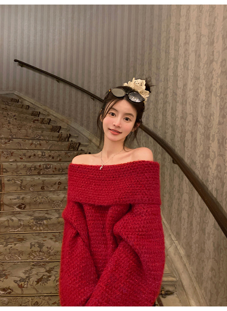 陳大鈺一字肩聖誕紅色中長款針織毛衣女秋冬寬松慵懶穿搭露肩上衣