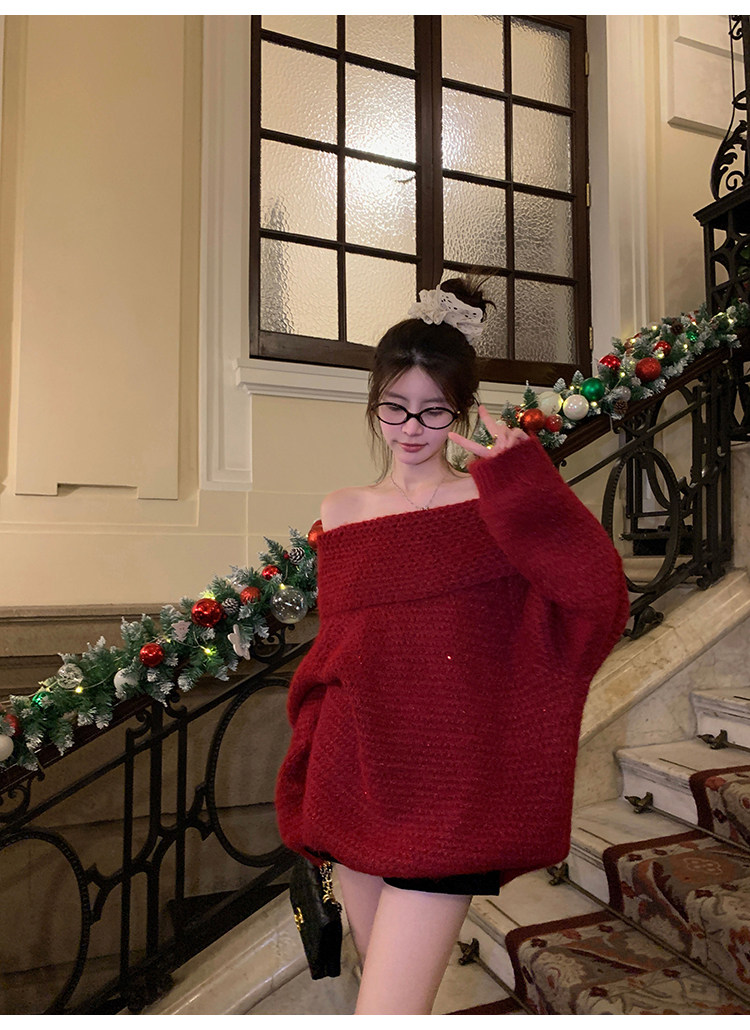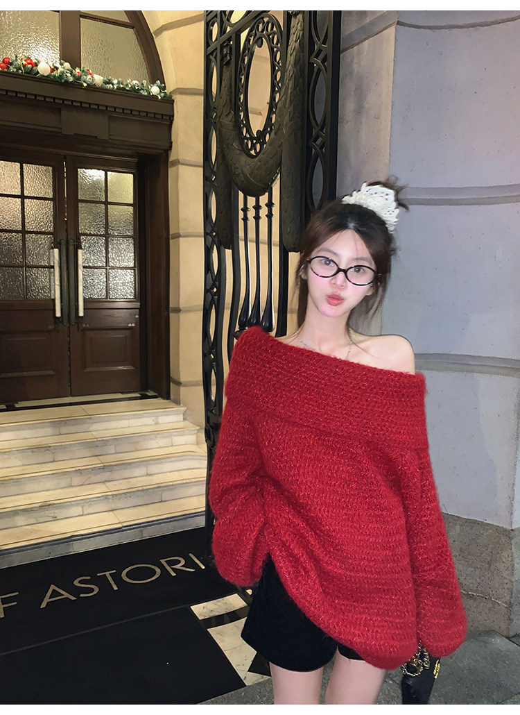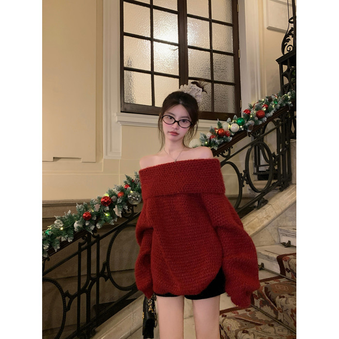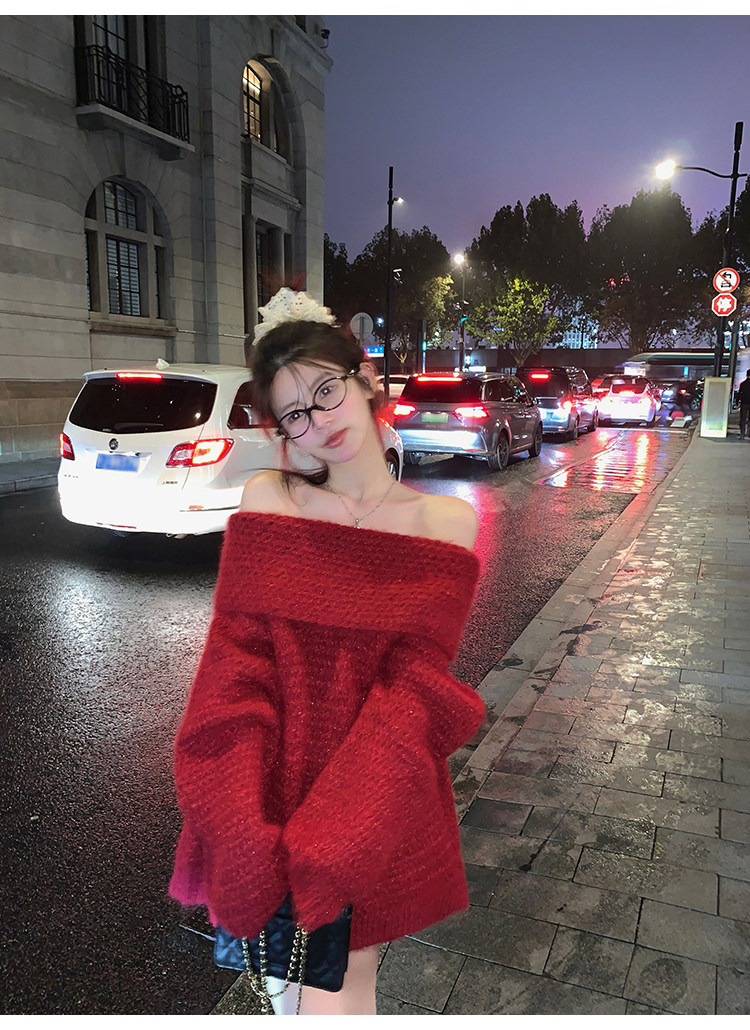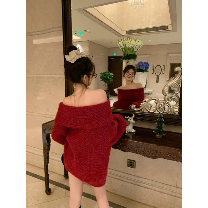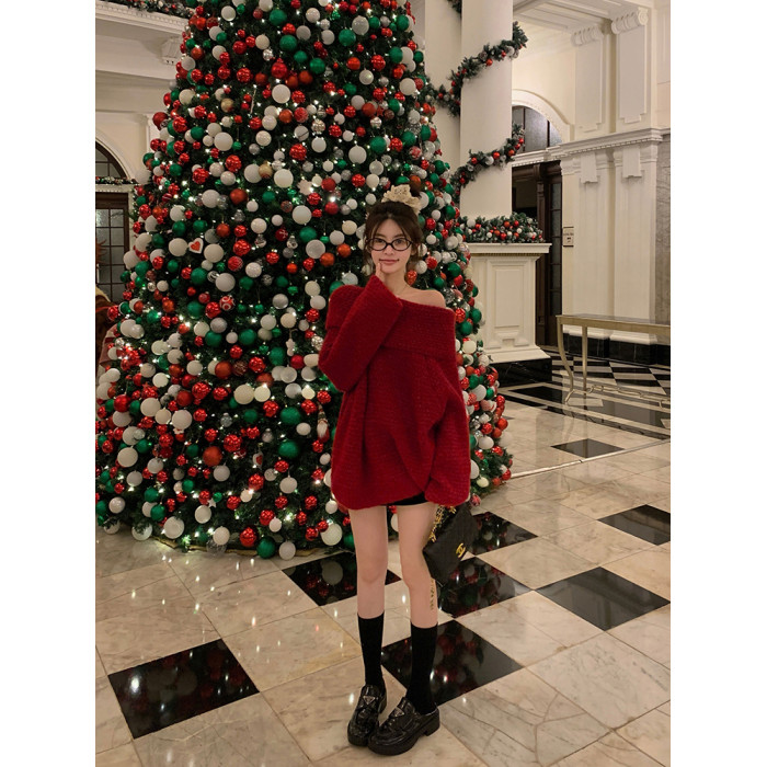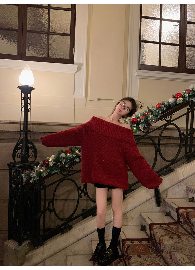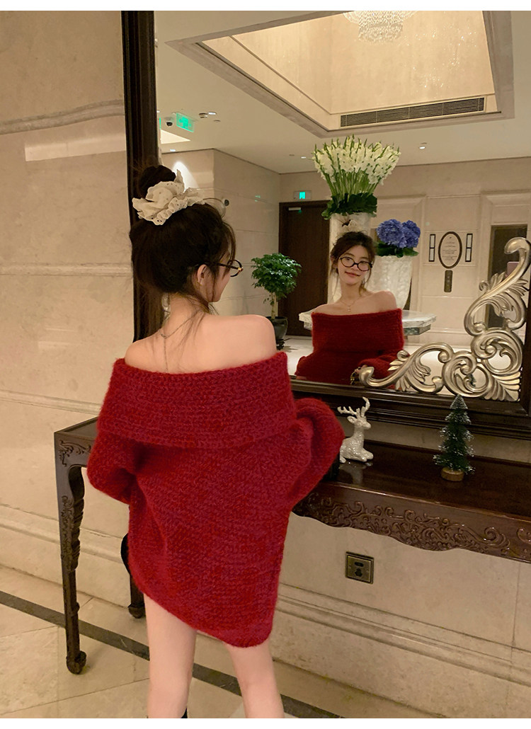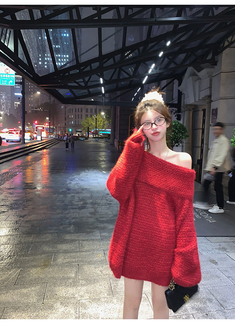 陳大鈺一字肩聖誕紅色中長款針織毛衣女秋冬寬松慵懶穿搭露肩上衣