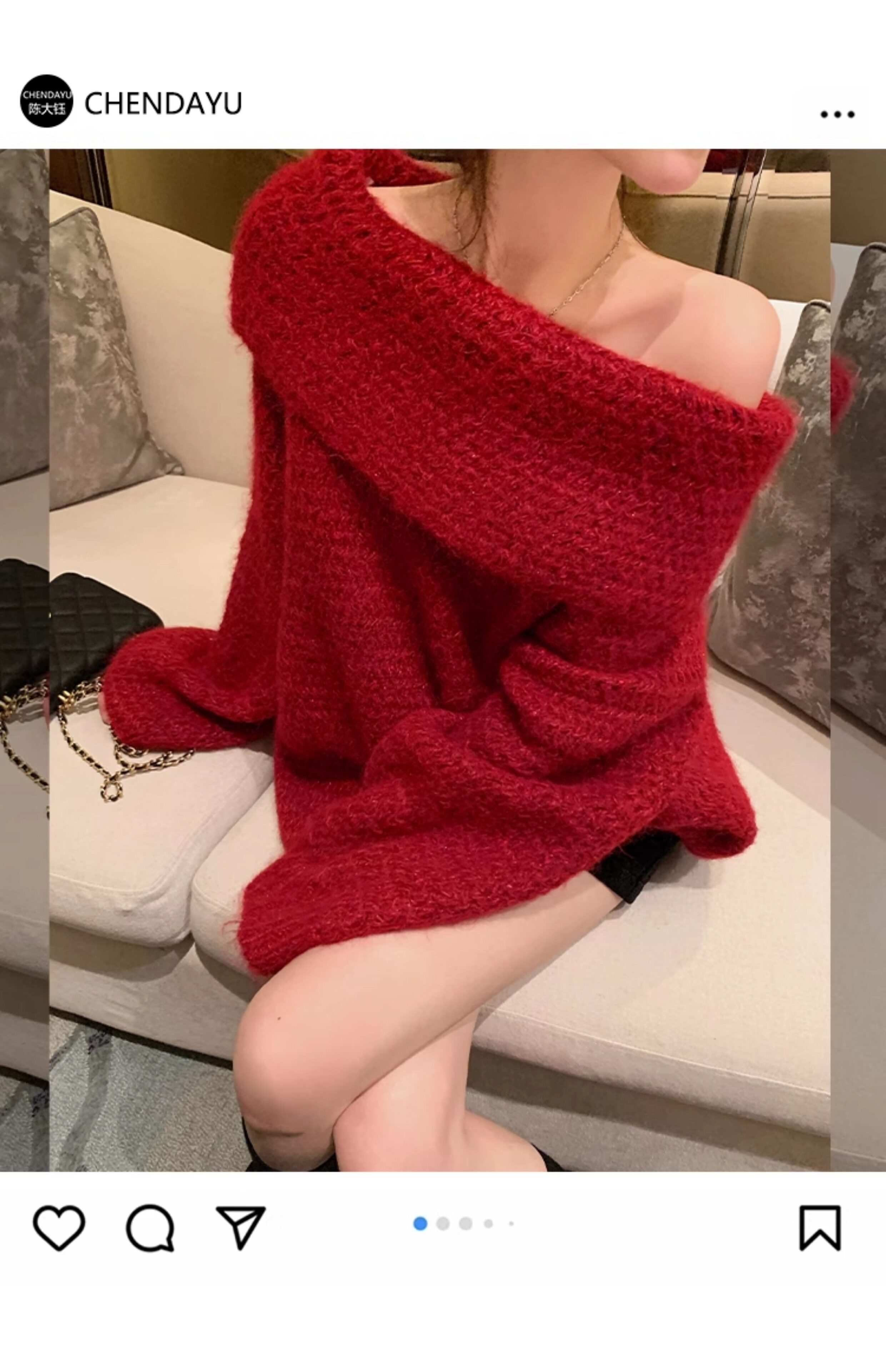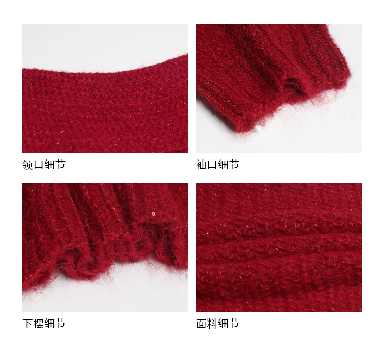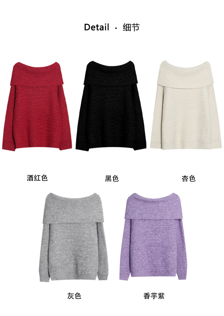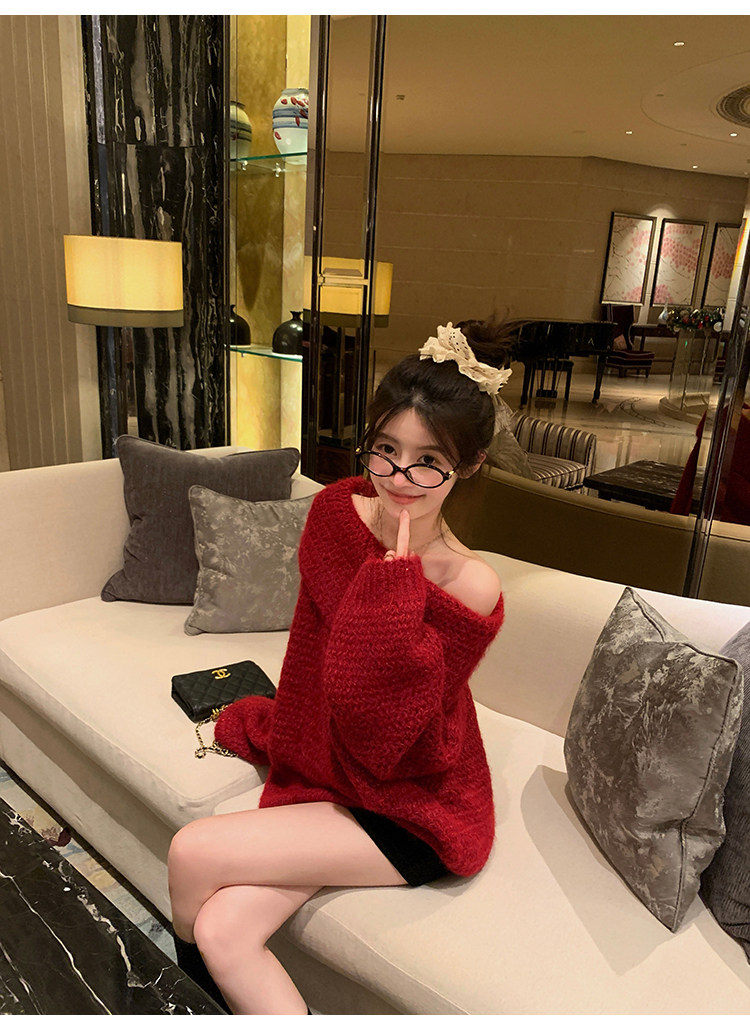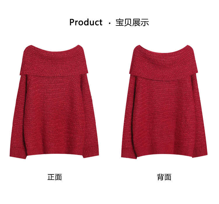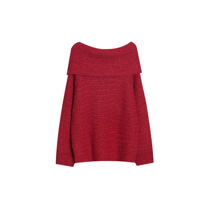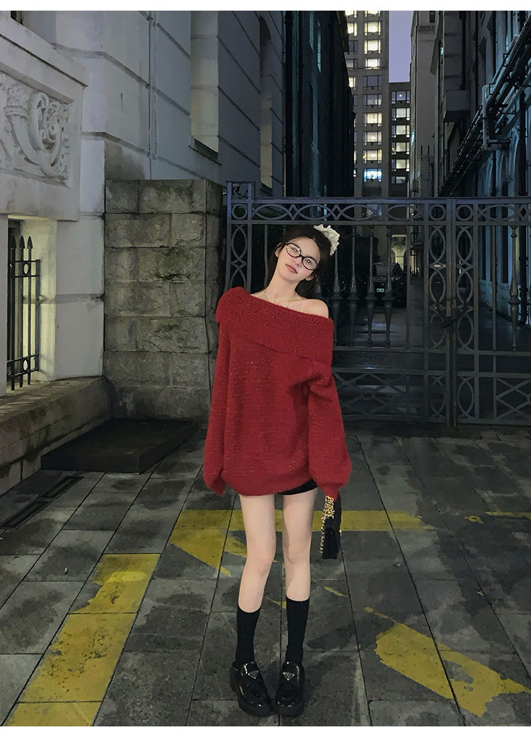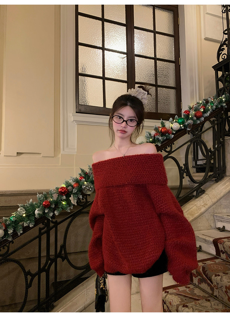 陳大鈺一字肩聖誕紅色中長款針織毛衣女秋冬寬松慵懶穿搭露肩上衣