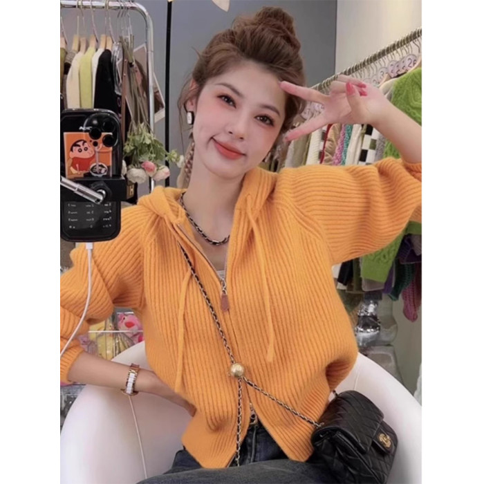 聖誕紅色連帽雙拉鍊針織開衫女秋冬高級感加厚上衣慵懶風毛衣外套