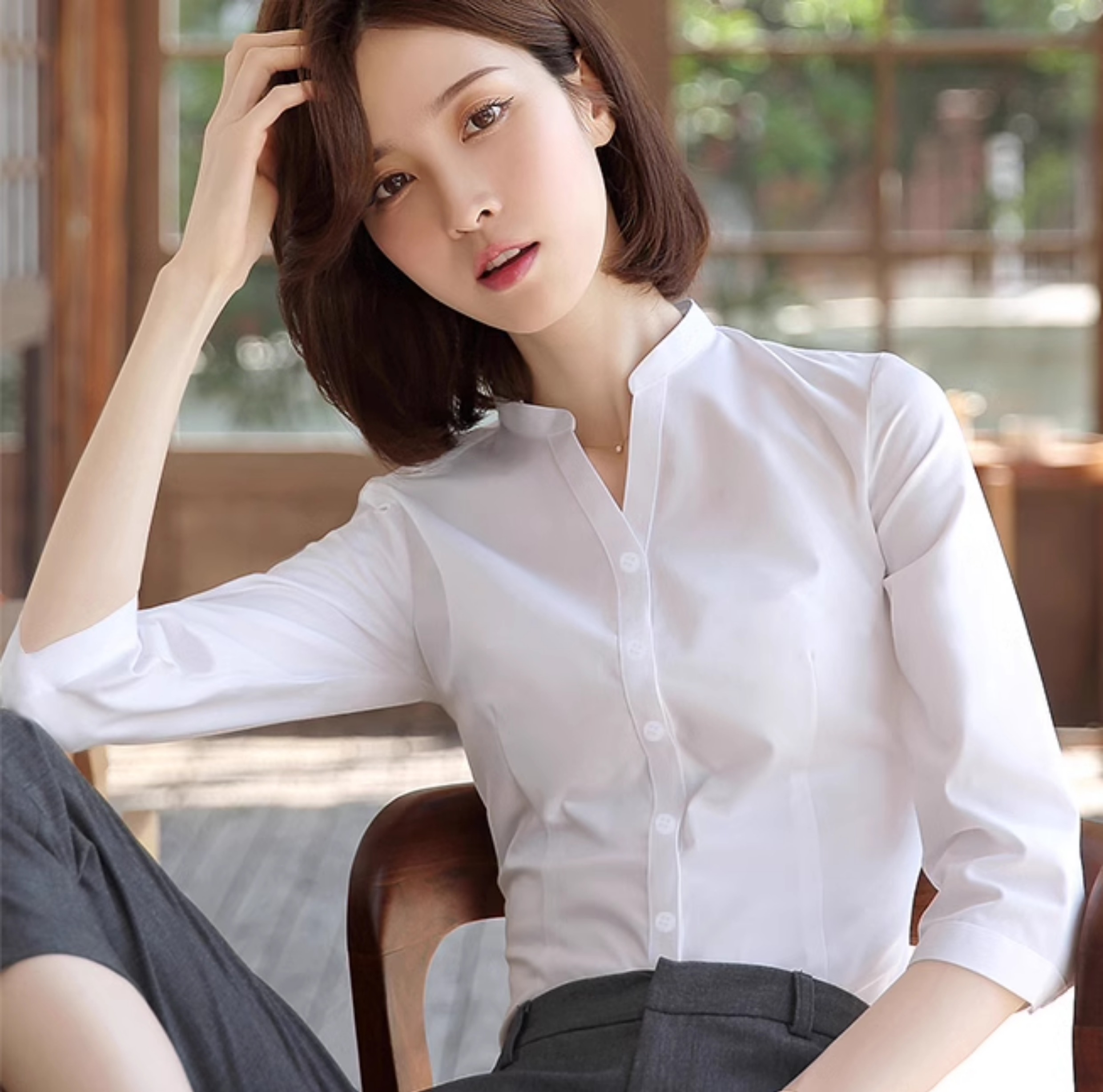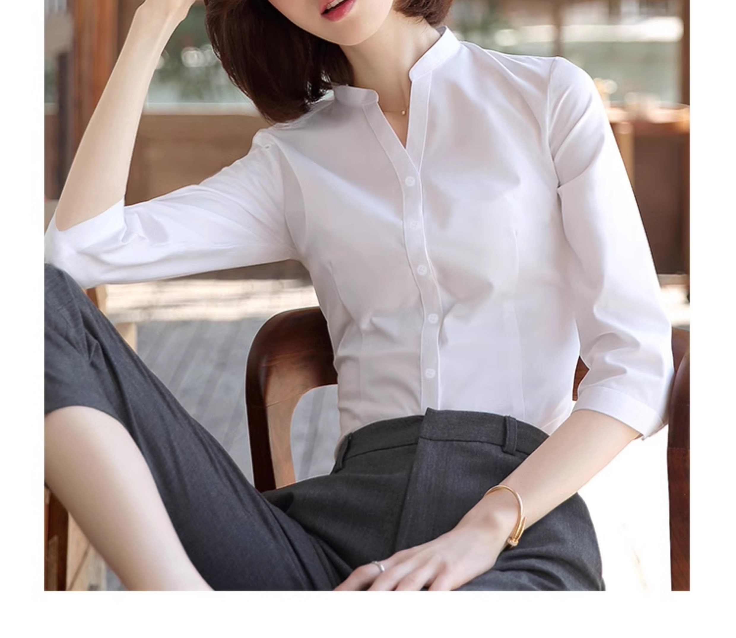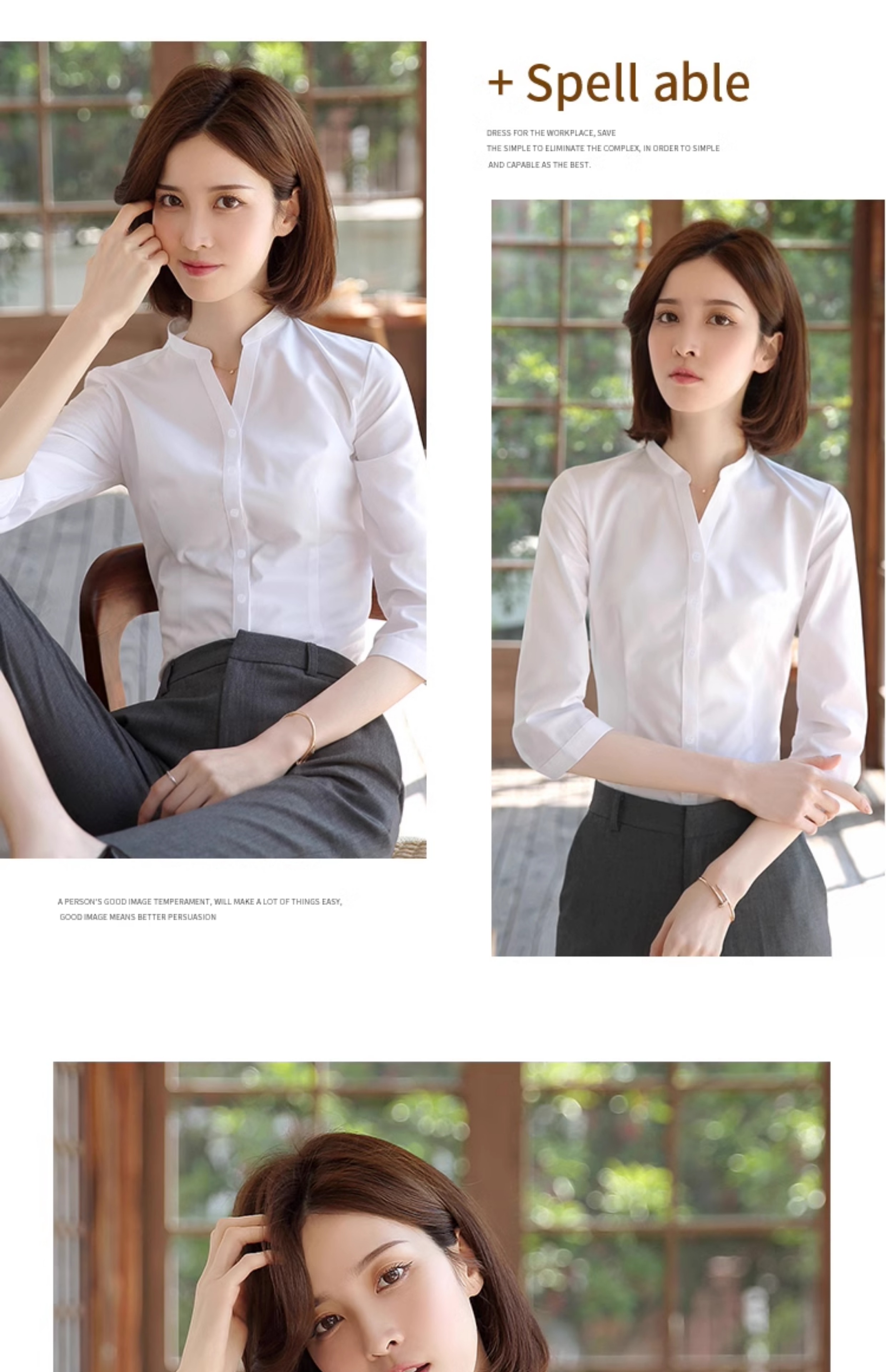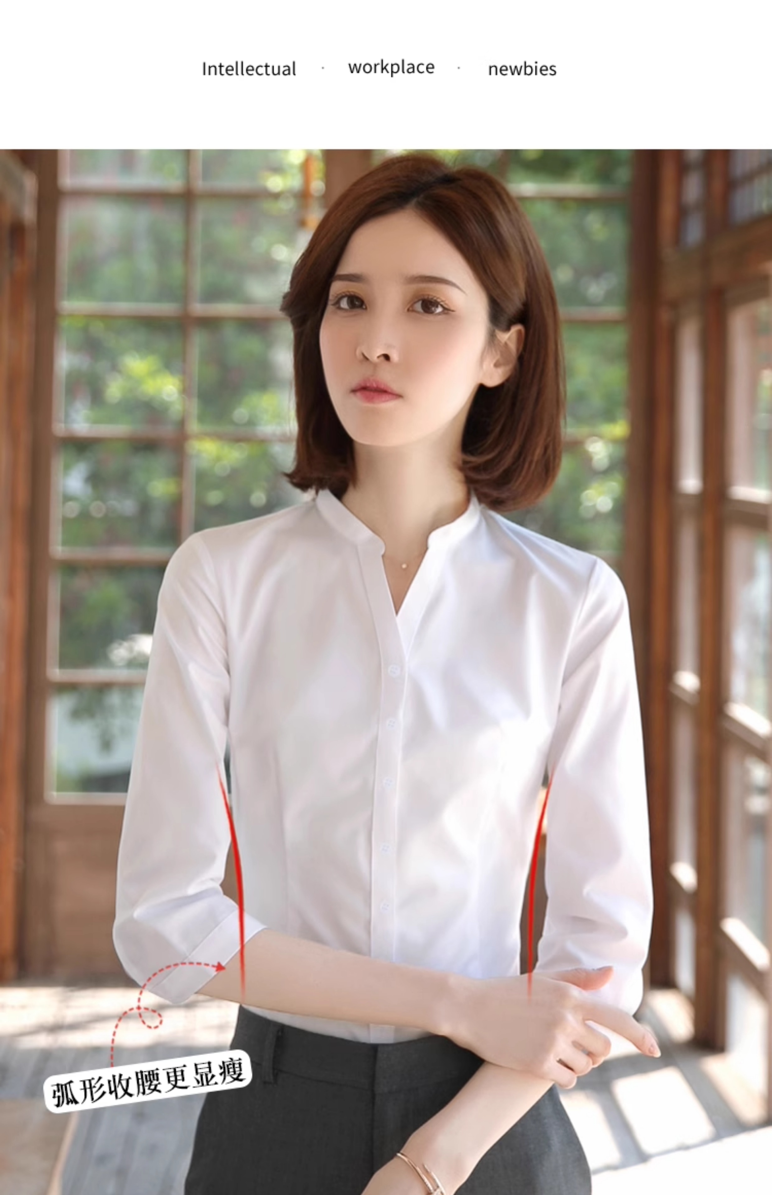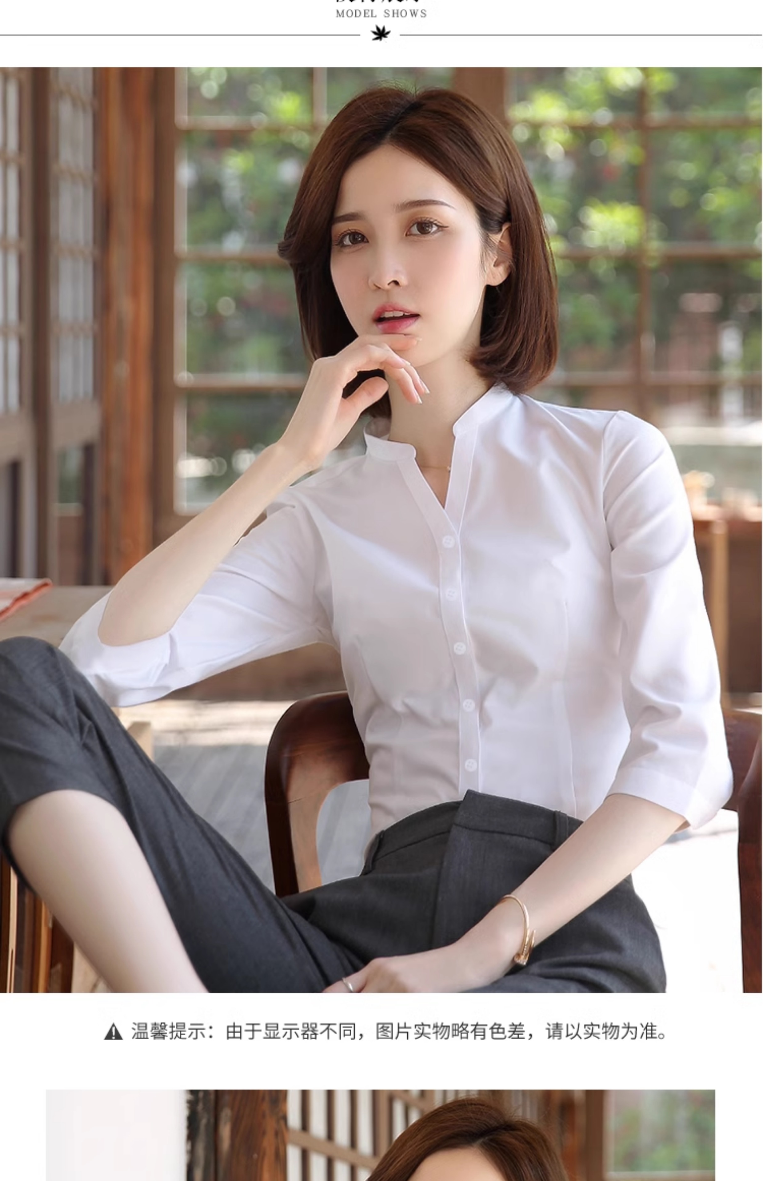 v領白襯衫女職業正裝夏季七分袖通勤修身立領襯衣大碼4S店工作服