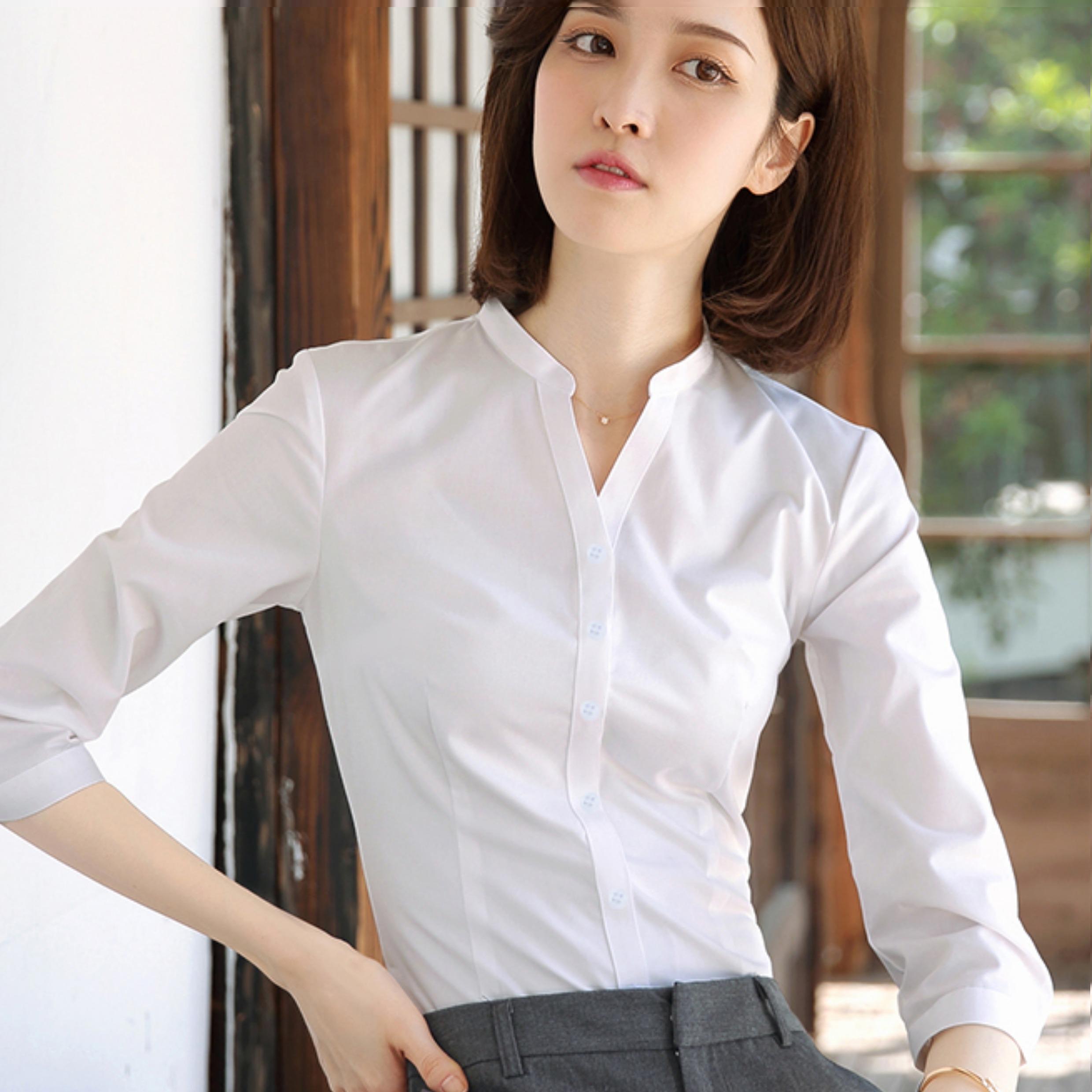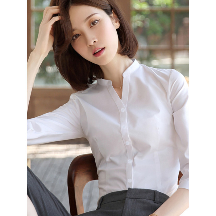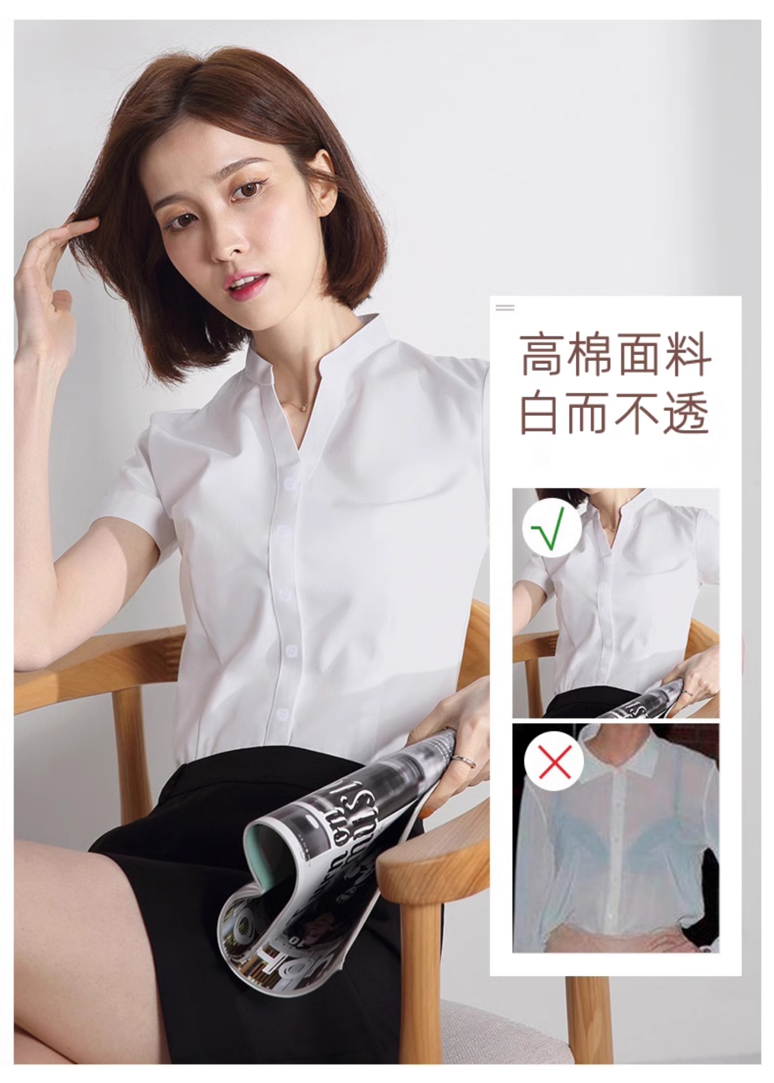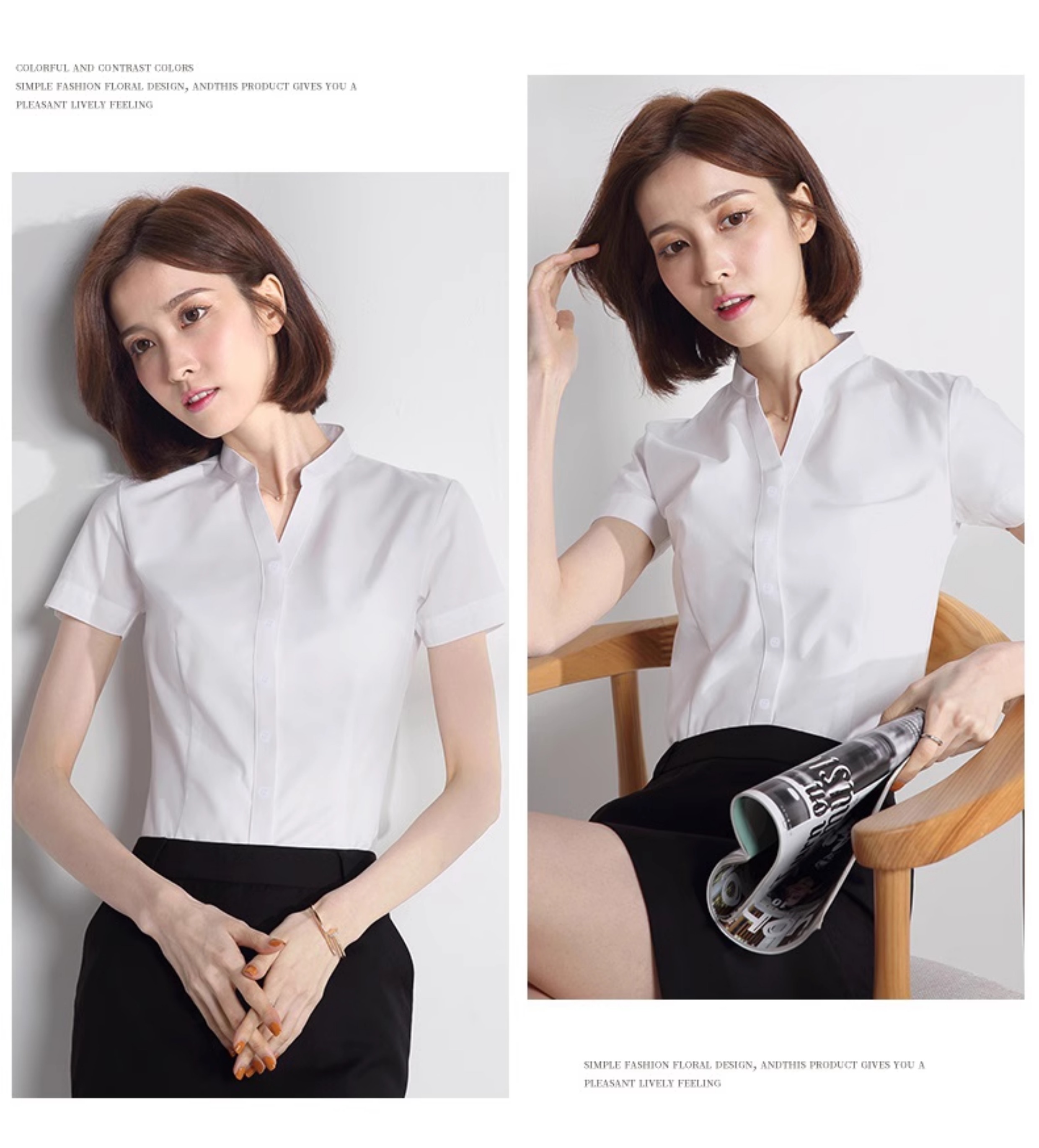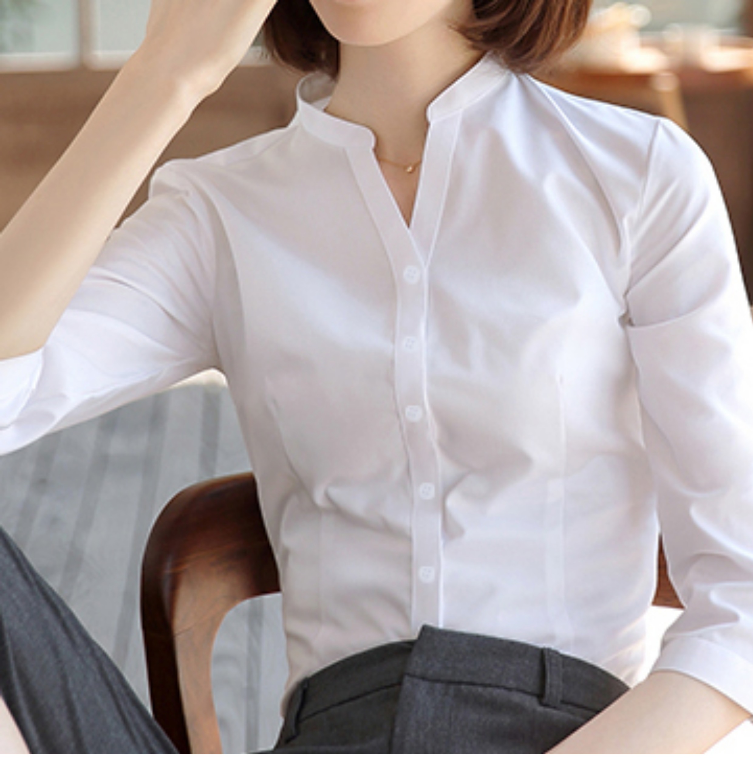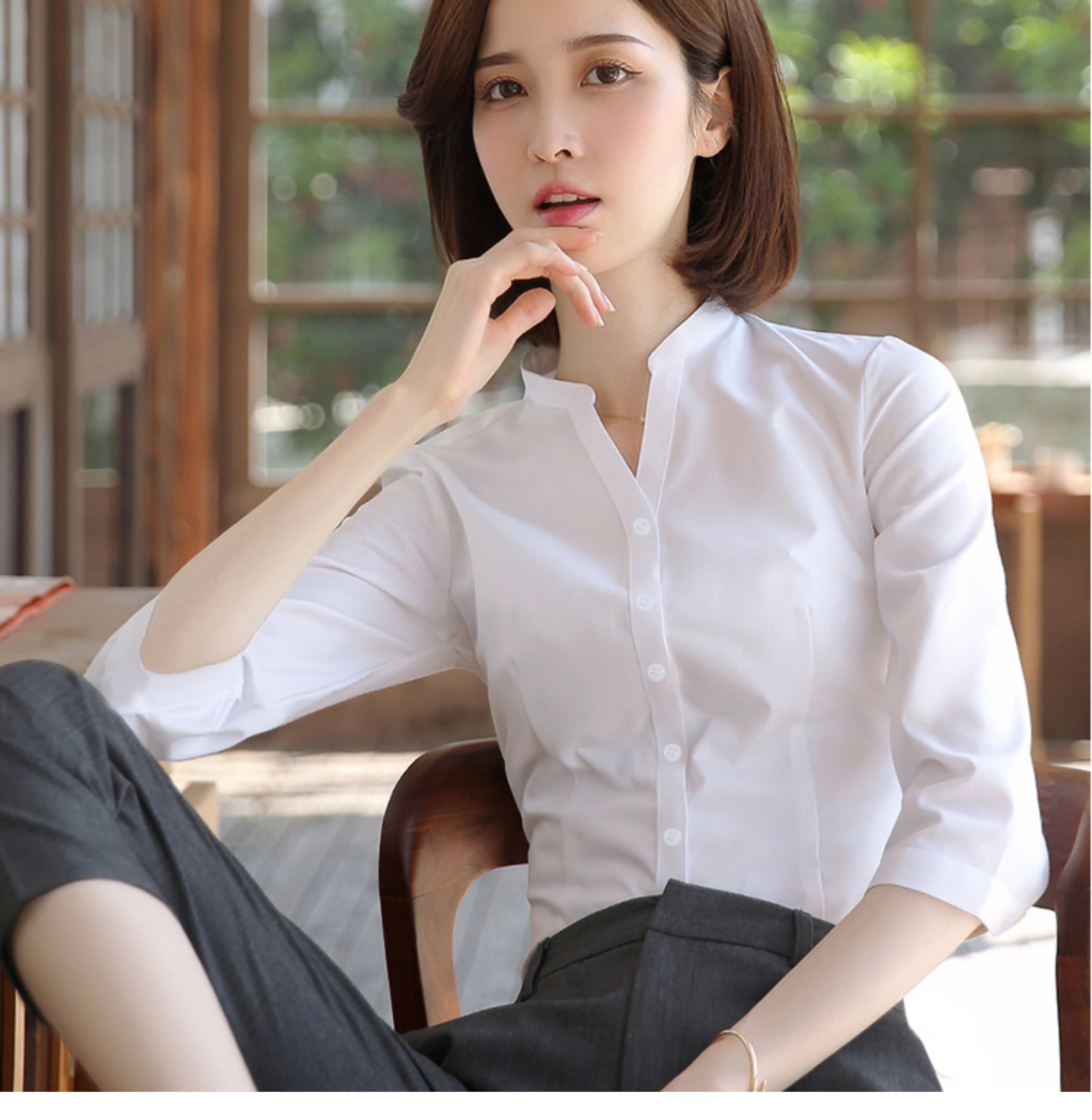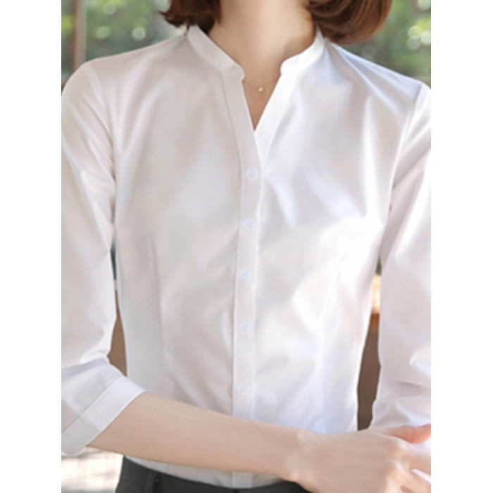 v領白襯衫女職業正裝夏季七分袖通勤修身立領襯衣大碼4S店工作服
