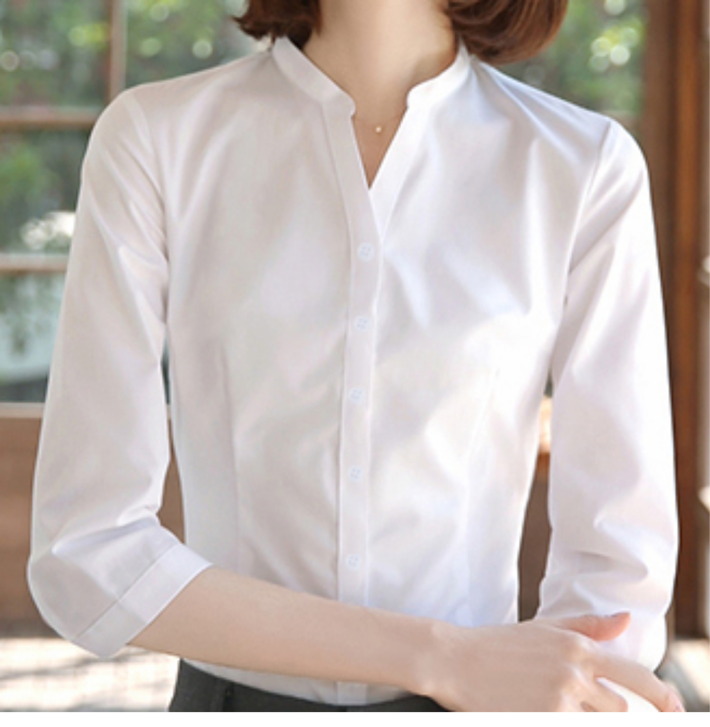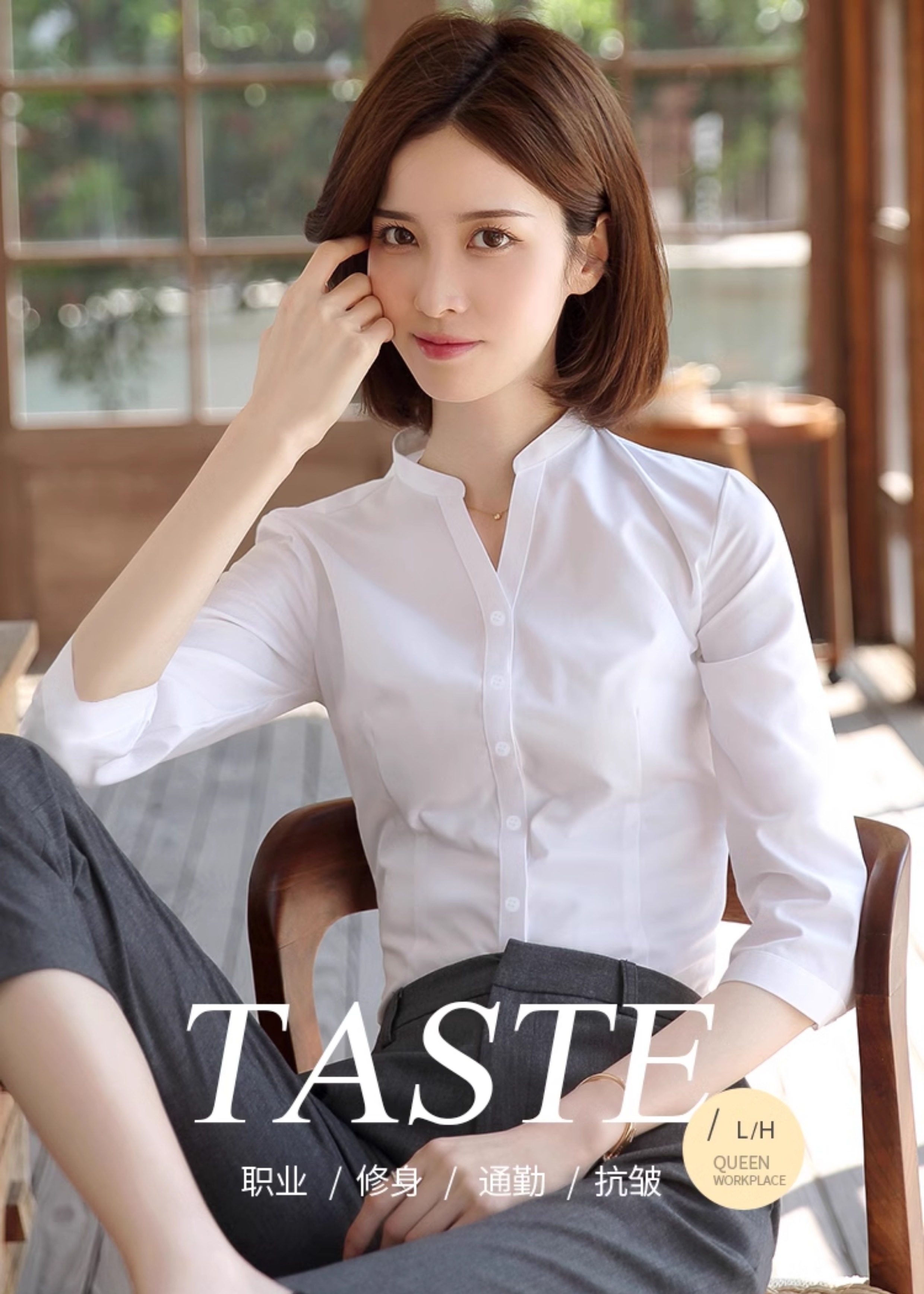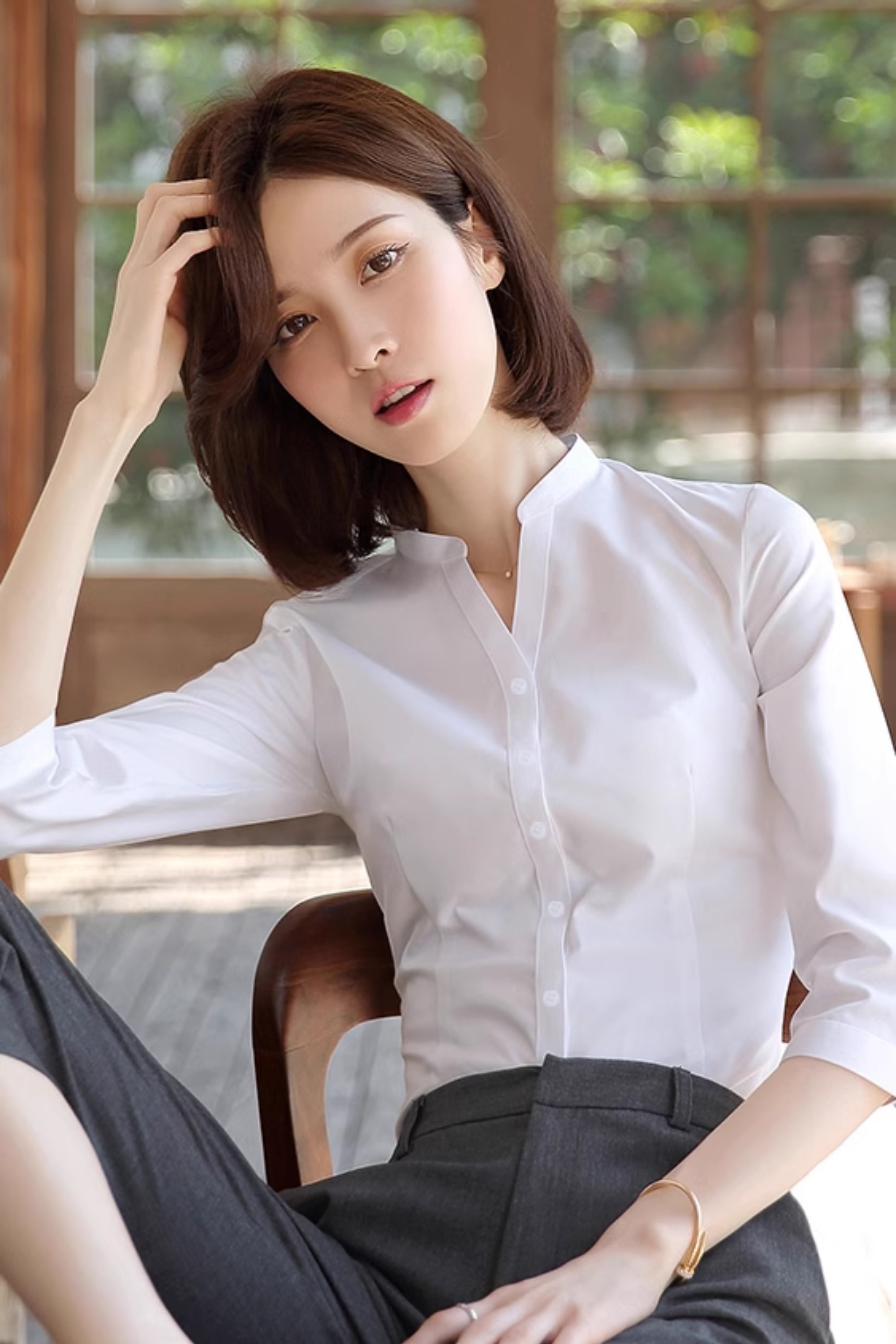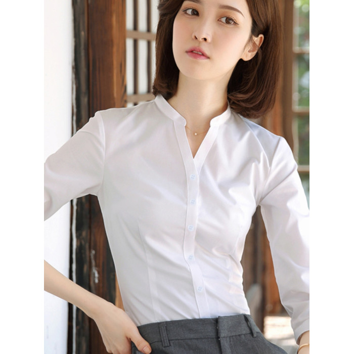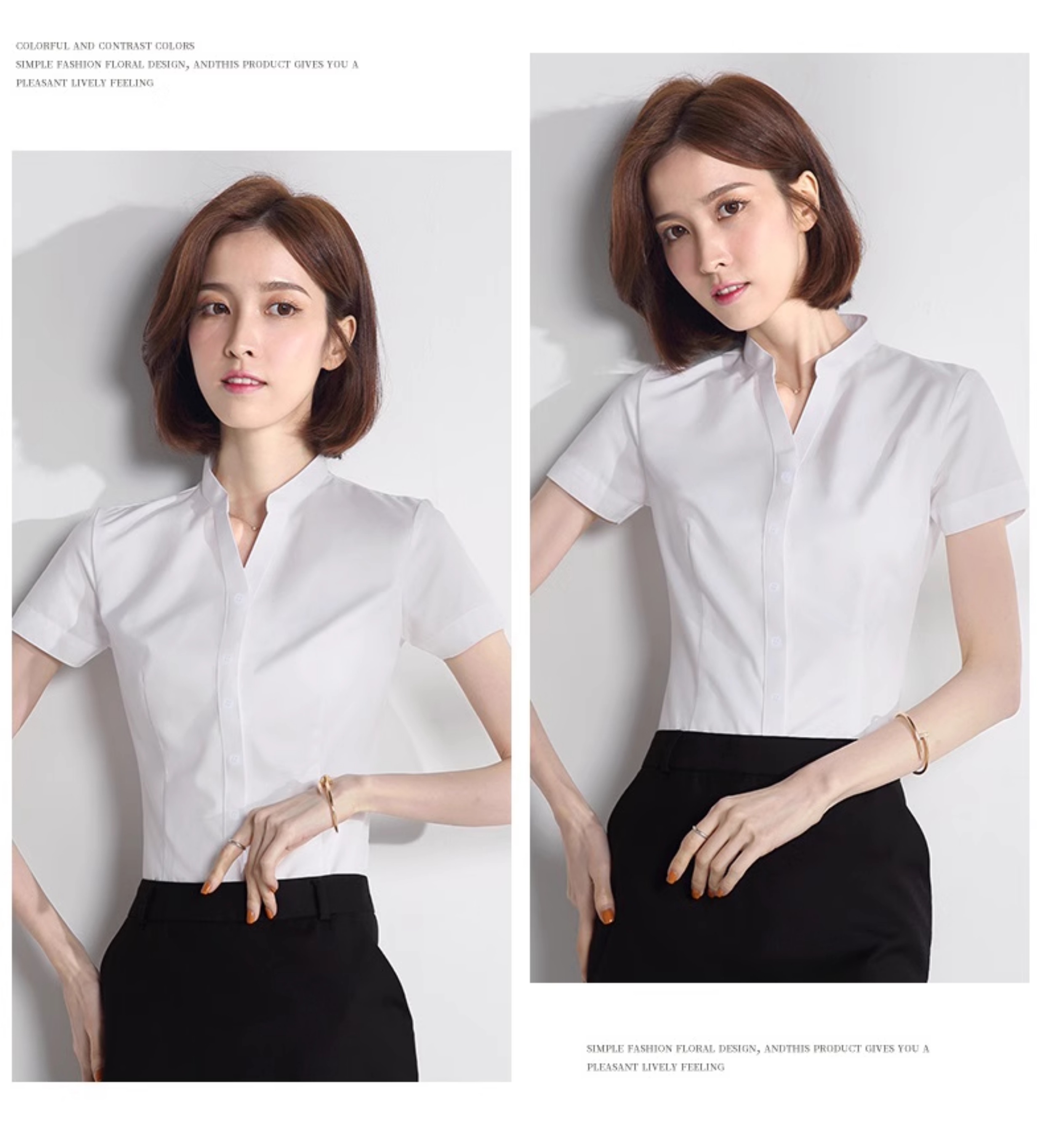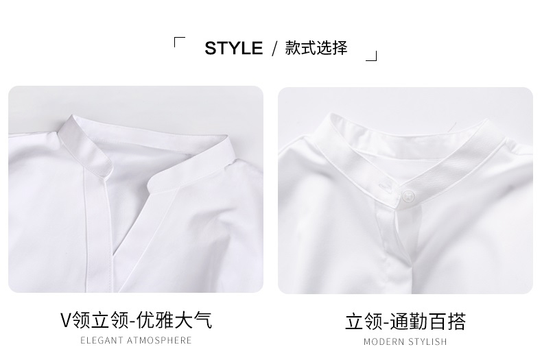 v領白襯衫女職業正裝夏季七分袖通勤修身立領襯衣大碼4S店工作服
