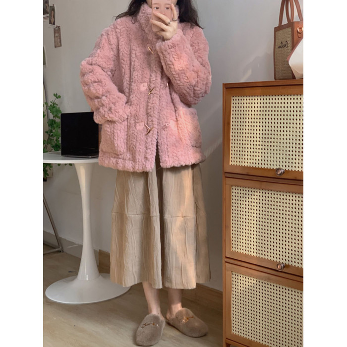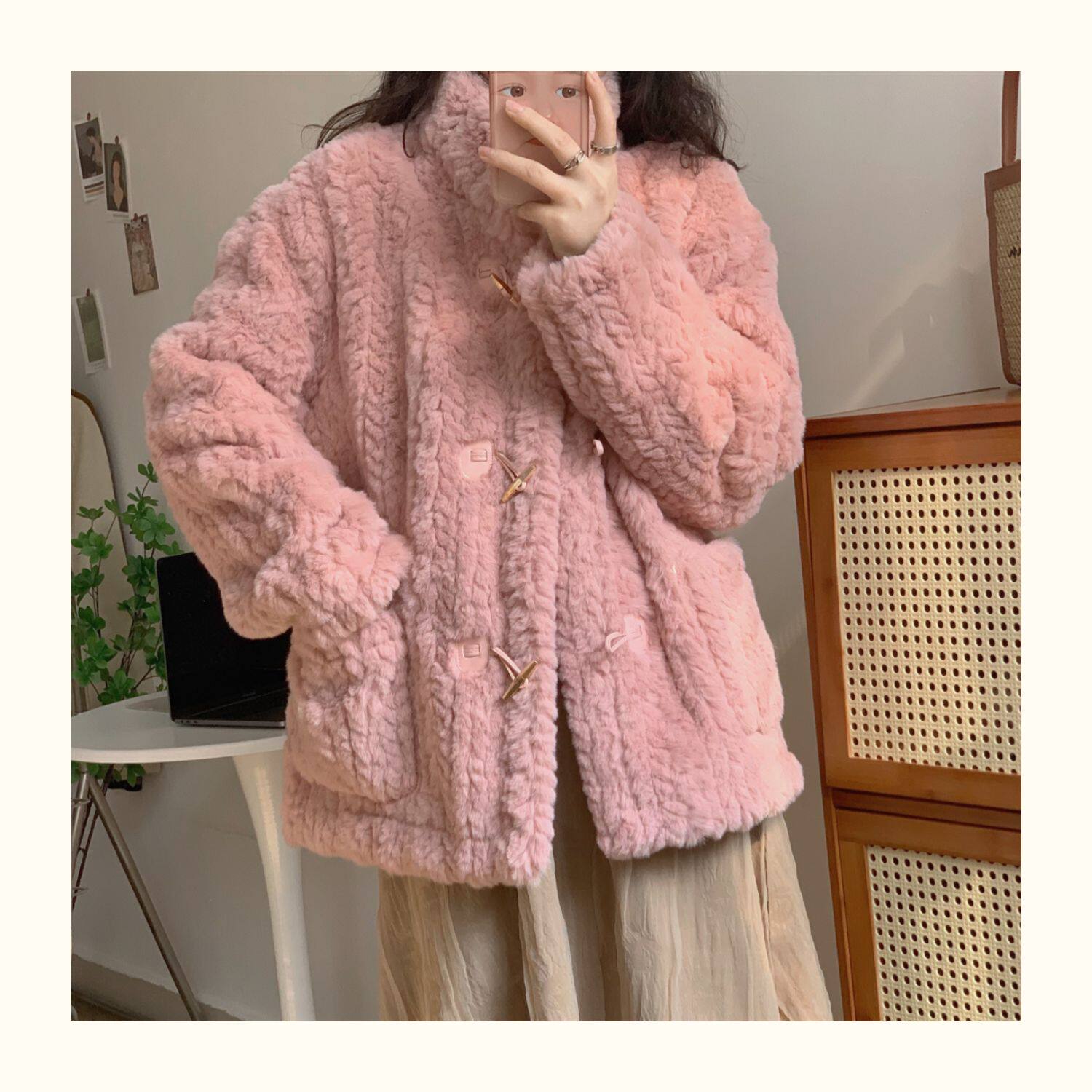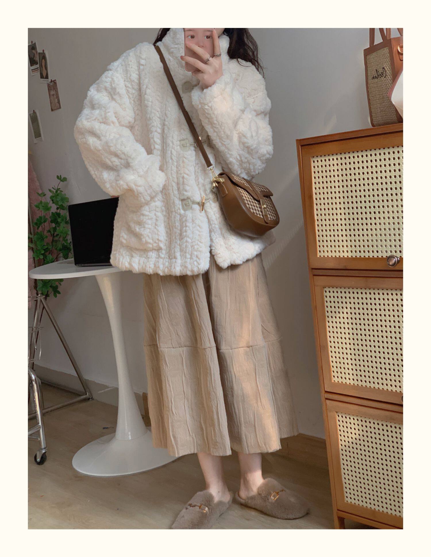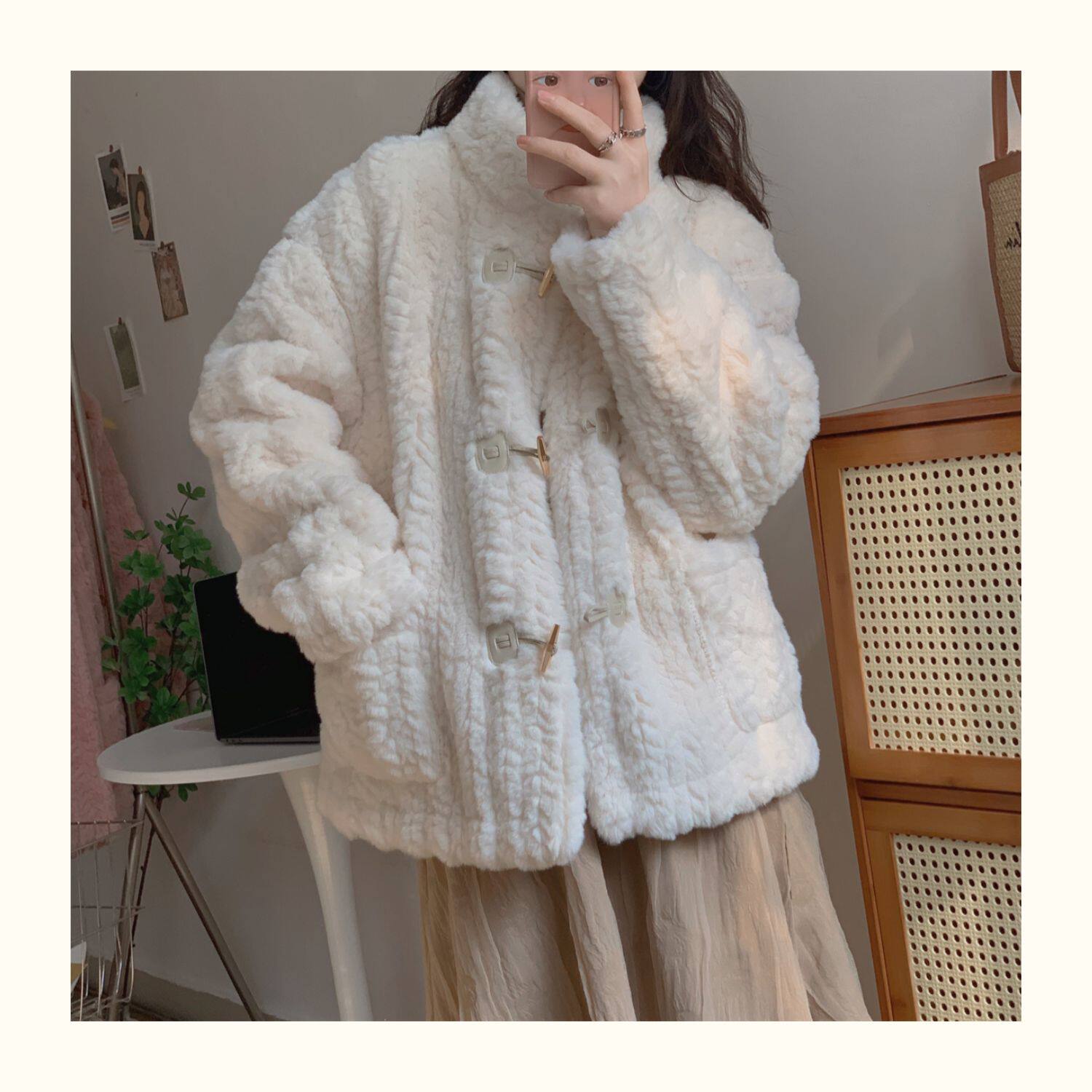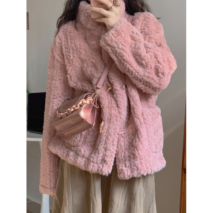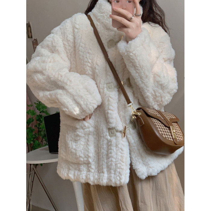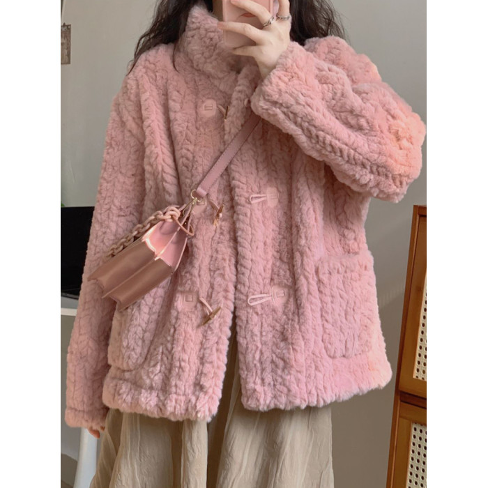 短款小香風牛角釦冬季羊羔毛絨絨外套女2024年新款小個子百搭棉服