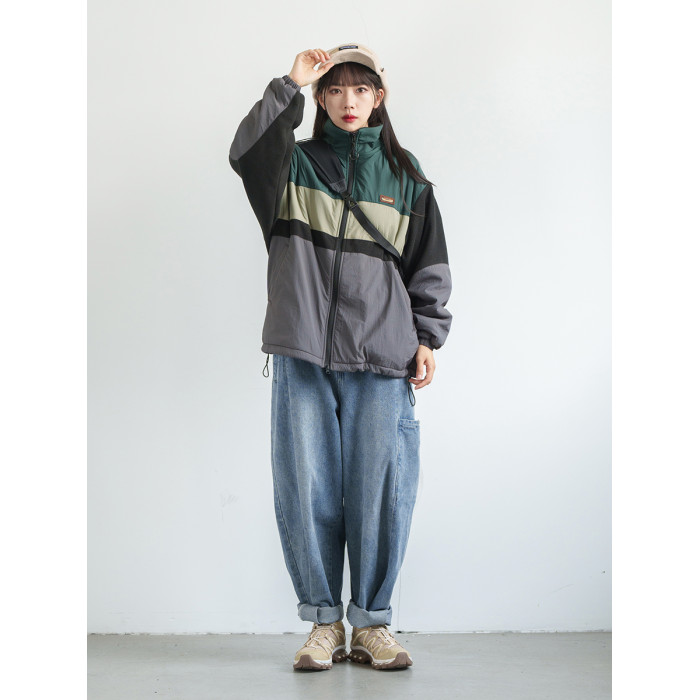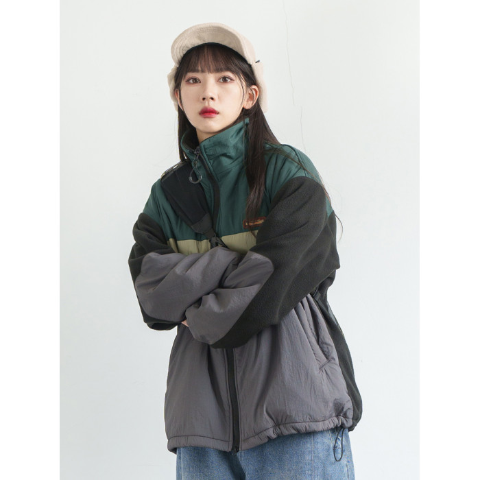 RCDB日系復古拼色寬條紋立領搖粒絨工裝棉衣男女中性寬松學生棉服