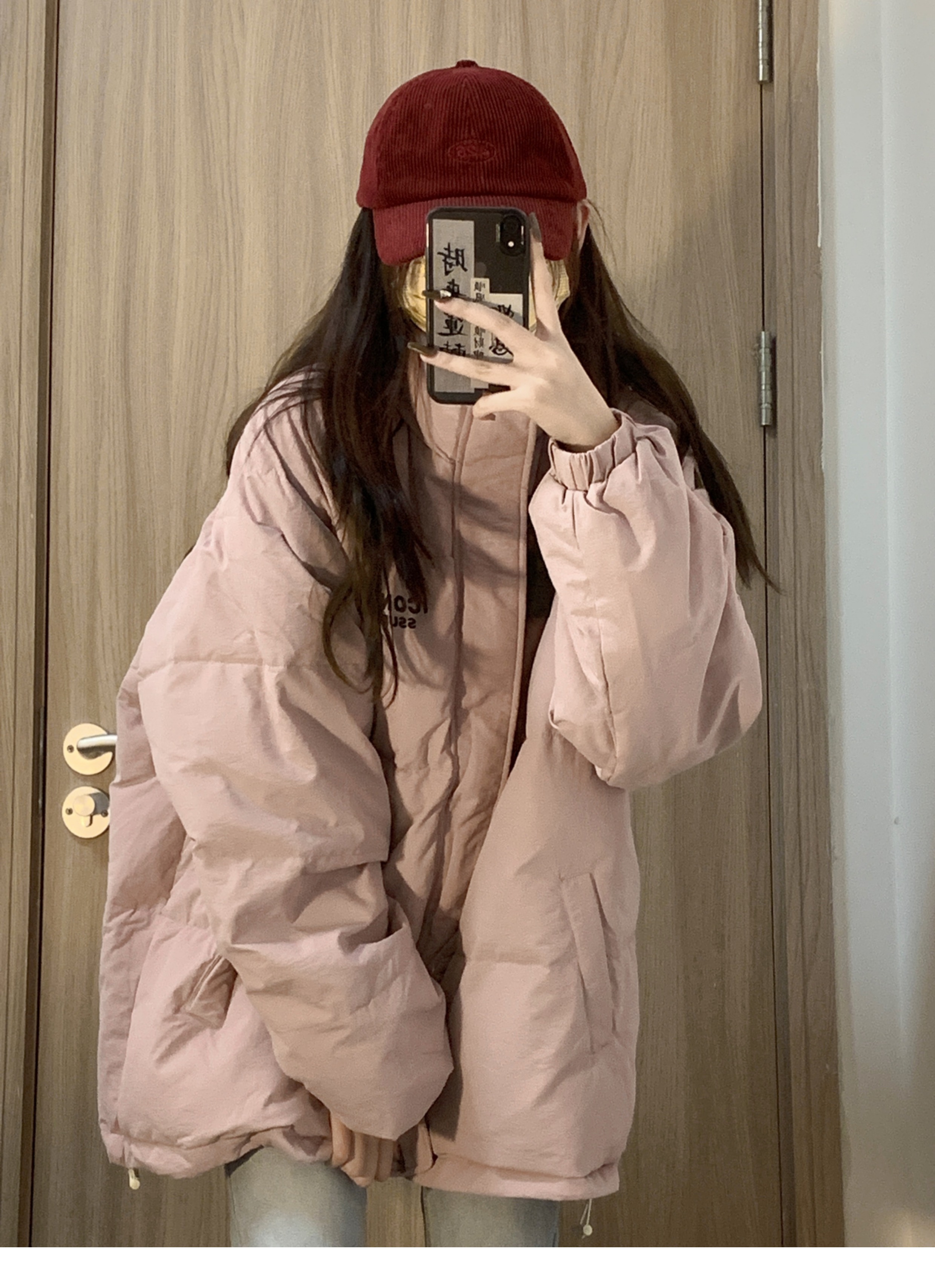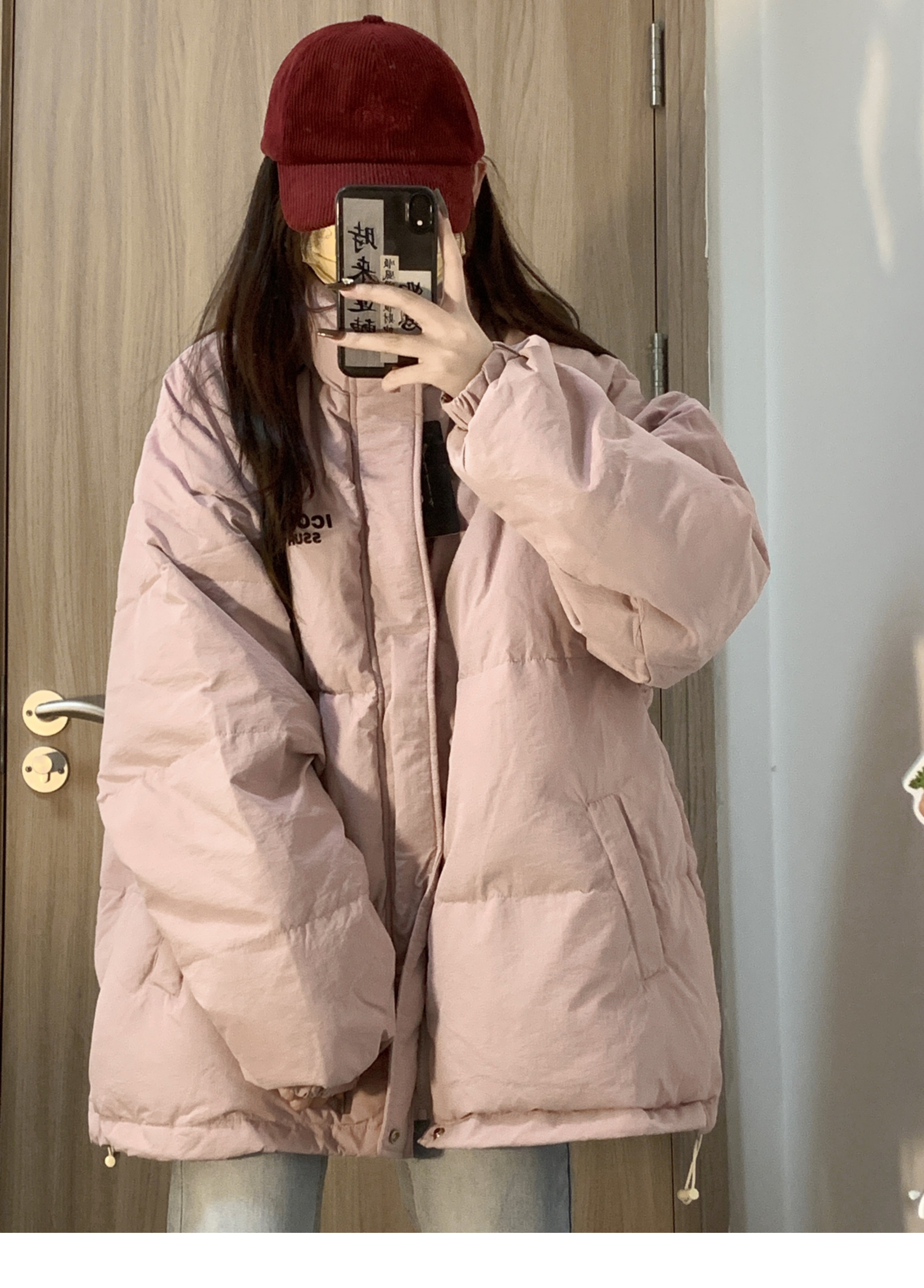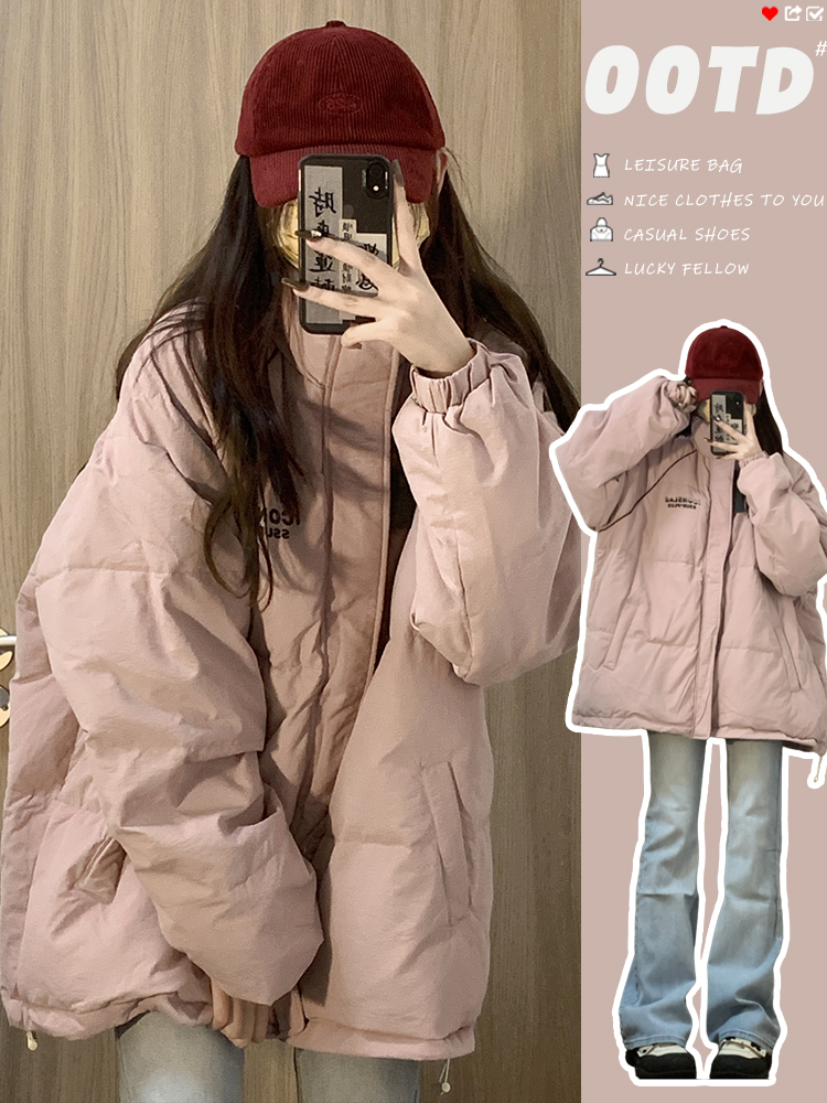 學院風粉色保暖字母印花立領麵包服棉衣外套女冬季ins加厚棉服潮