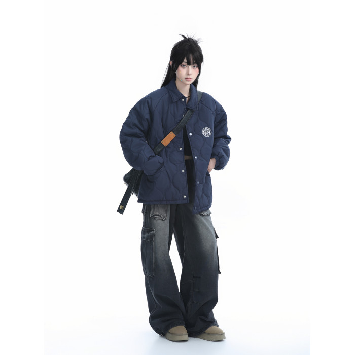 【坐吃山空】美式復古刺綉翻領棉服外套女冬季加厚保暖寬松棉衣潮