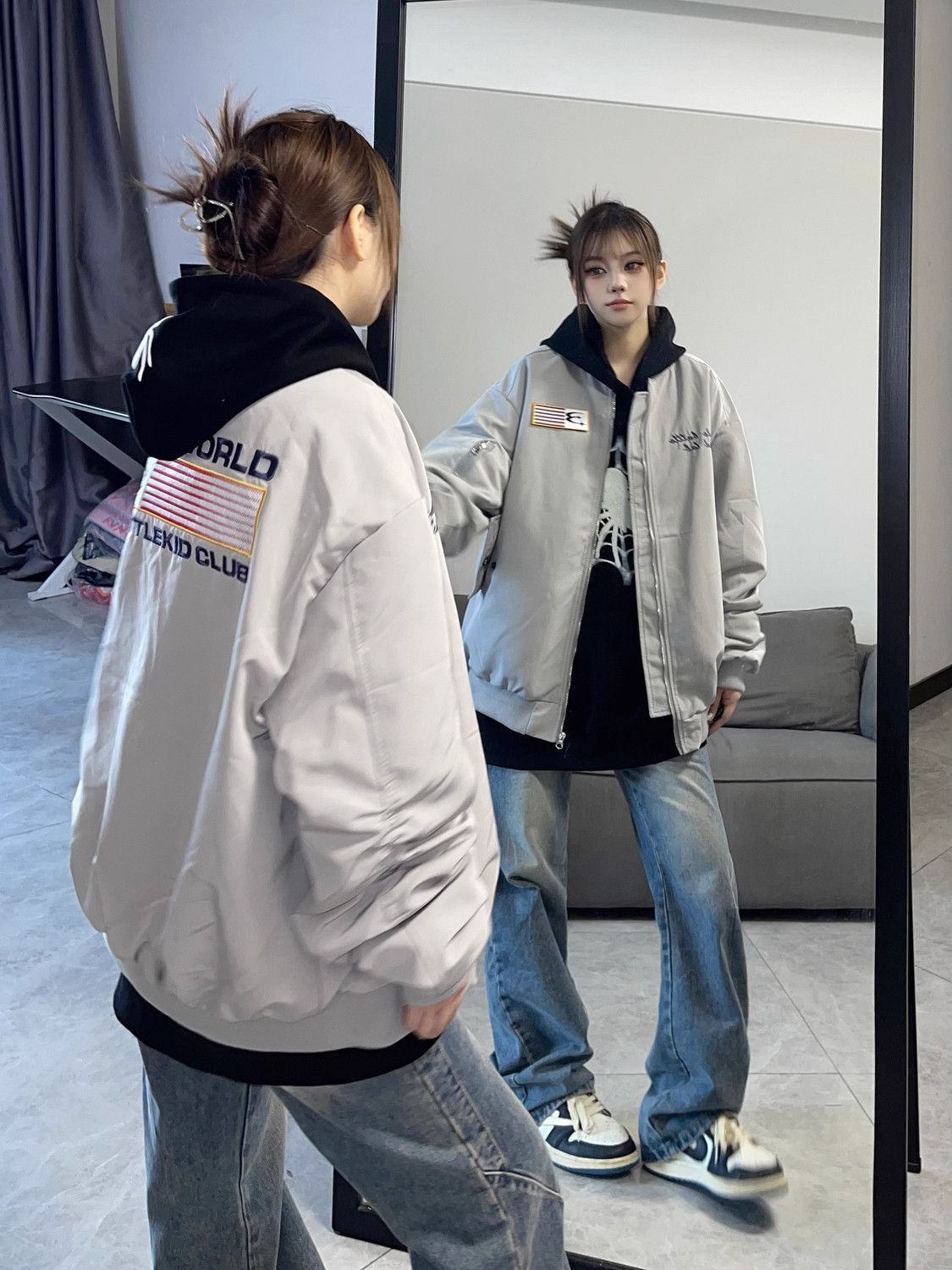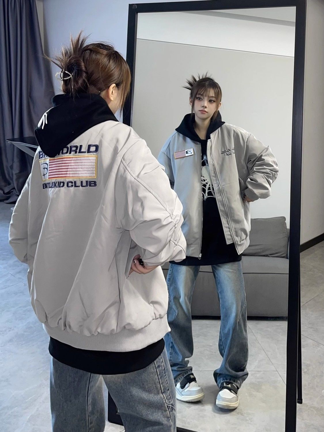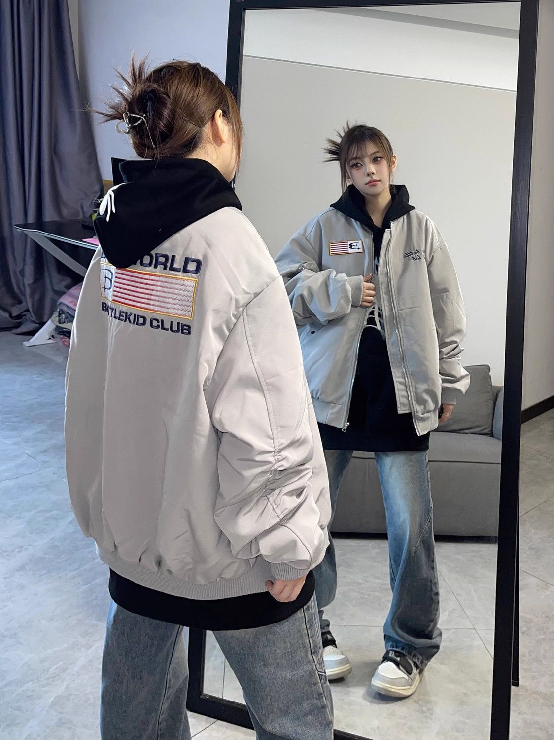 美式國潮旗幟刺綉飛行秋冬款夾棉夾克男女寬松棒球服棉衣加厚外套
