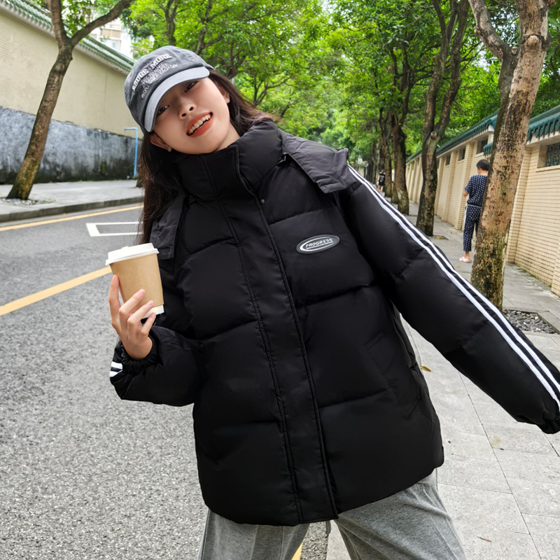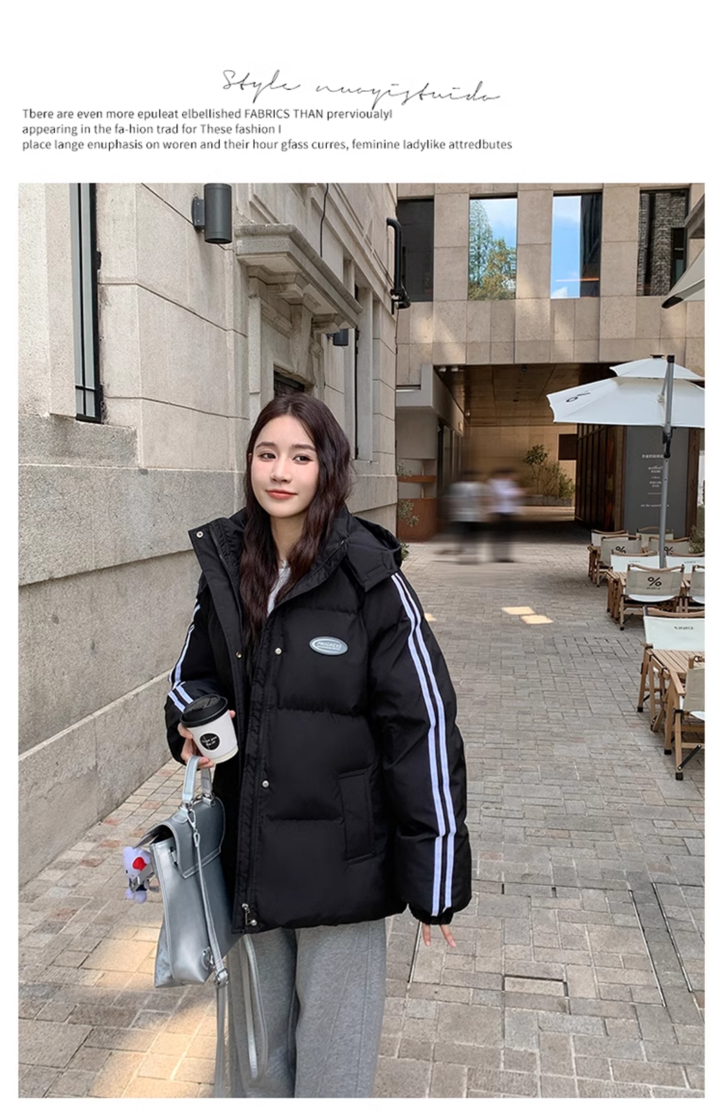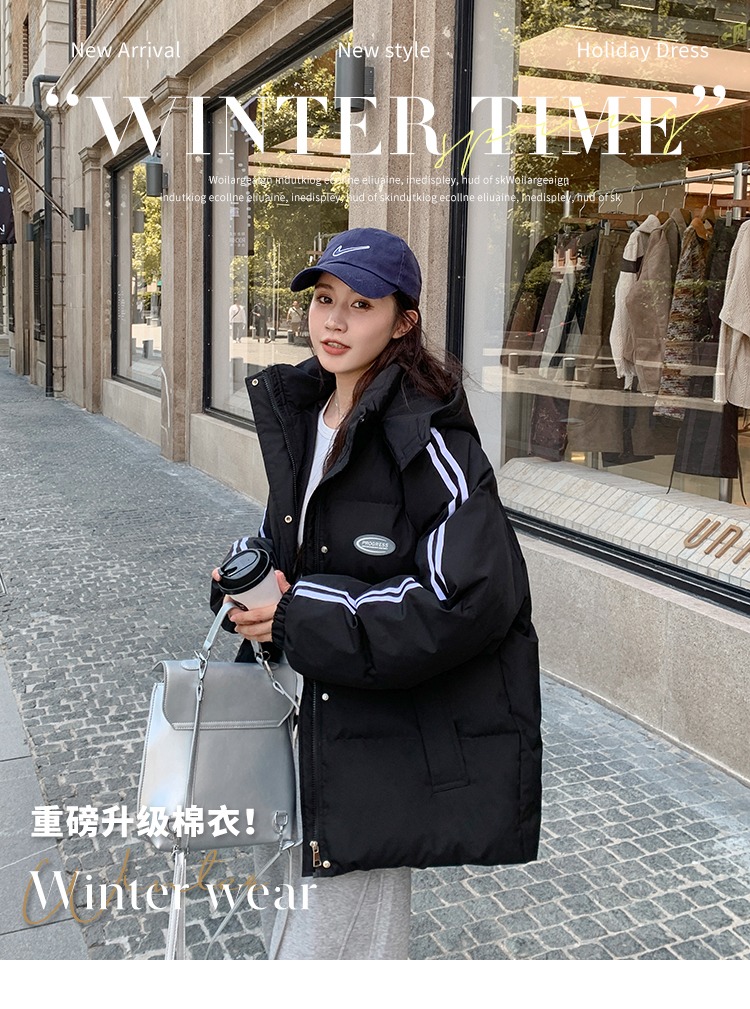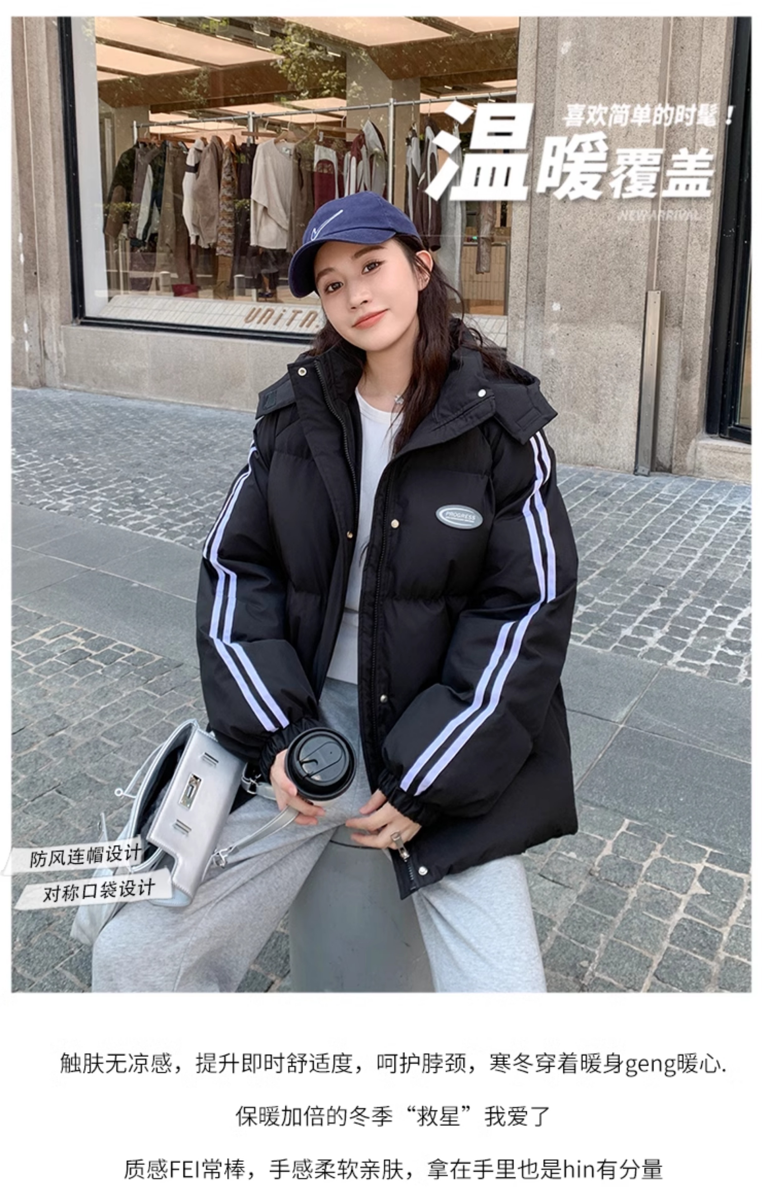 黑色羽絨棉服女冬季2025新款韓系寬松學院風連帽加厚條紋棉襖外套