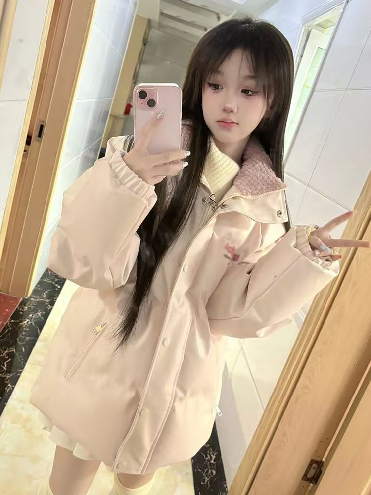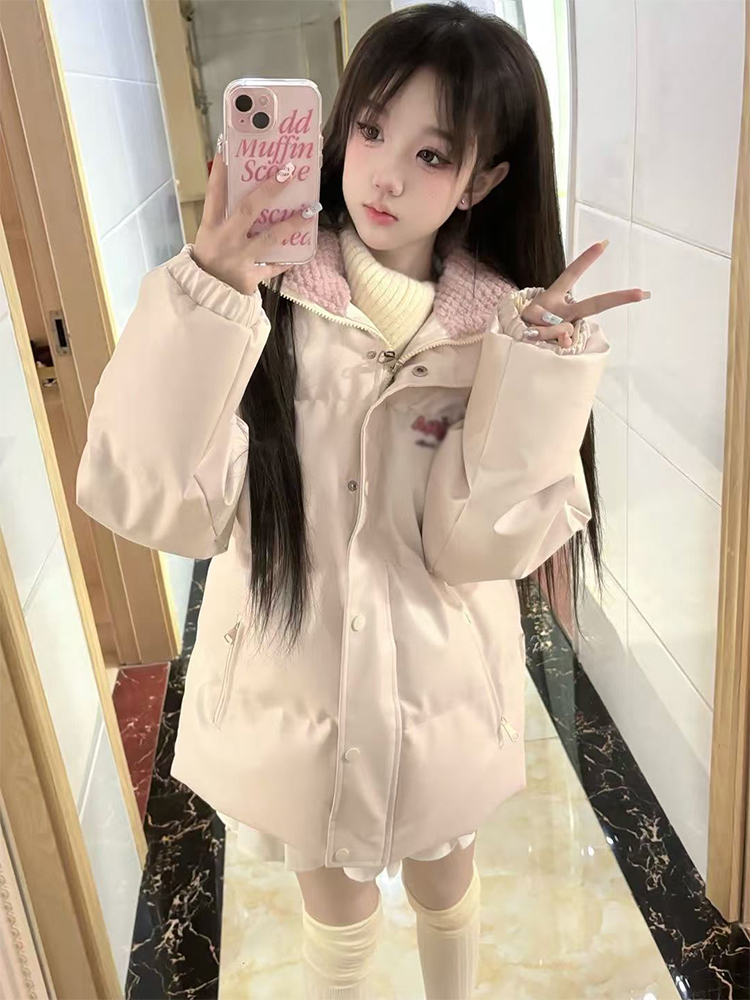 韓系可愛羊羔毛拼接羽絨棉服女冬季立領寬松加厚保暖夾棉外套棉襖