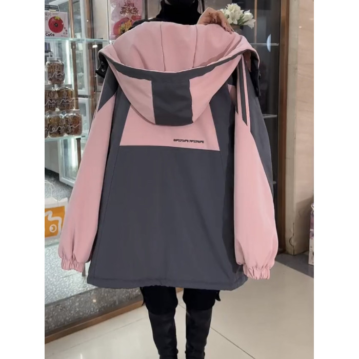 沖鋒衣連帽拼色加絨加厚外套女2025冬季新款韓版休閒保暖派克服潮