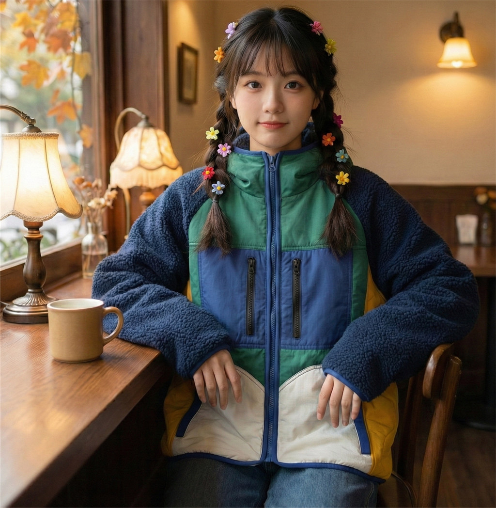 日系軟妹原宿風童趣拼接撞色寬鬆工裝連帽薄款羊羔毛棉衣外套少女