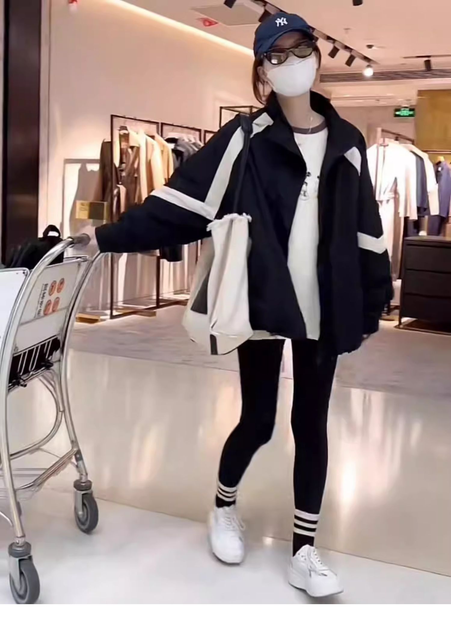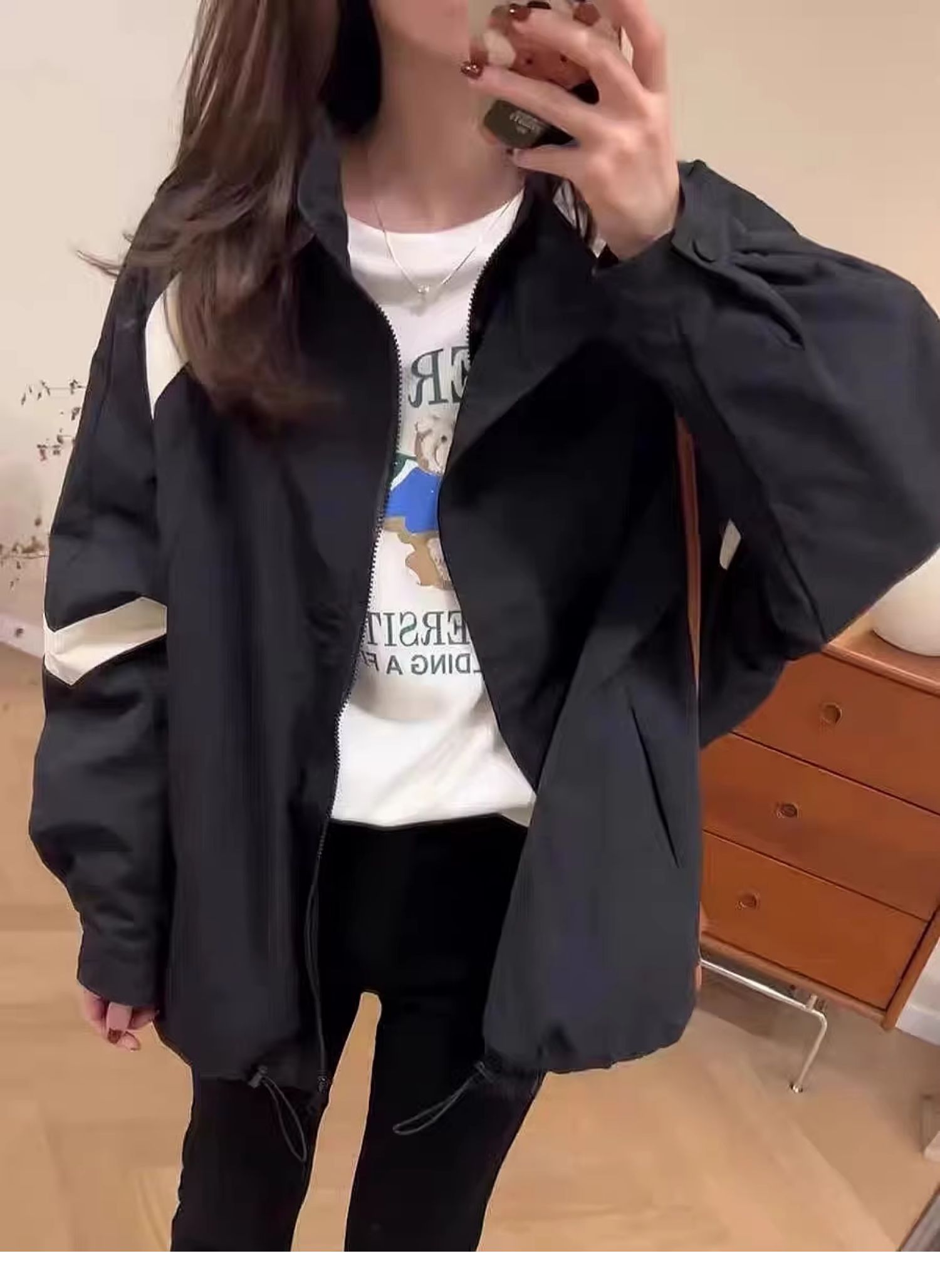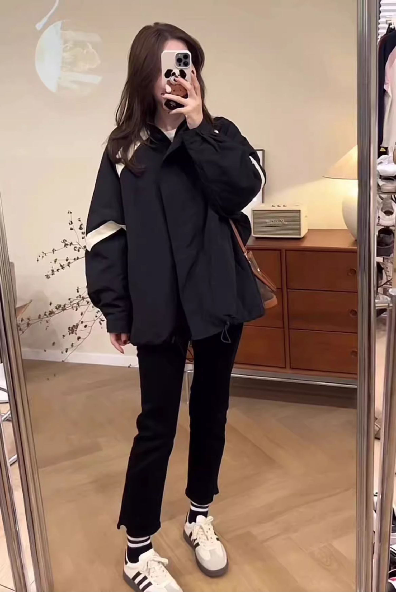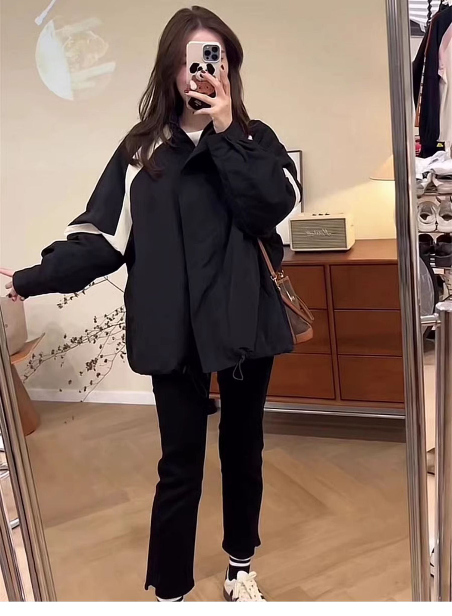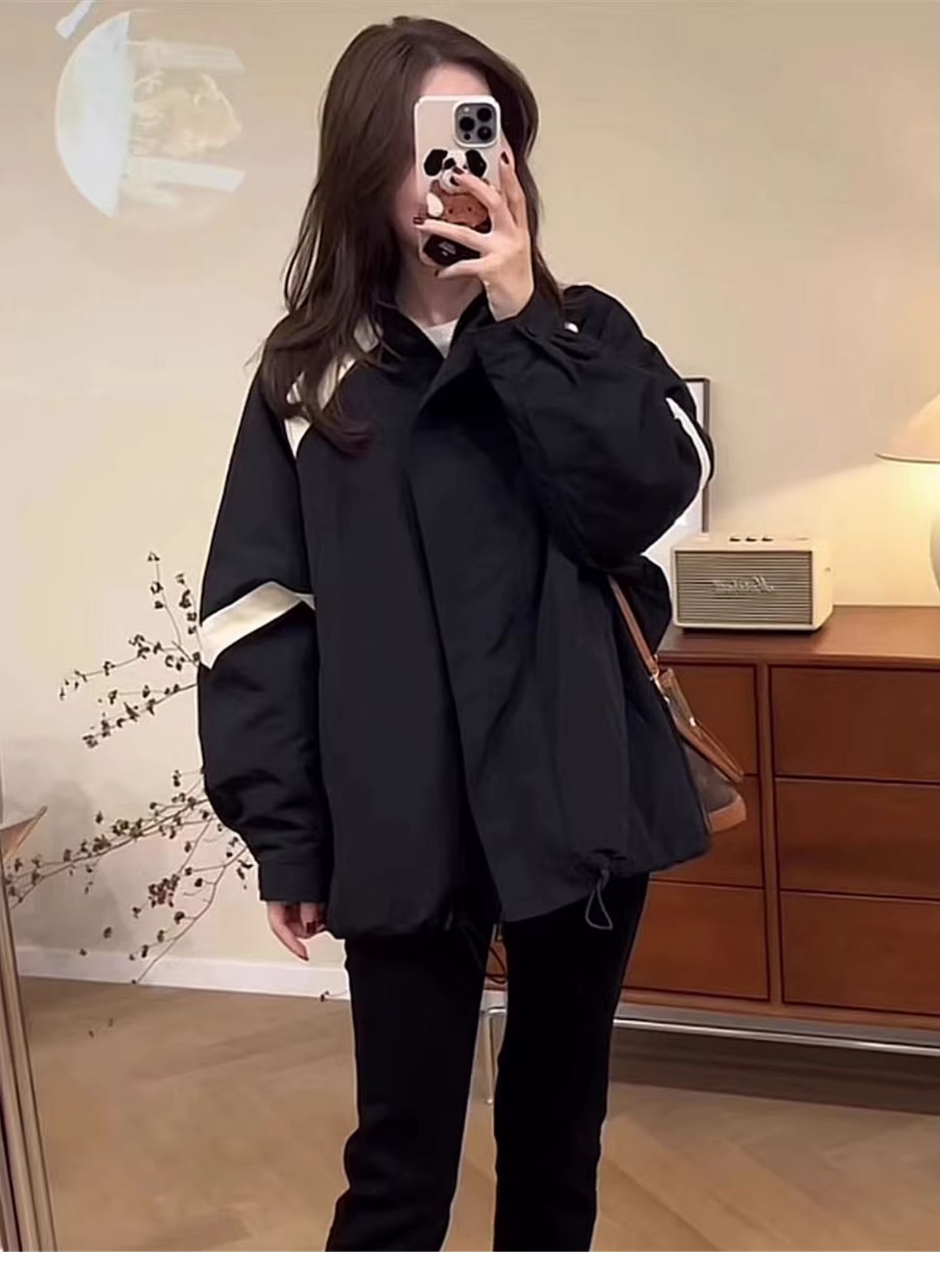 韓版立領拼色沖鋒衣外套女2024秋冬新款夾棉加厚休閒寬松顯瘦上衣