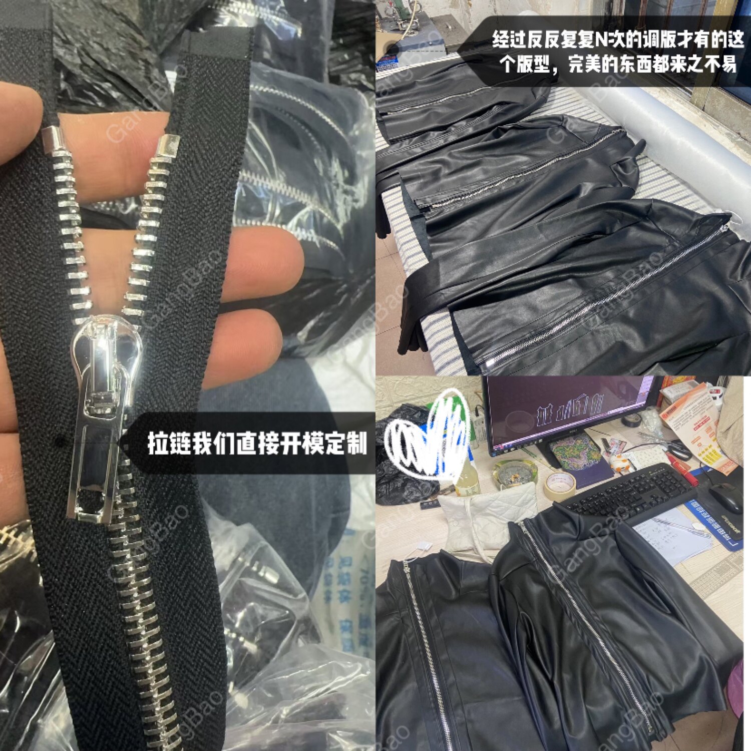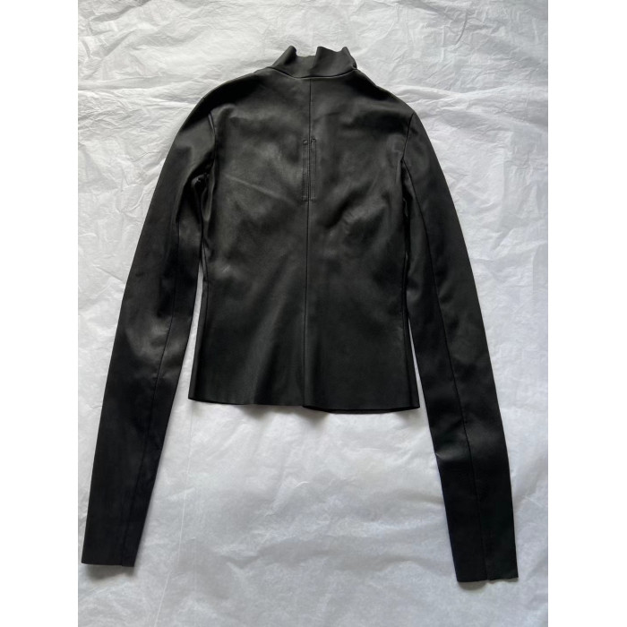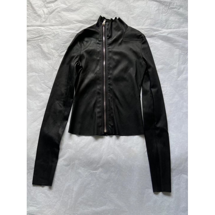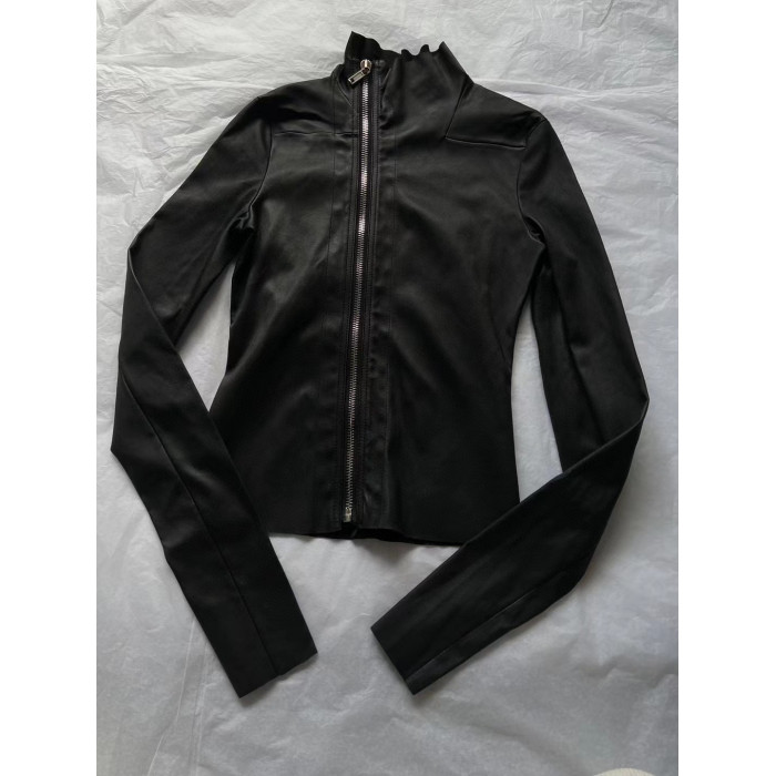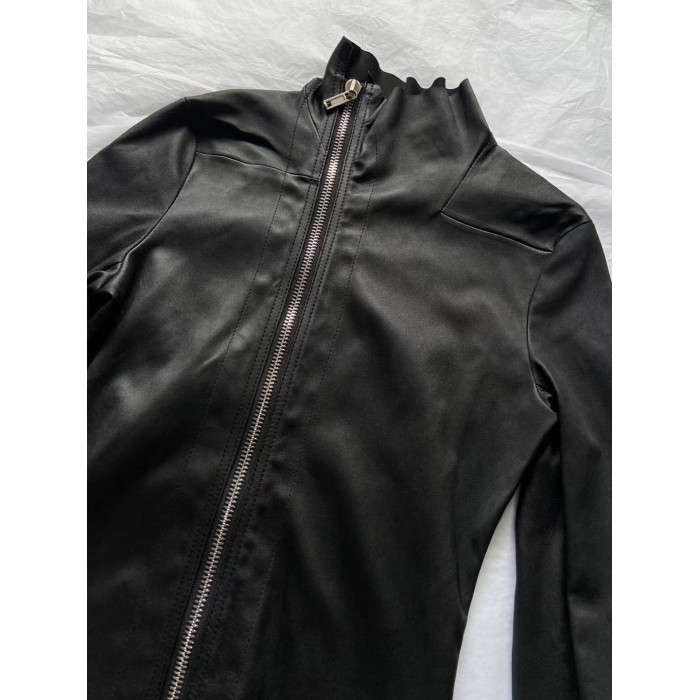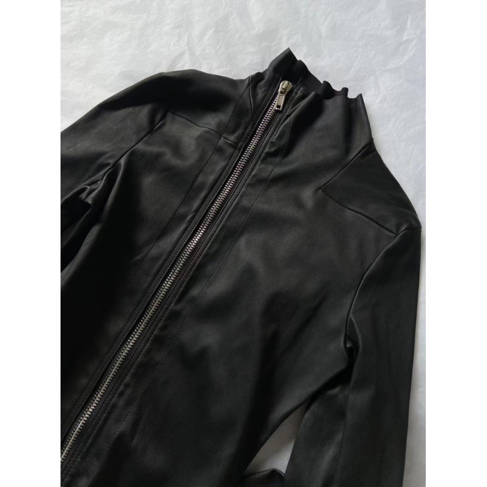 24FW 暗黑RO風高領斜拉鍊PU皮質彈力修身百搭皮衣機車夾克外套女