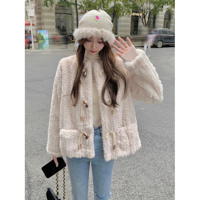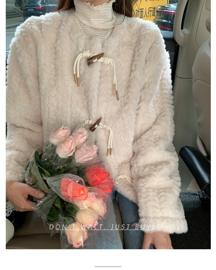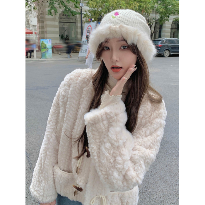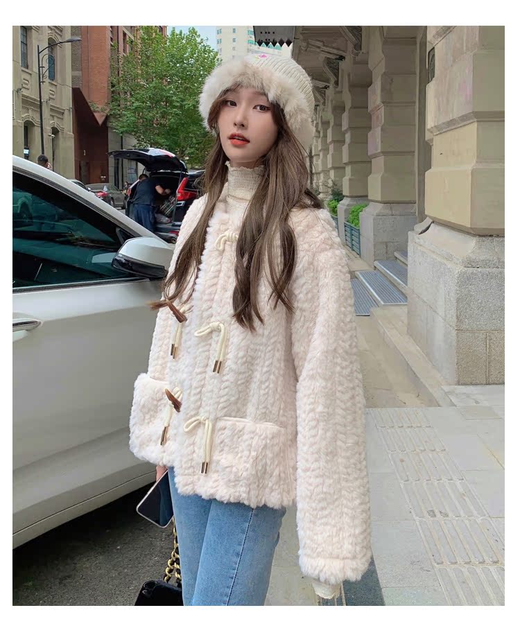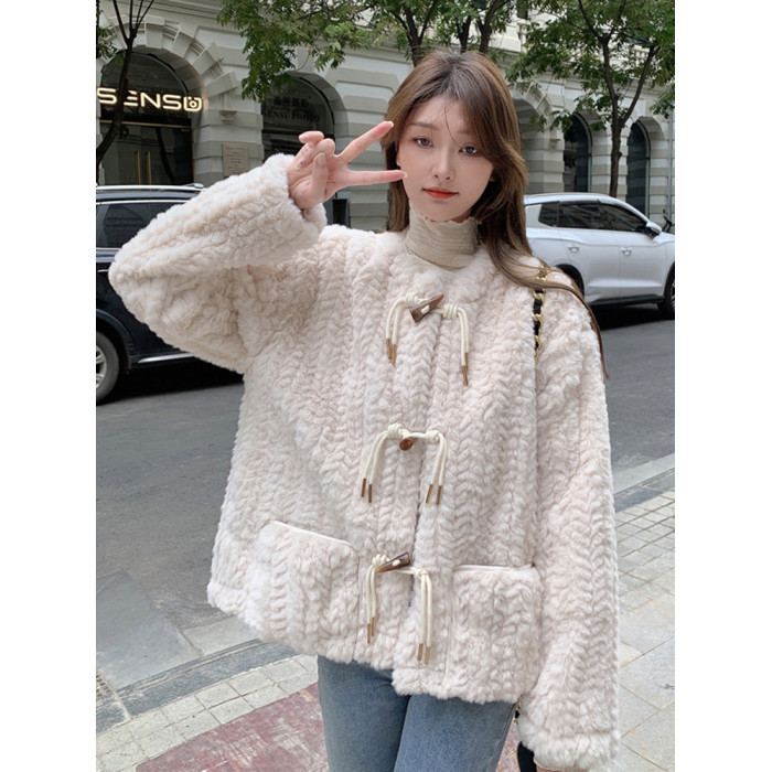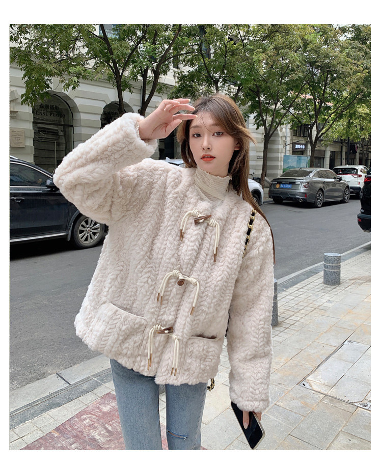 羊羔毛外套女冬短款皮毛一體寬松毛毛絨牛角釦圓領羊毛羔百搭學生