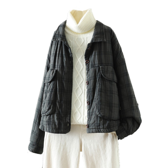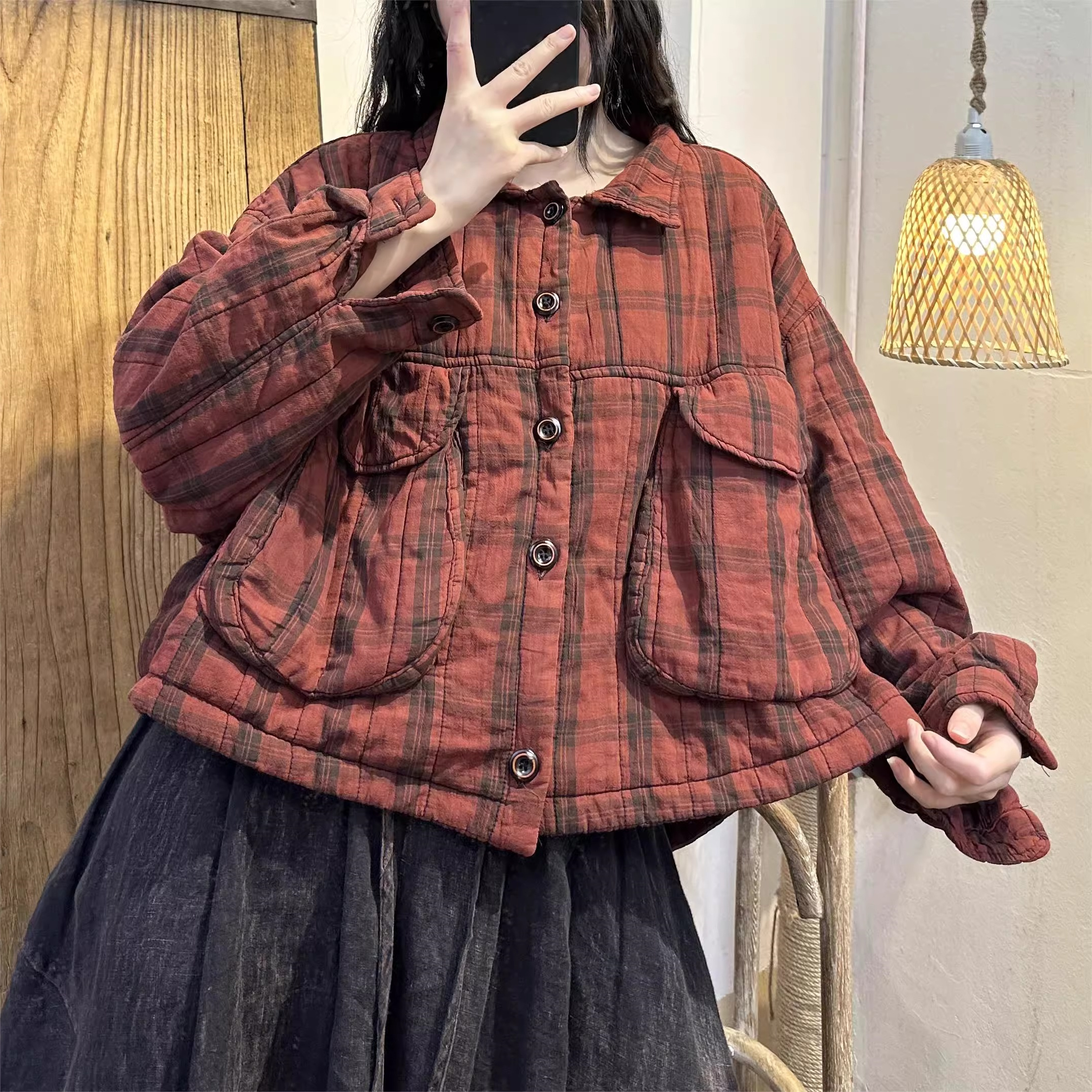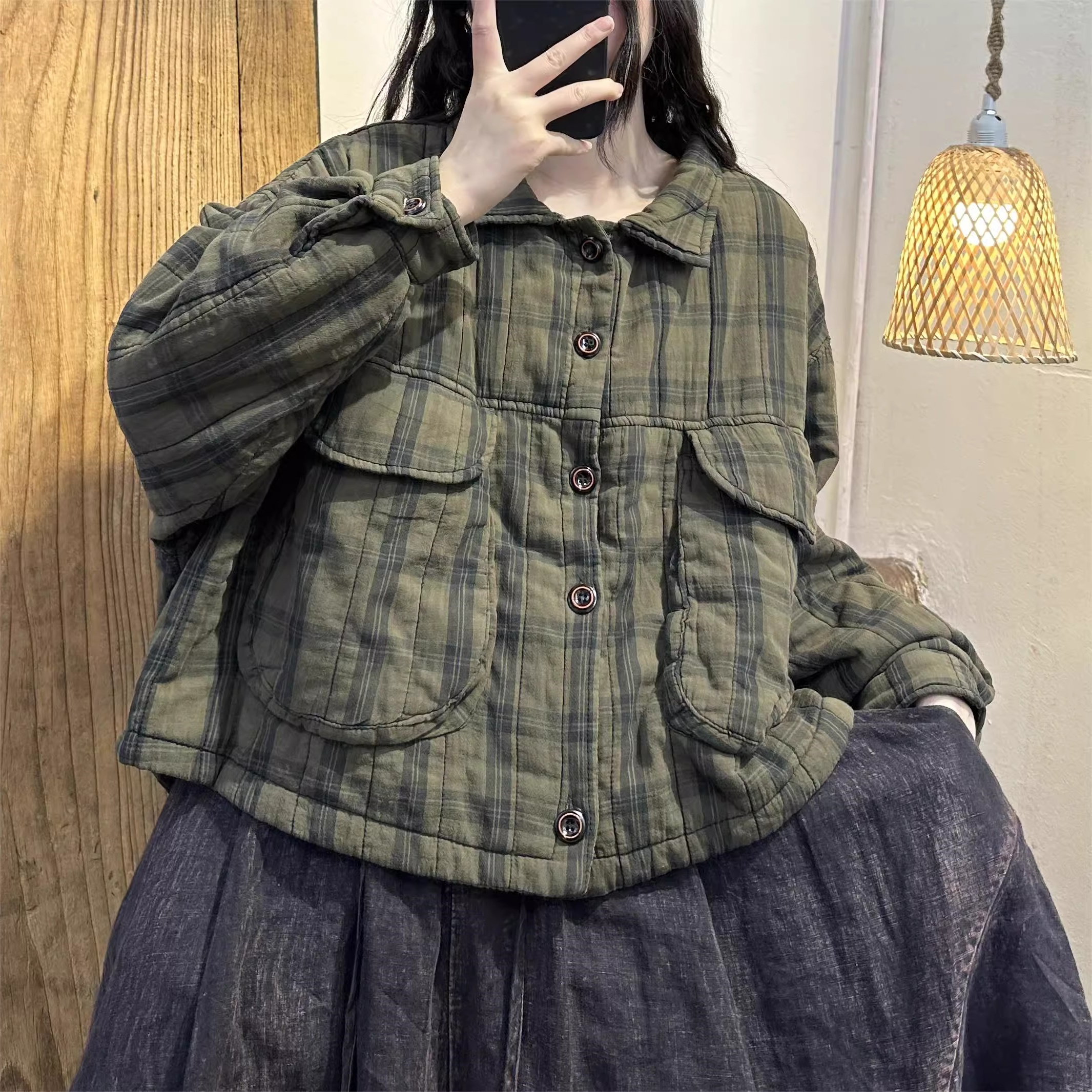 撿漏專櫃尾單夾棉加厚格紋麻料棉衣外套女冬遮肚顯瘦保暖棉服棉襖