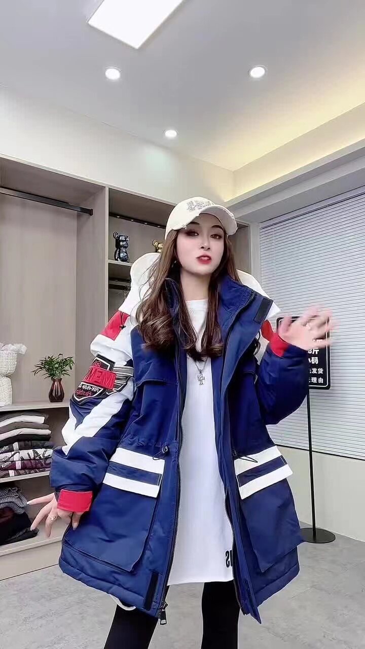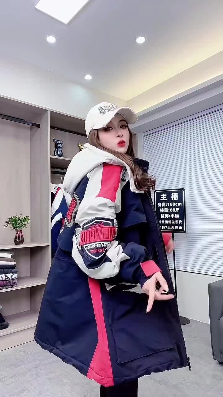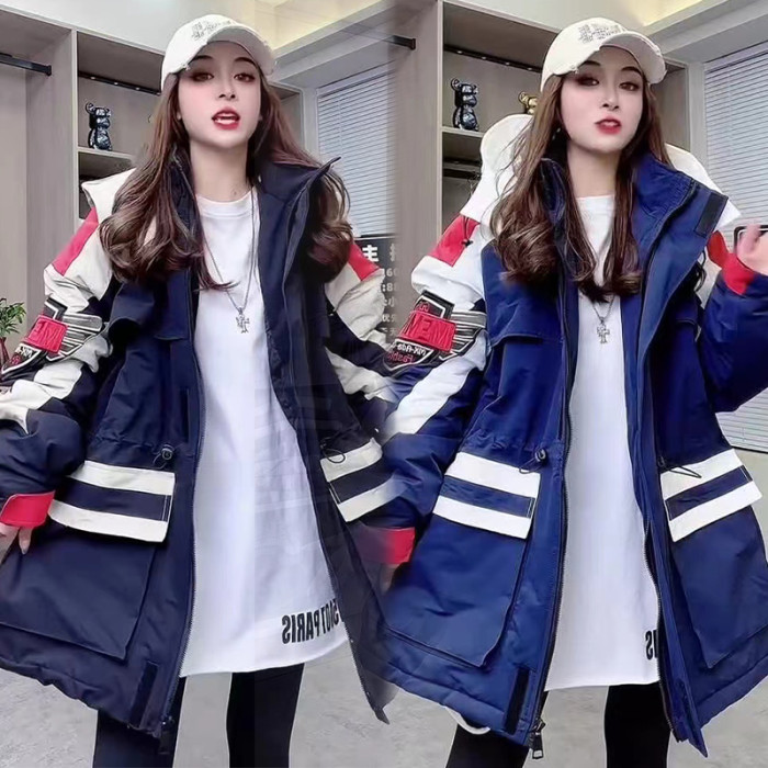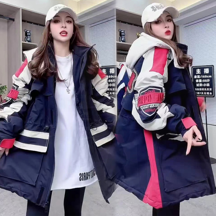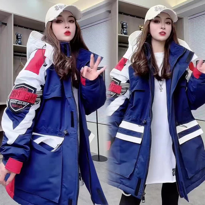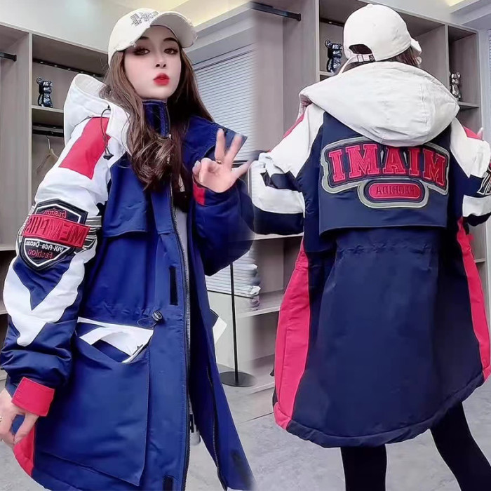 冬沖鋒衣連帽棉服重工刺綉撞色加棉加肥收腰歐貨新款中長款加厚潮