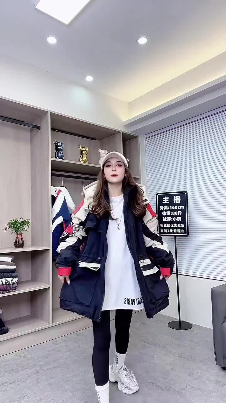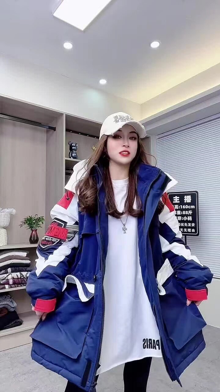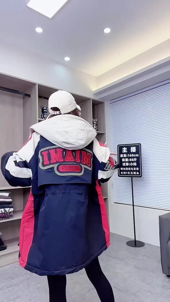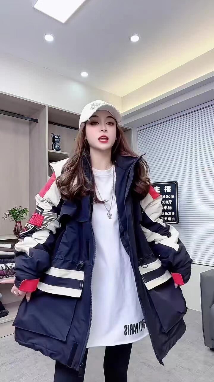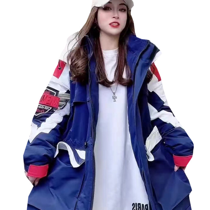 冬沖鋒衣連帽棉服重工刺綉撞色加棉加肥收腰歐貨新款中長款加厚潮