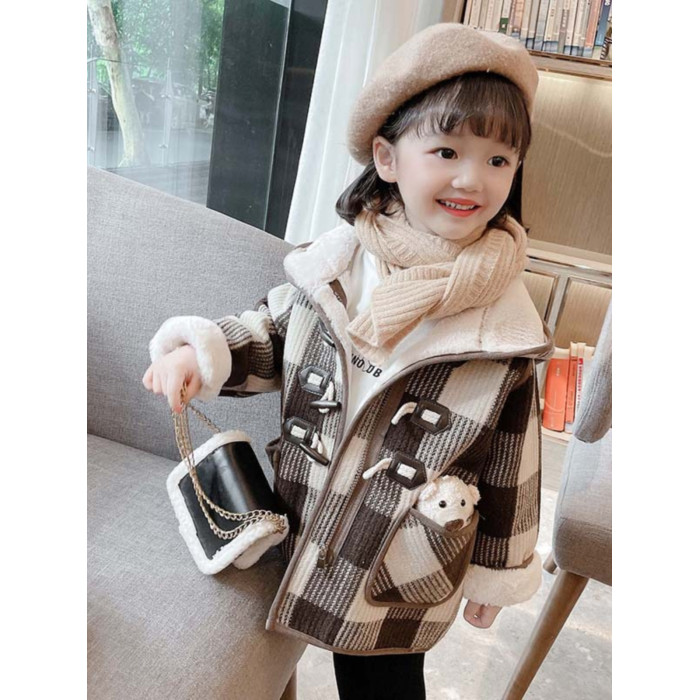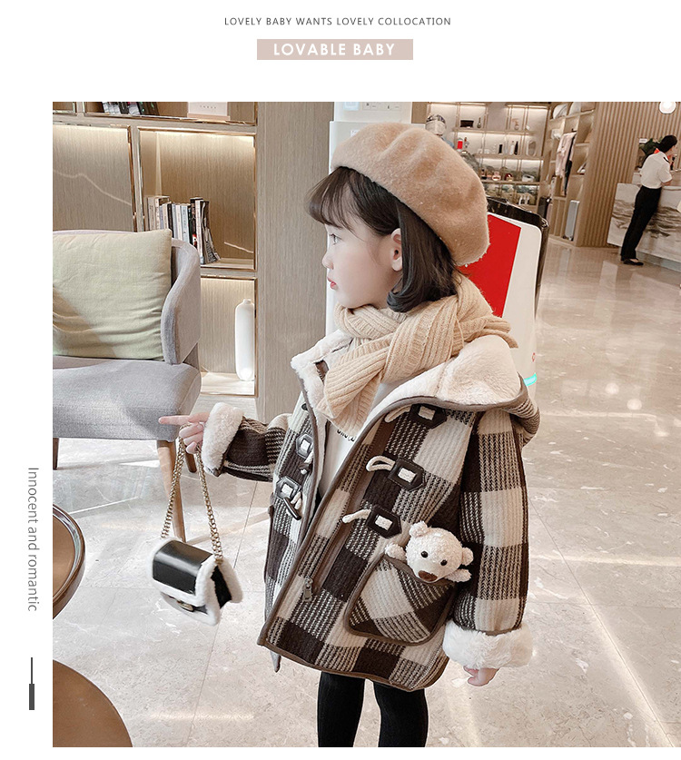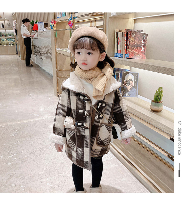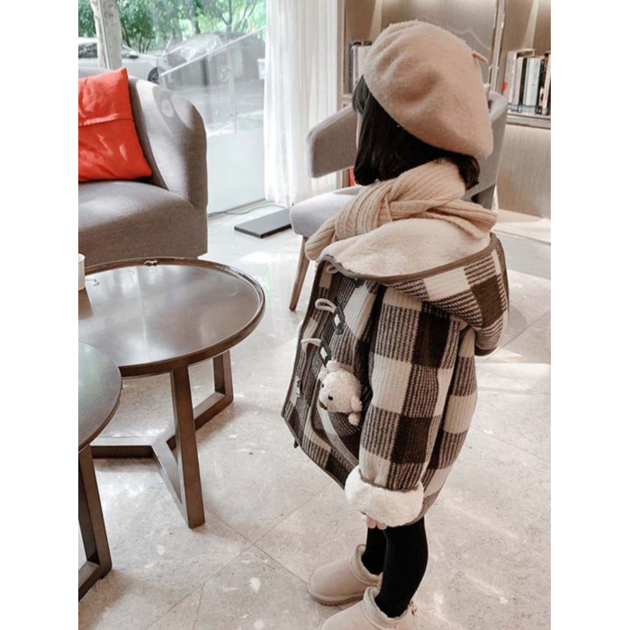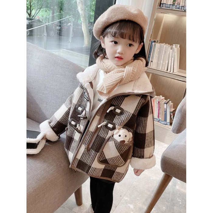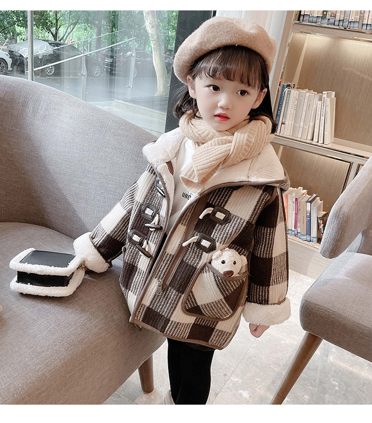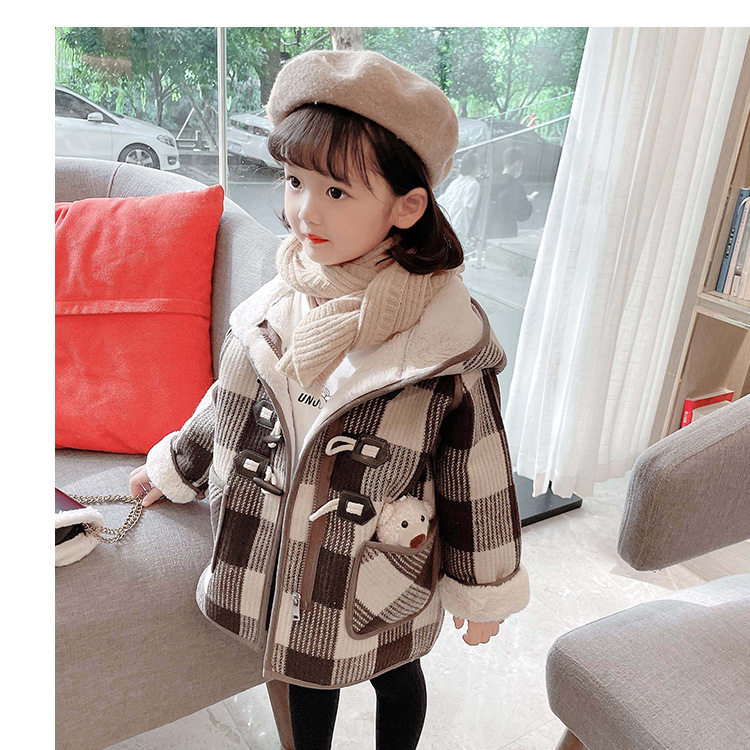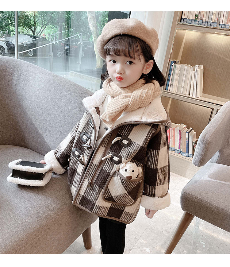 女小童格子小熊一體絨棉衣2025冬新品女寶寶時尚加厚連帽長袖外套
