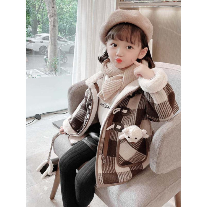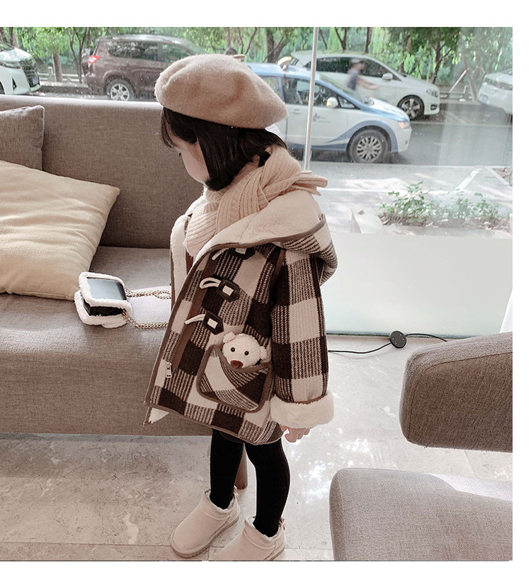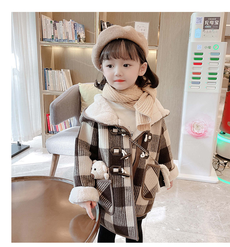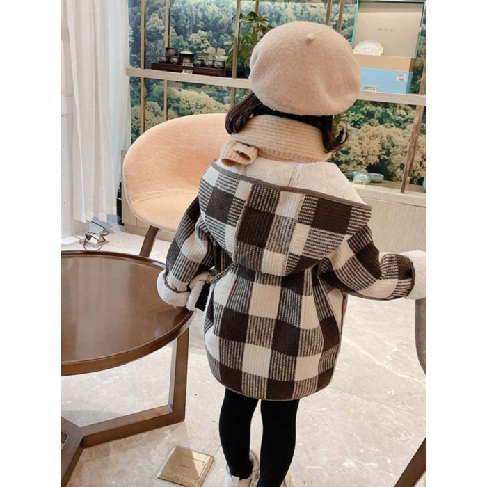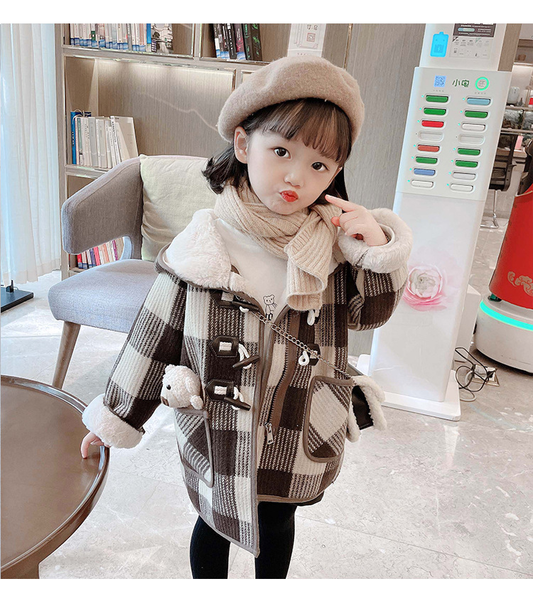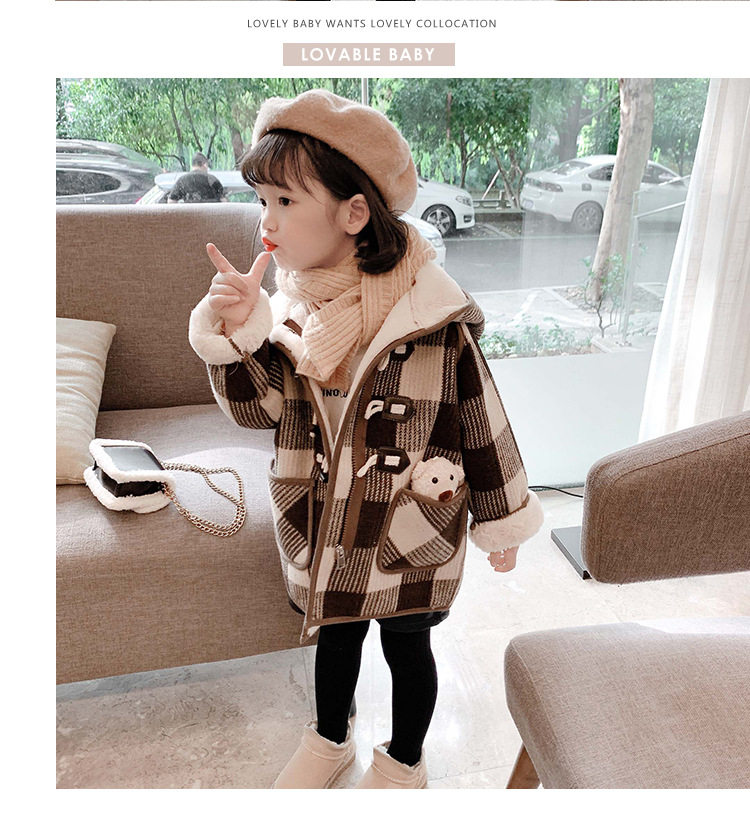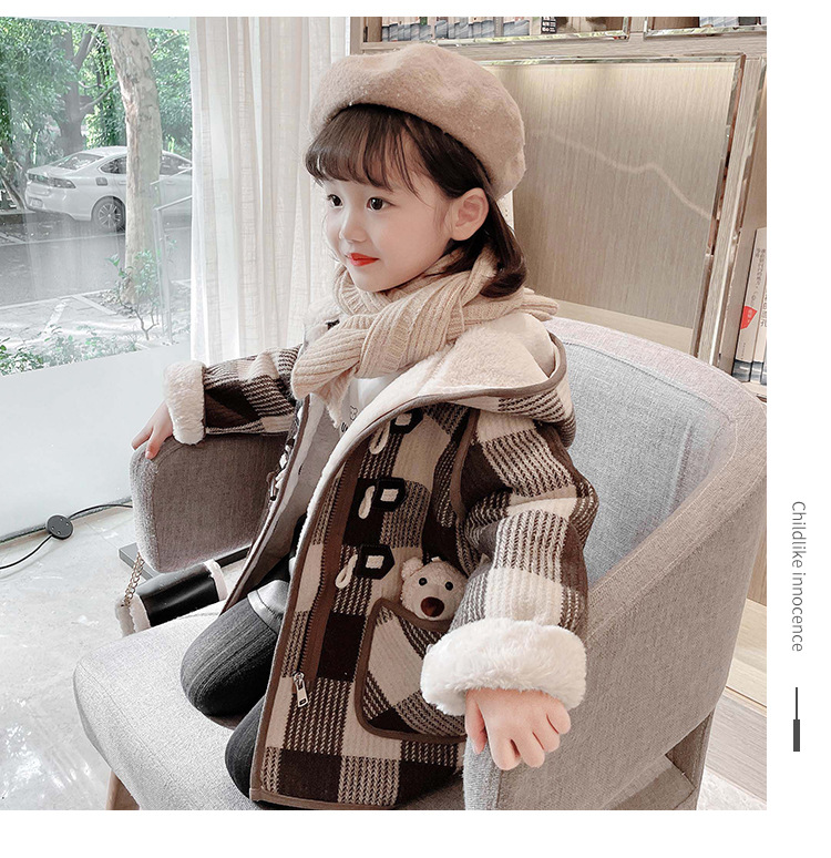 女小童格子小熊一體絨棉衣2025冬新品女寶寶時尚加厚連帽長袖外套