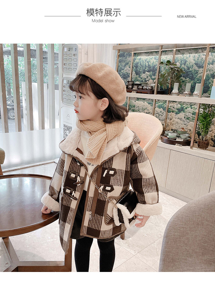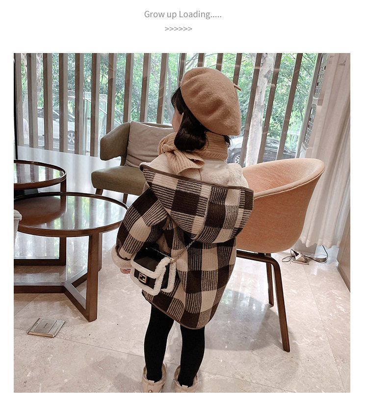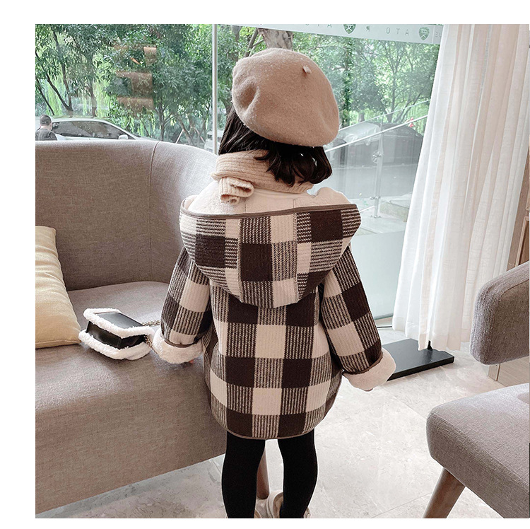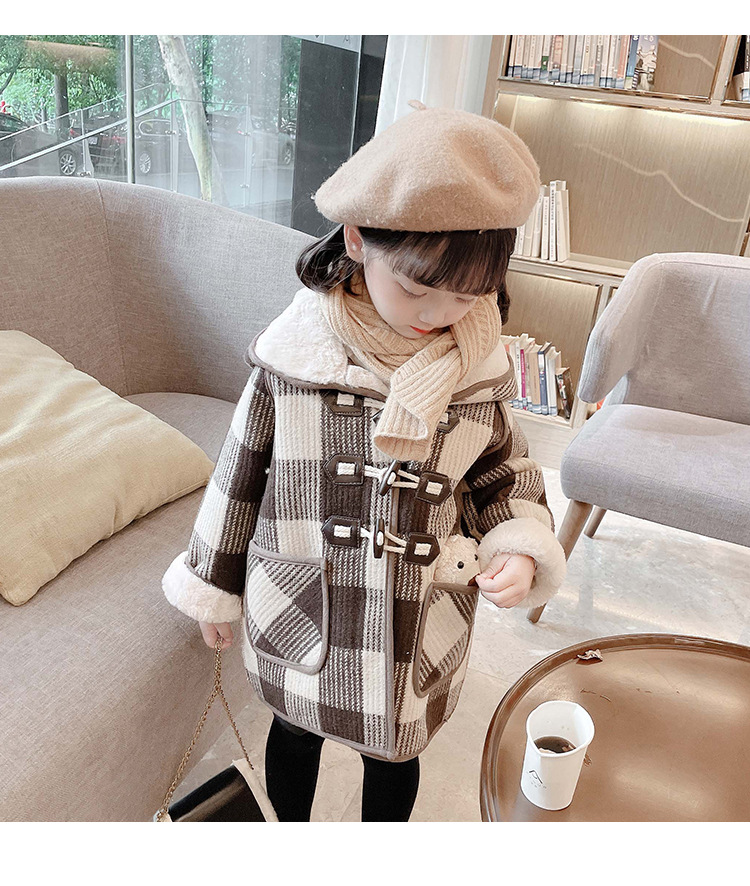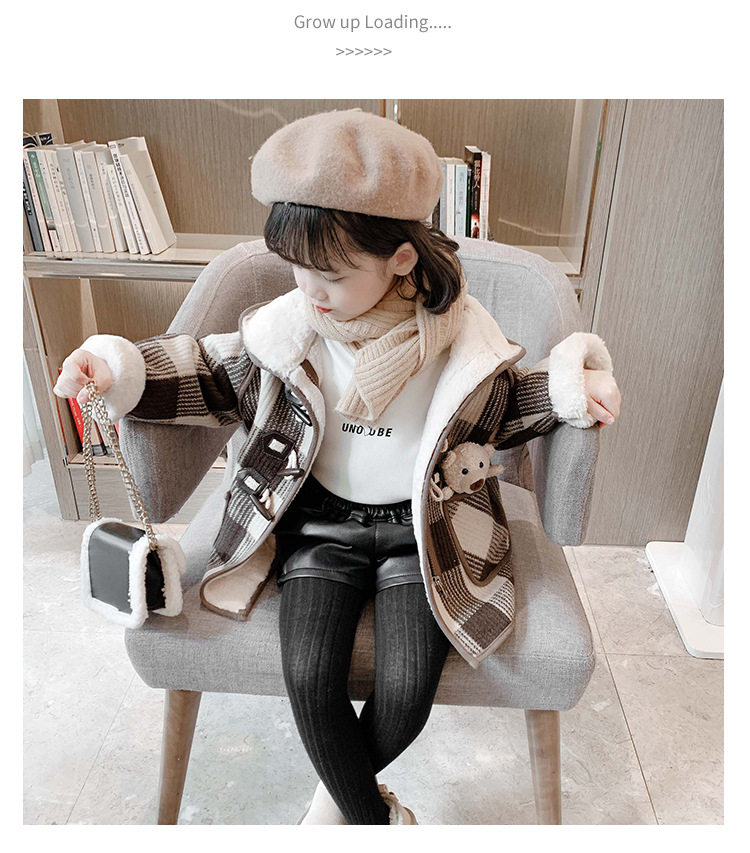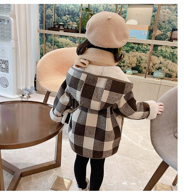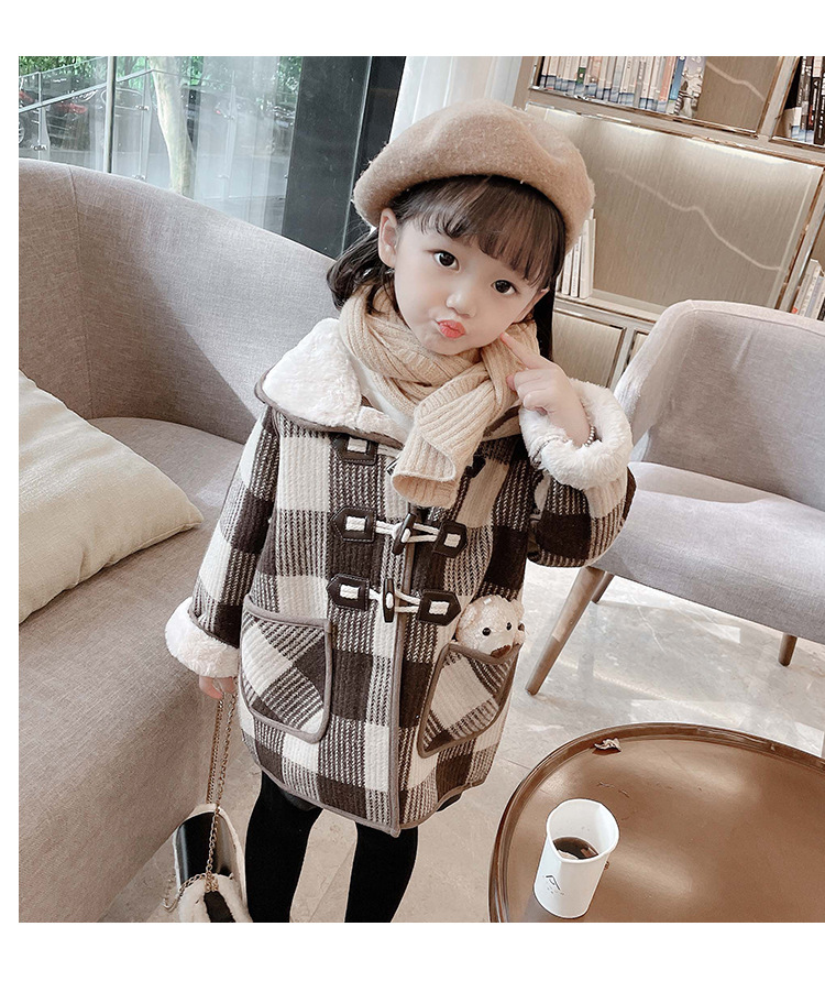 女小童格子小熊一體絨棉衣2025冬新品女寶寶時尚加厚連帽長袖外套