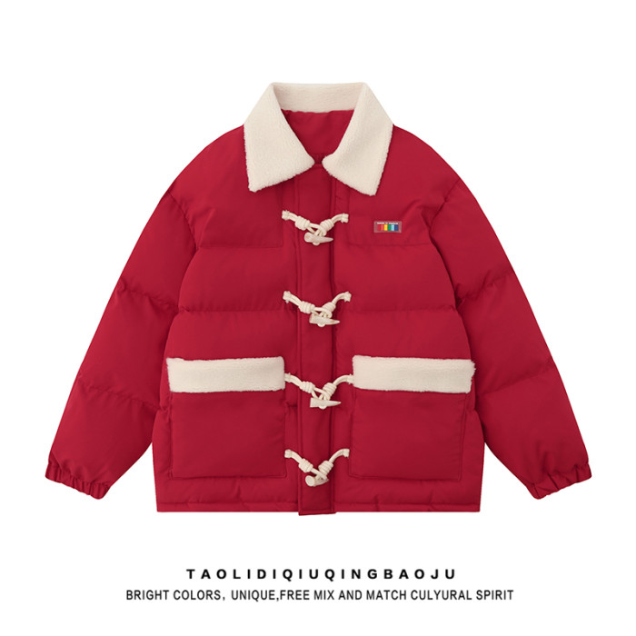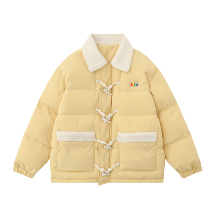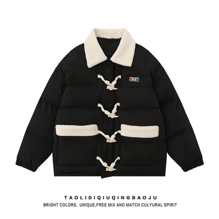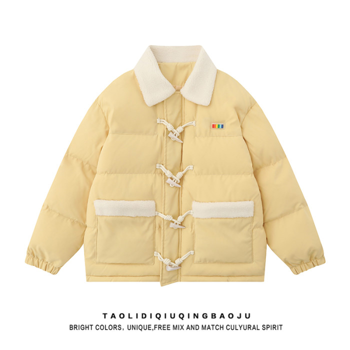 羊羔絨拼接羊角釦翻領加厚棉服女冬季甜美風別致百搭情侶保暖外套