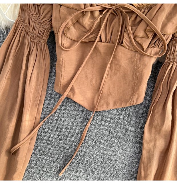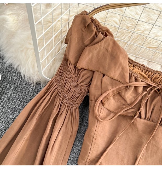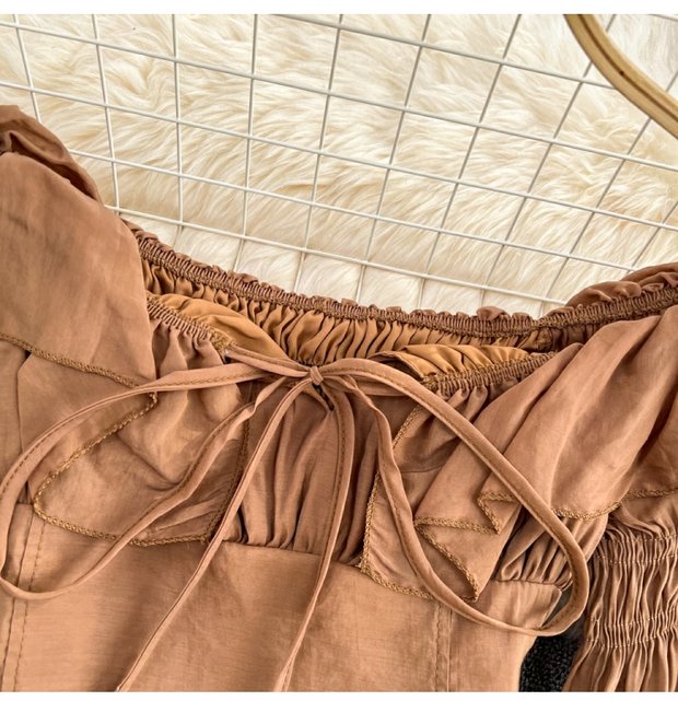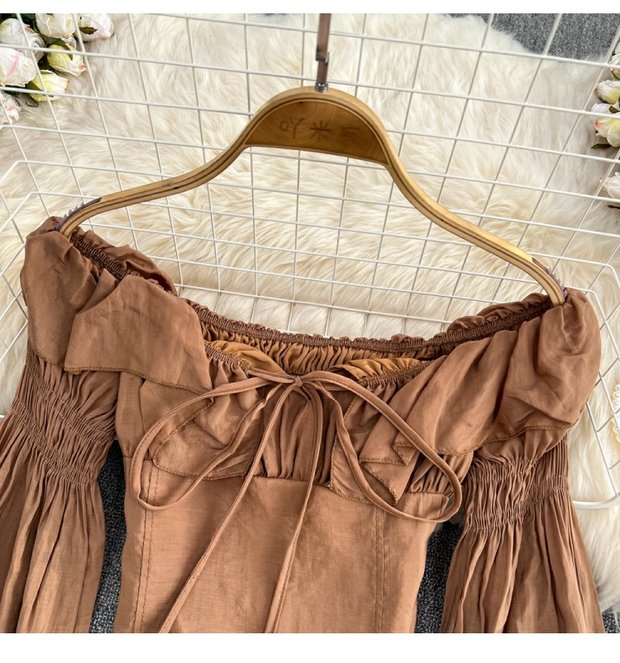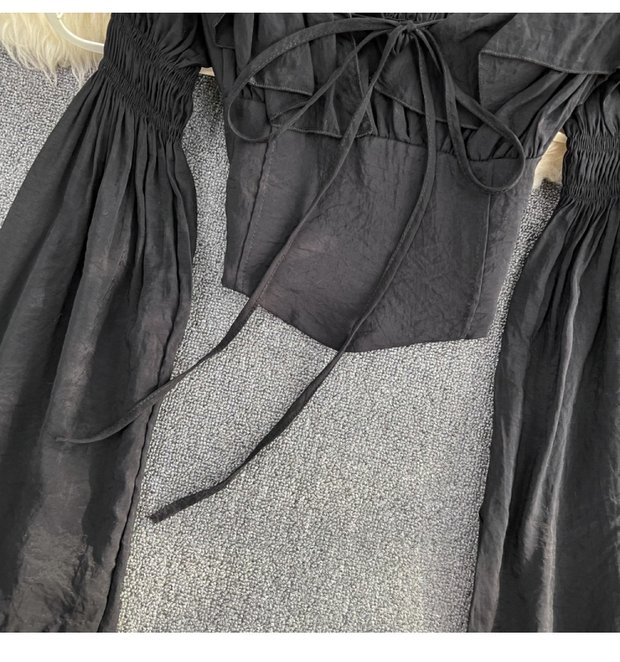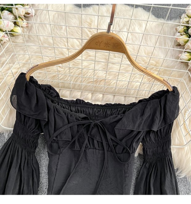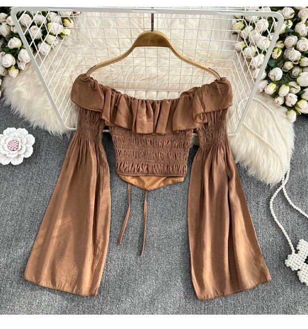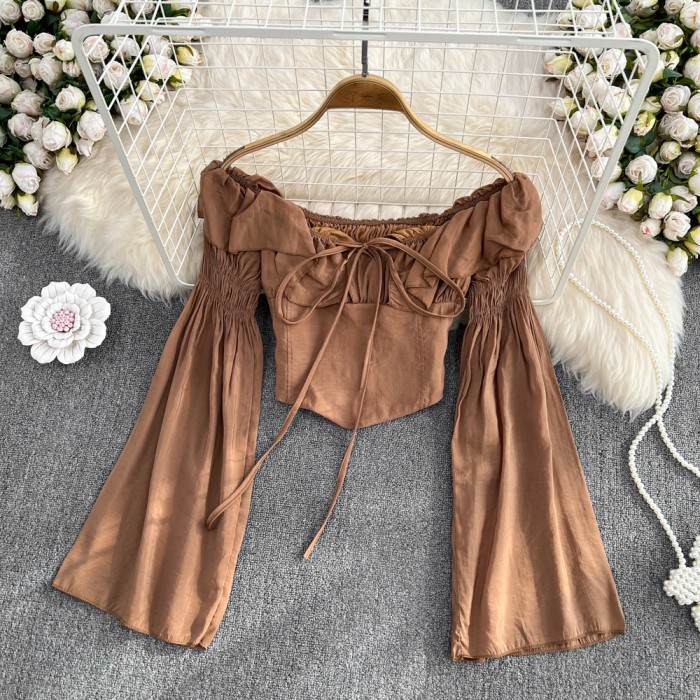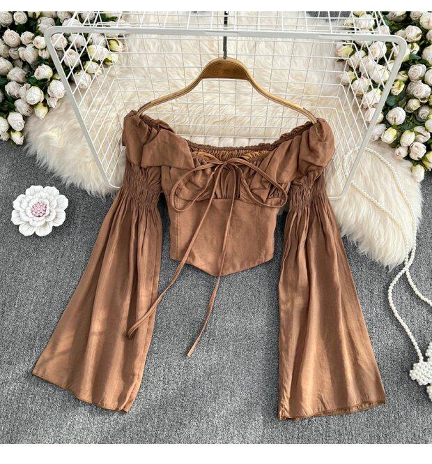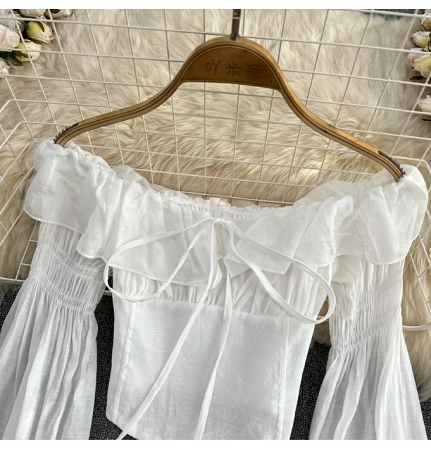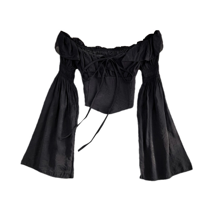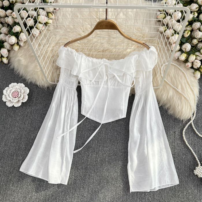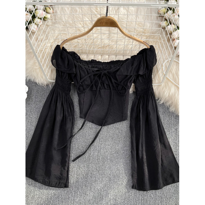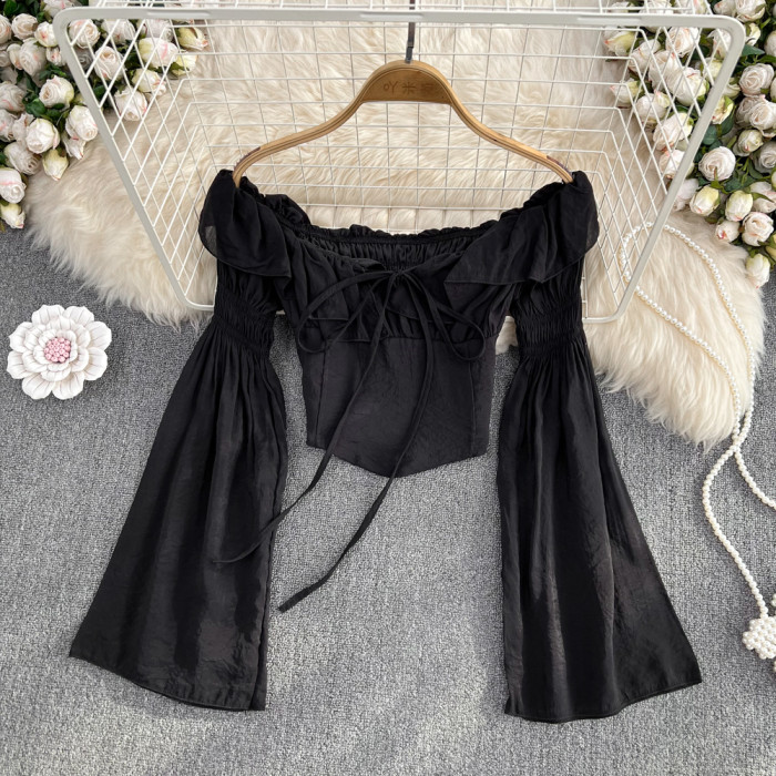 喇叭袖襯衫女2025秋季韓版高級感氣質鎖骨一字肩露肩收腰短款上衣