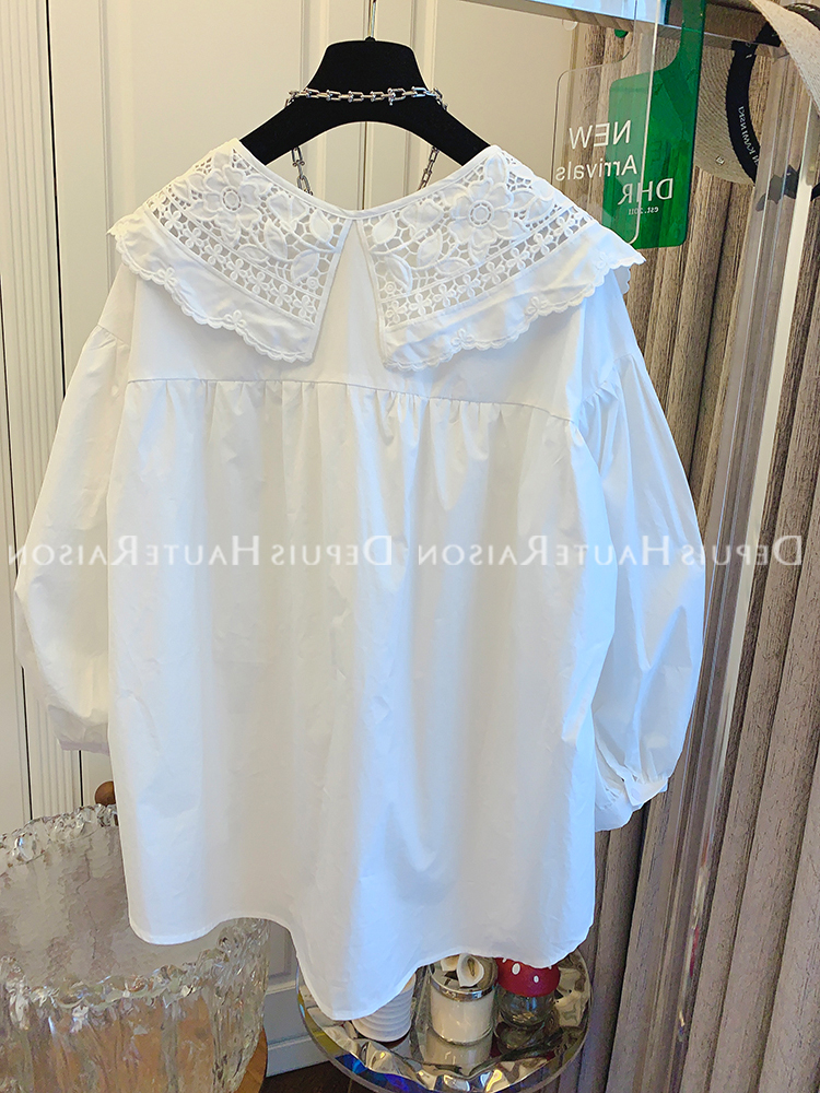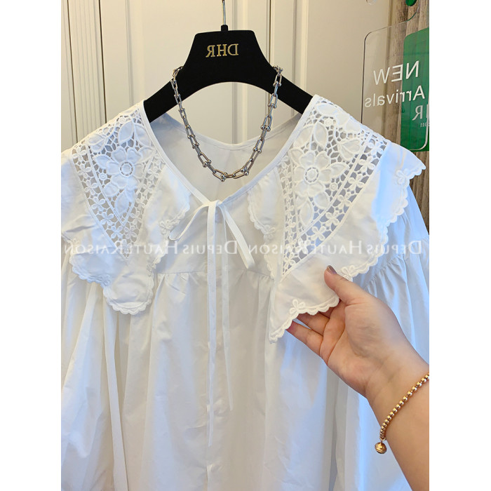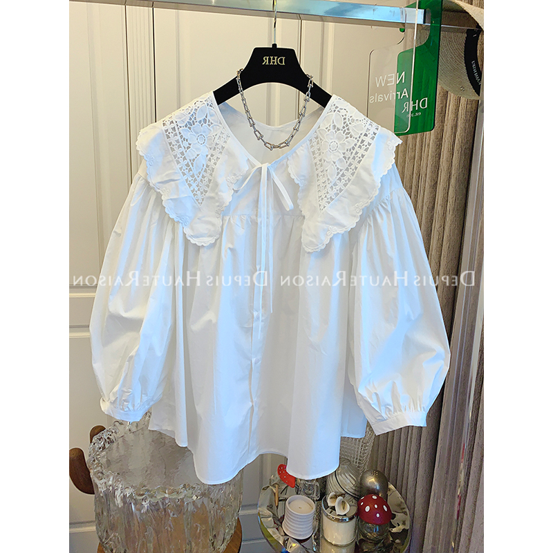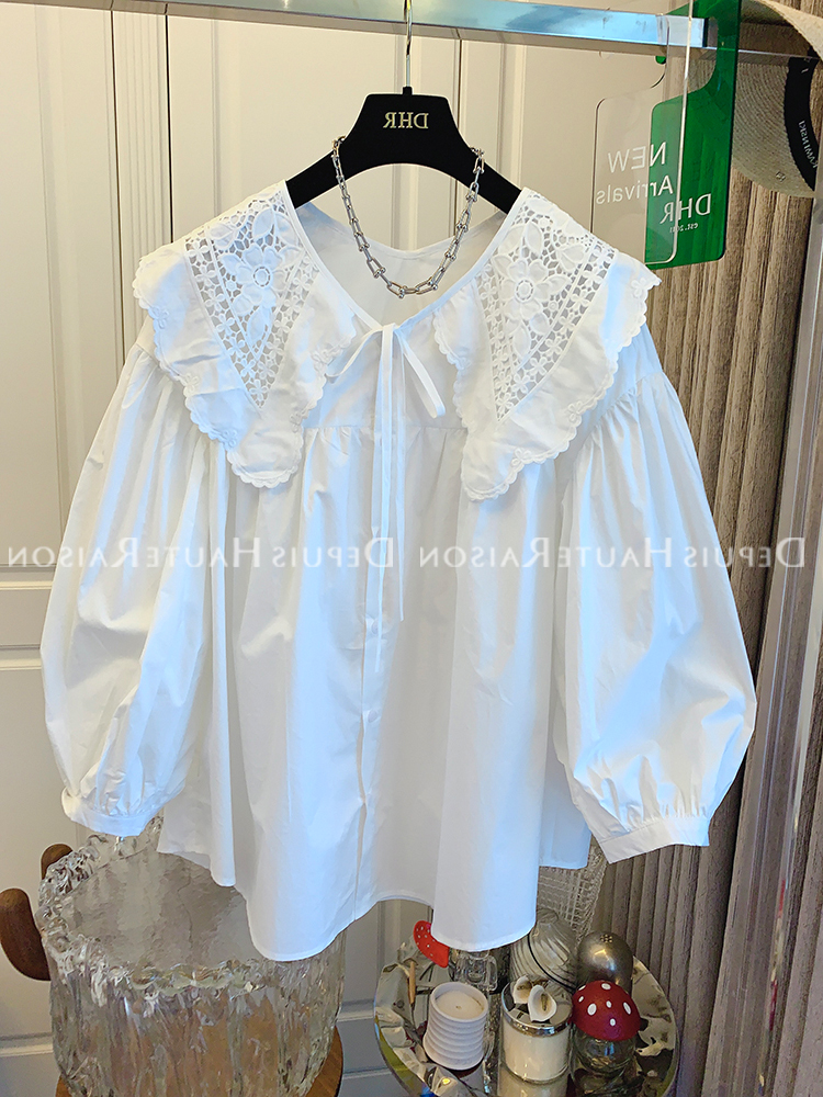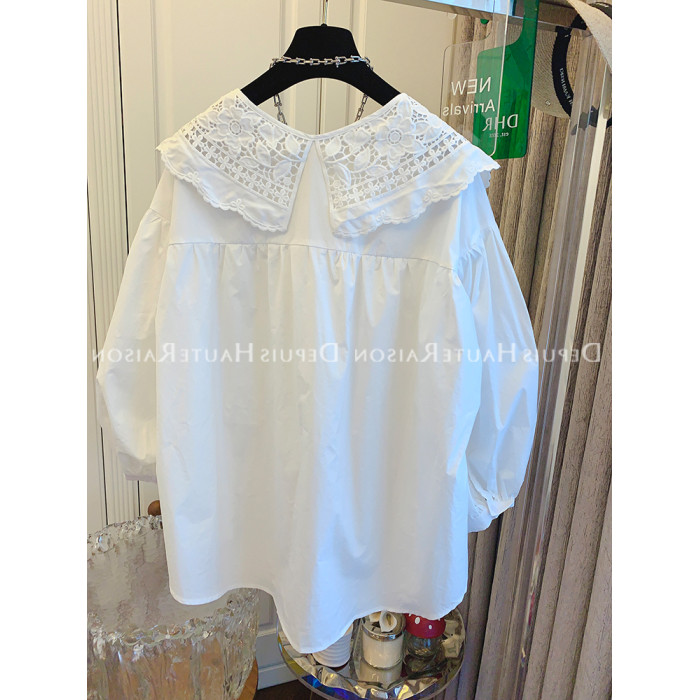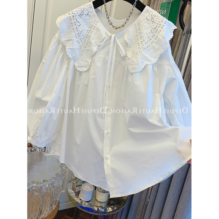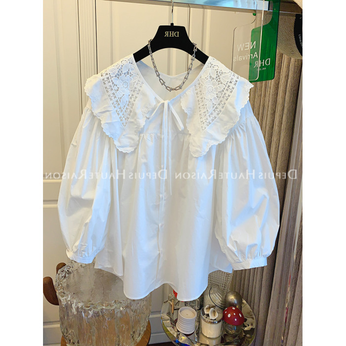 法式蕾絲刺綉娃娃領白色襯衫女春秋季小個子寬松甜美燈籠袖上衣潮
