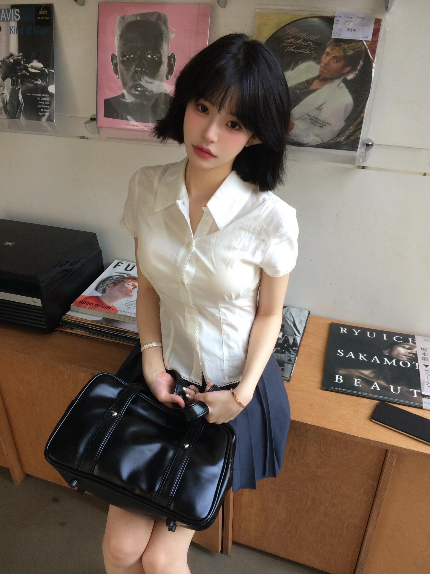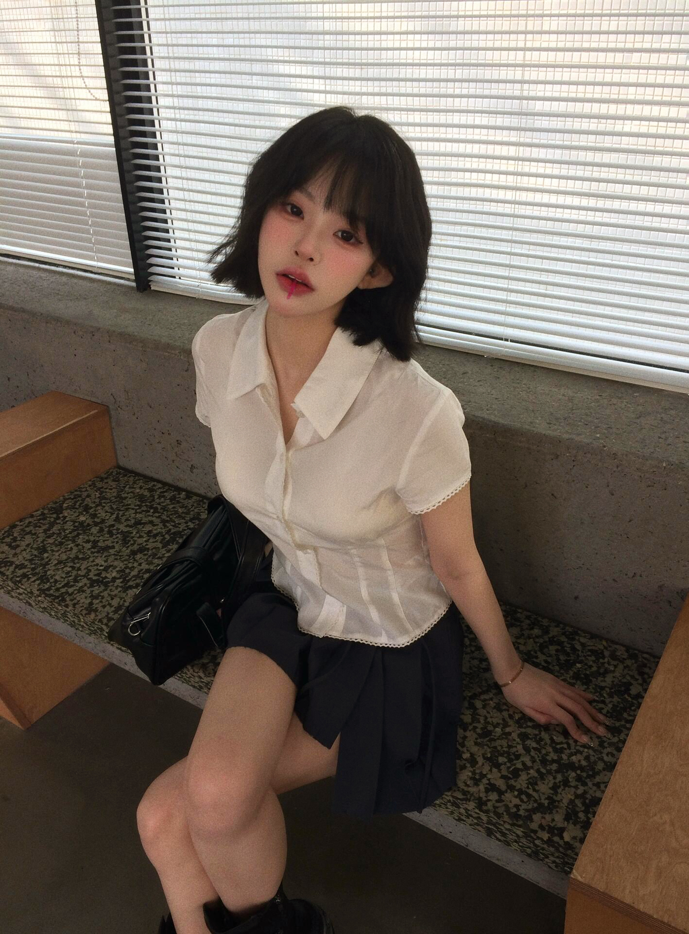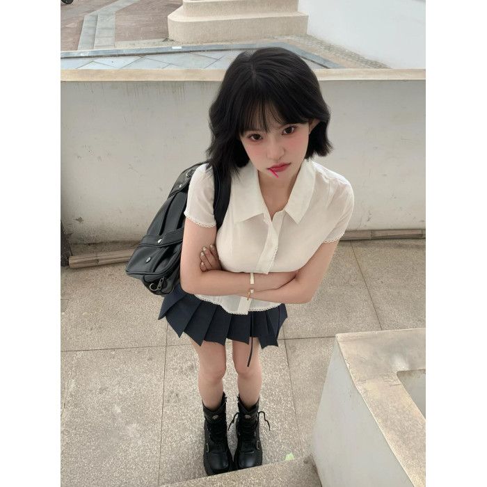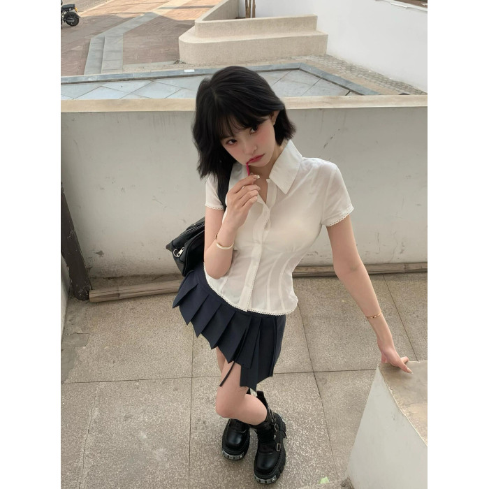 白色蕾絲拼接短袖襯衫女夏季2024新款修身顯瘦小衆甜辣妹短款上衣
