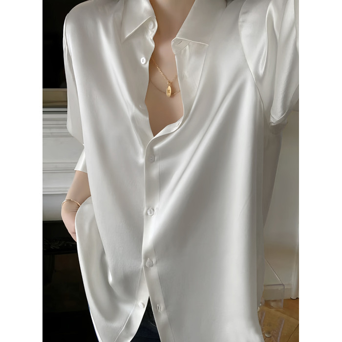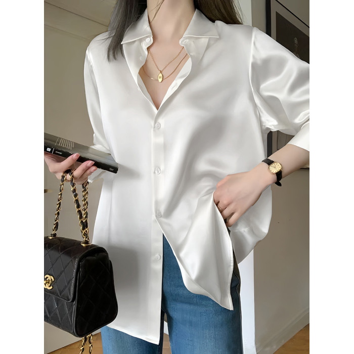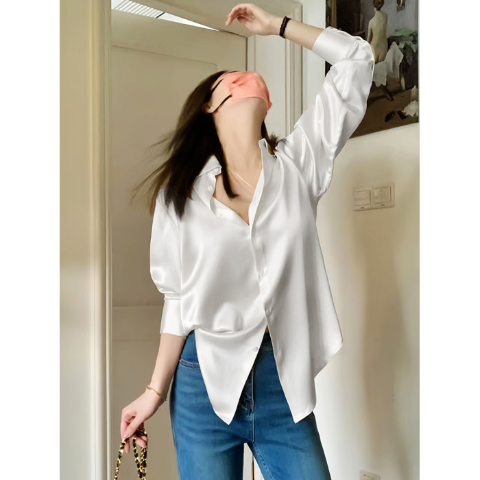2025早秋小衫白色襯衫女高級感輕奢緞面襯衣小個子寬松上衣設計感