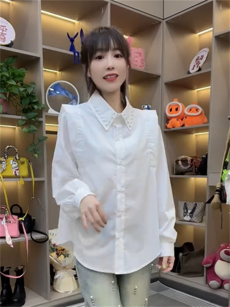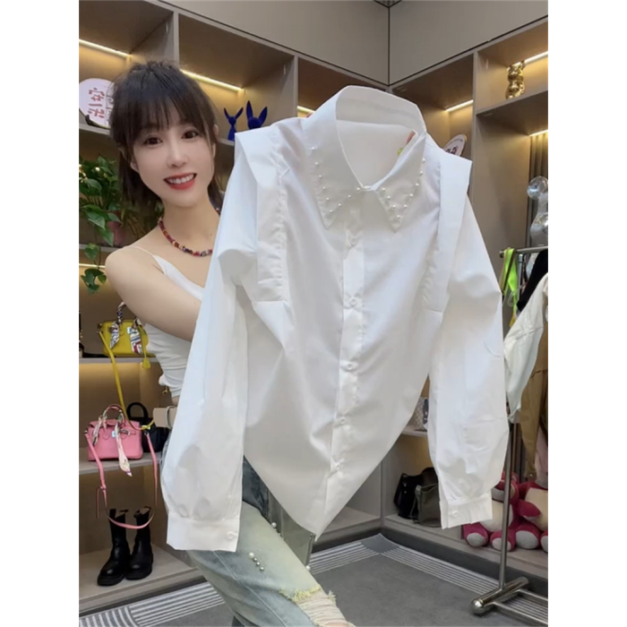 歐貨早春新款時髦設計感珍珠領白色襯衫女氣質高級感寬松顯瘦上衣