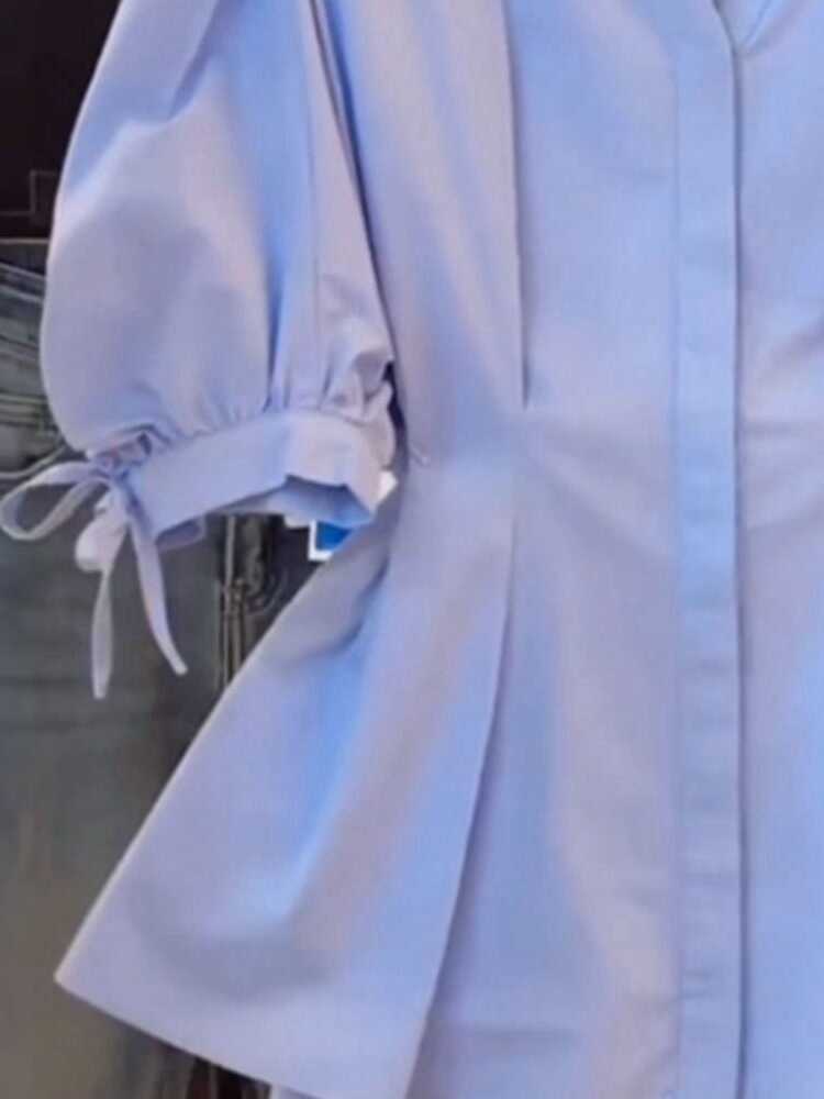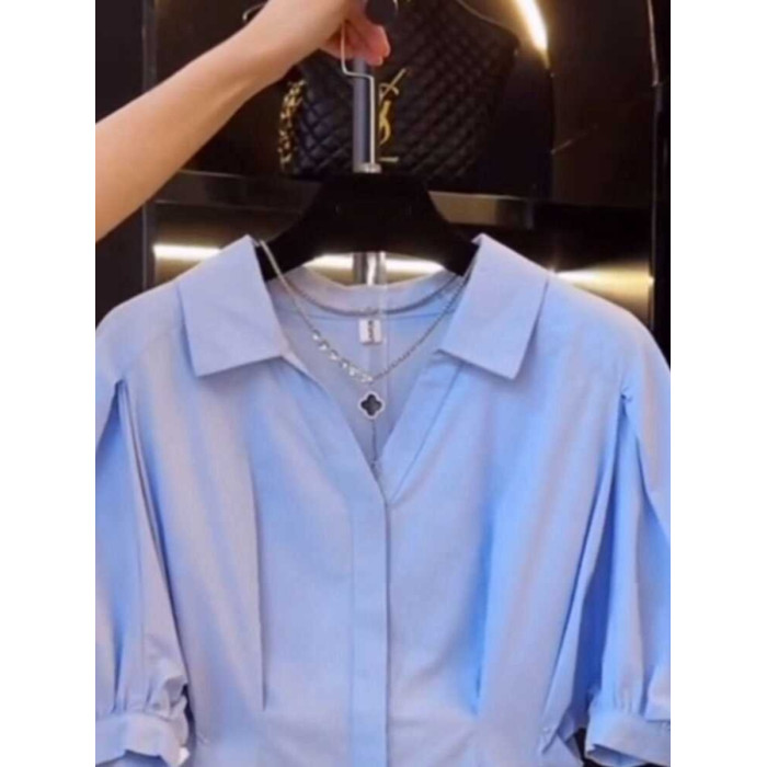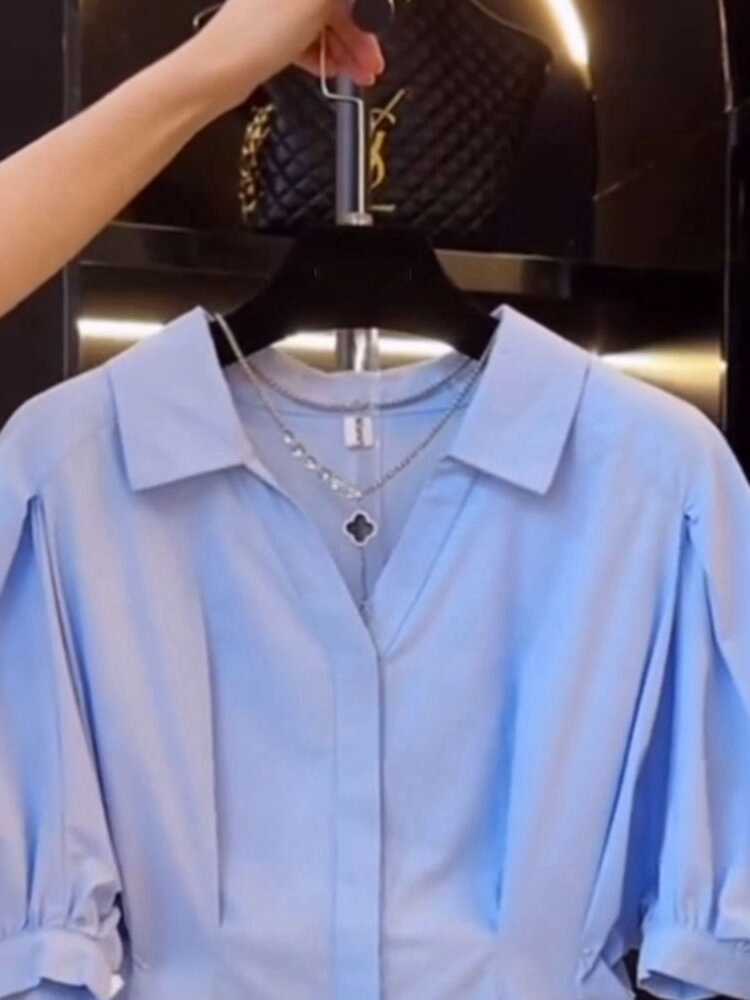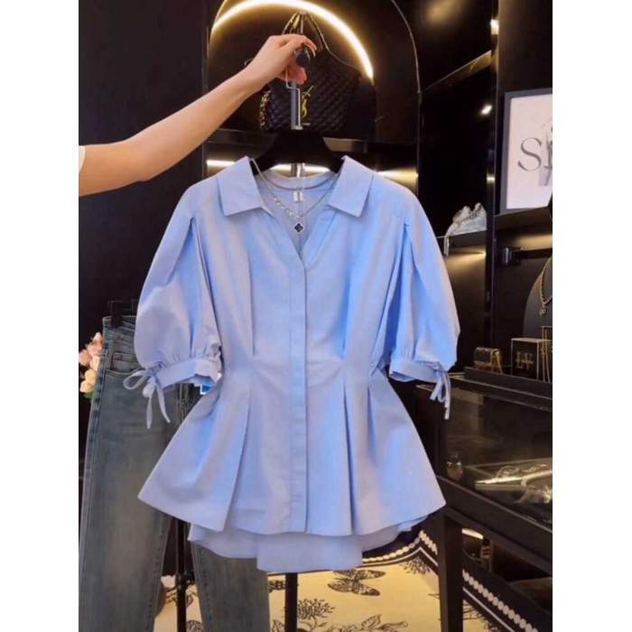 大碼女夏季收腰短袖襯衫胖mm顯瘦泡泡袖法式小衫獨特別致半袖上衣