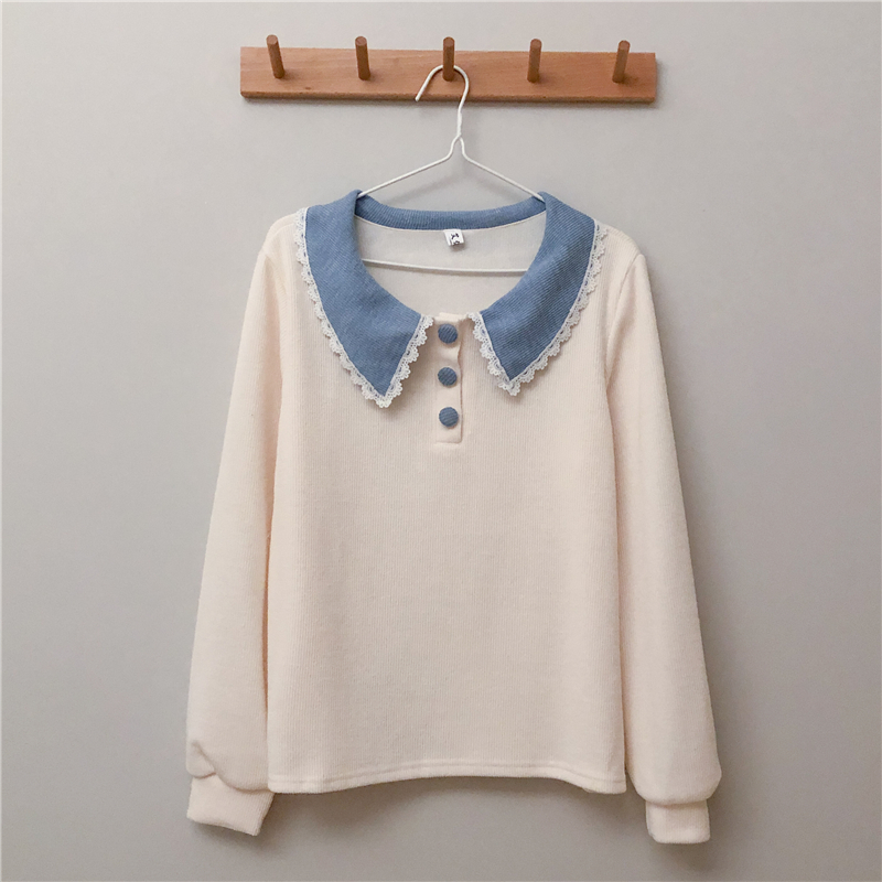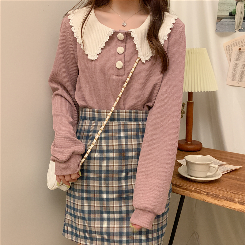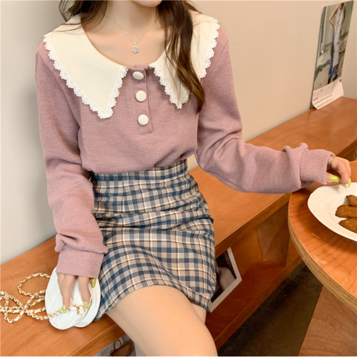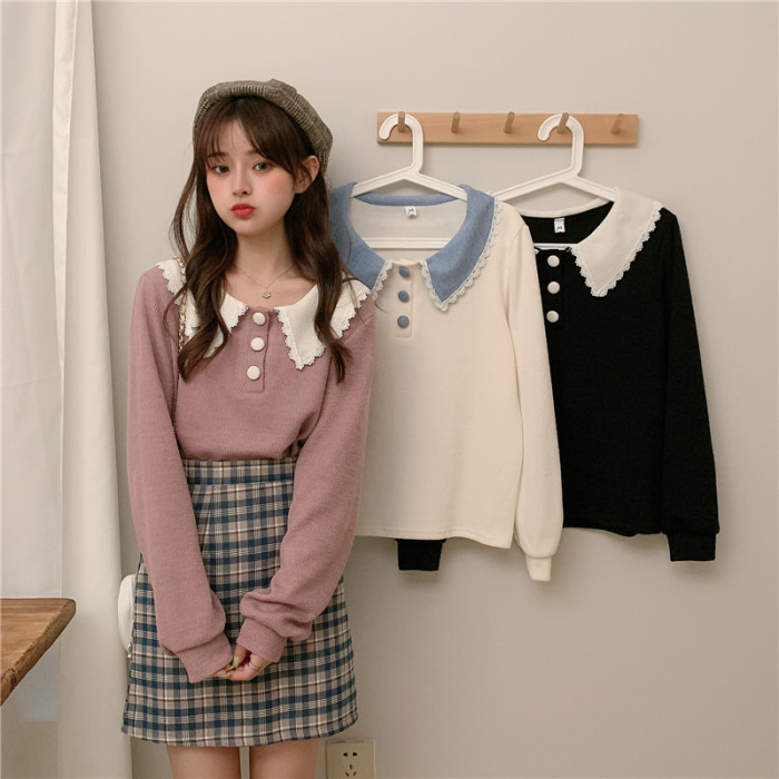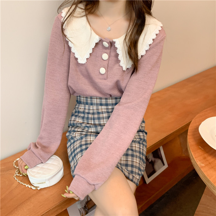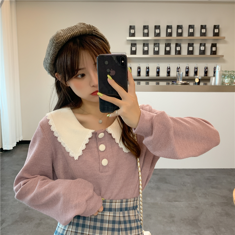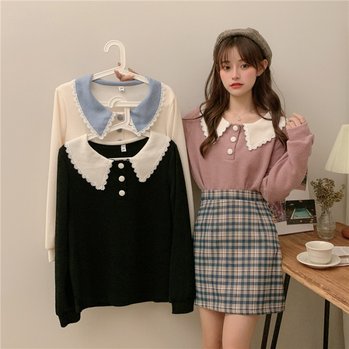 大碼胖mm娃娃領長袖針織襯衫春秋2025新款寬松打底上衣外穿毛衣女