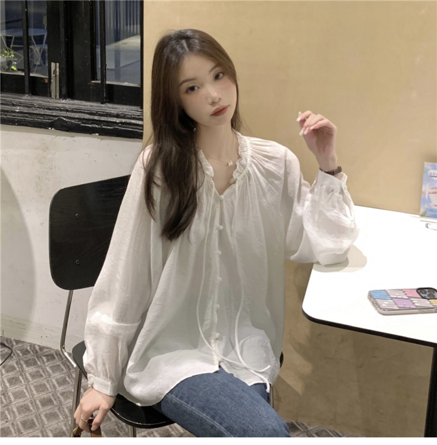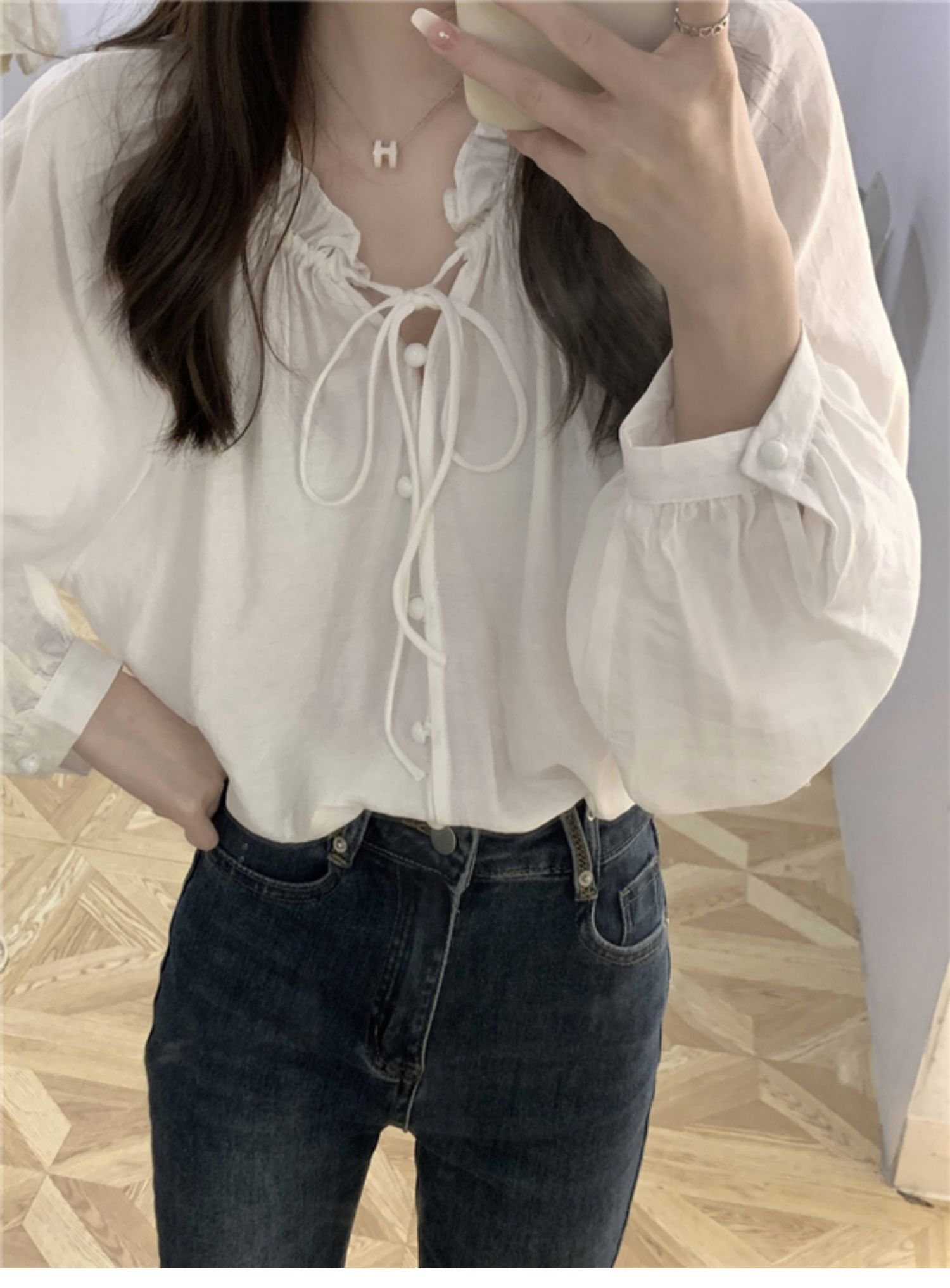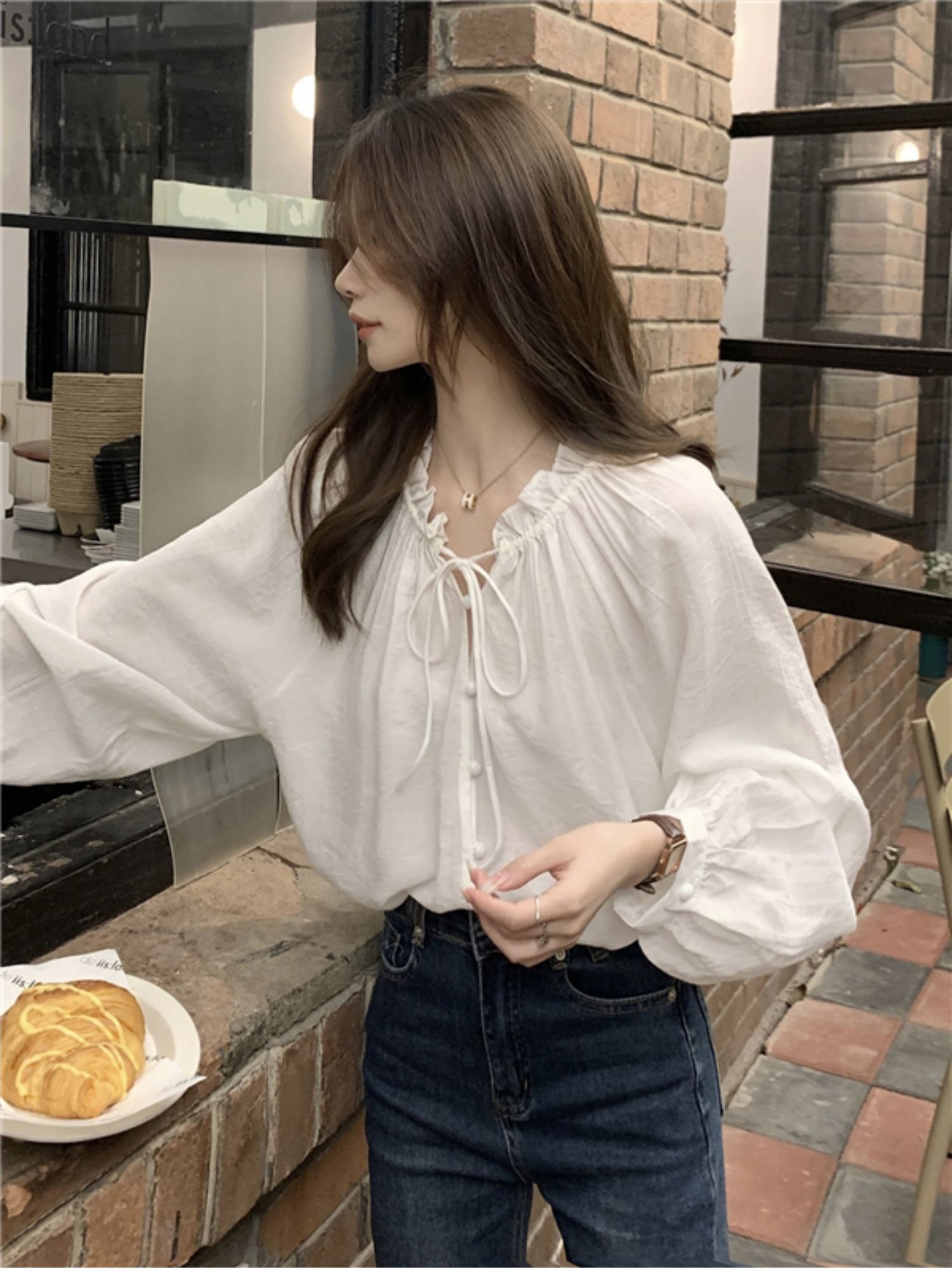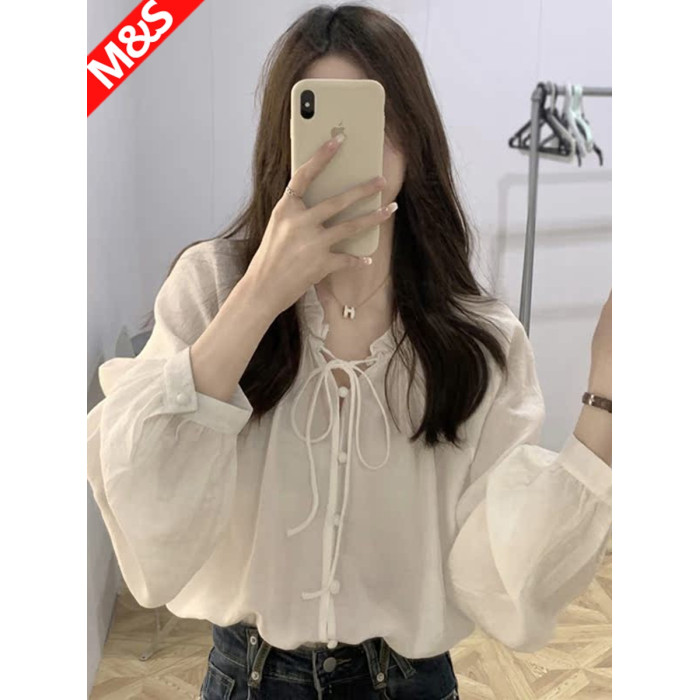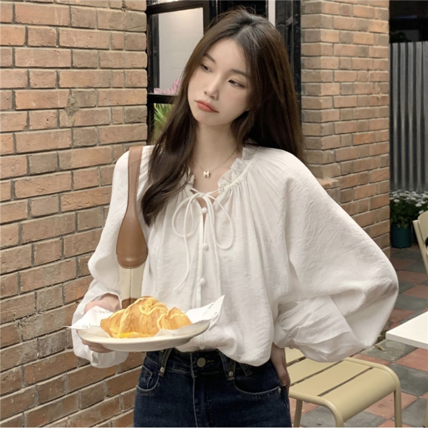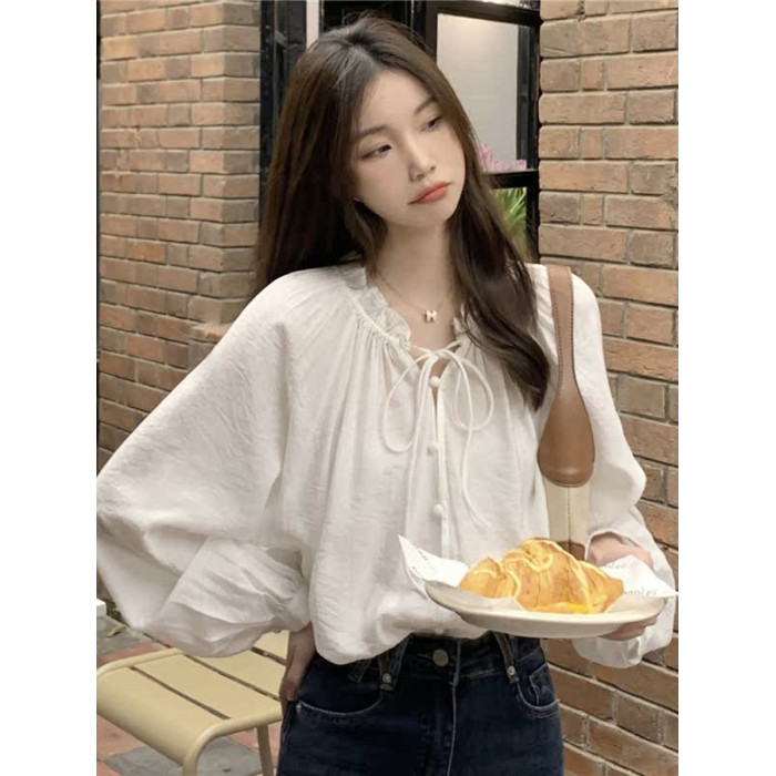 白色系帶長袖襯衫女夏薄款法式燈籠袖娃娃衫設計感小衆上衣白襯衣