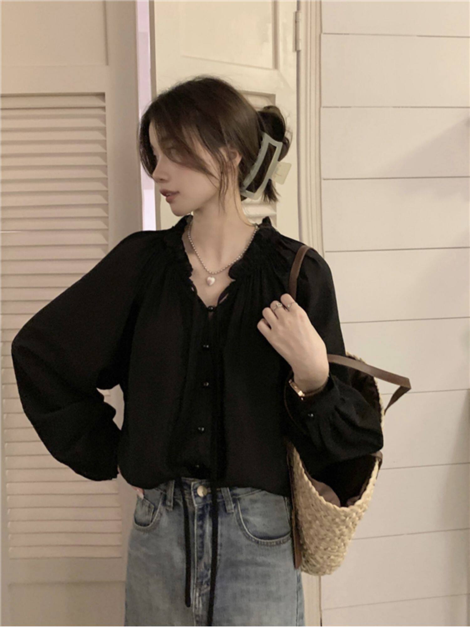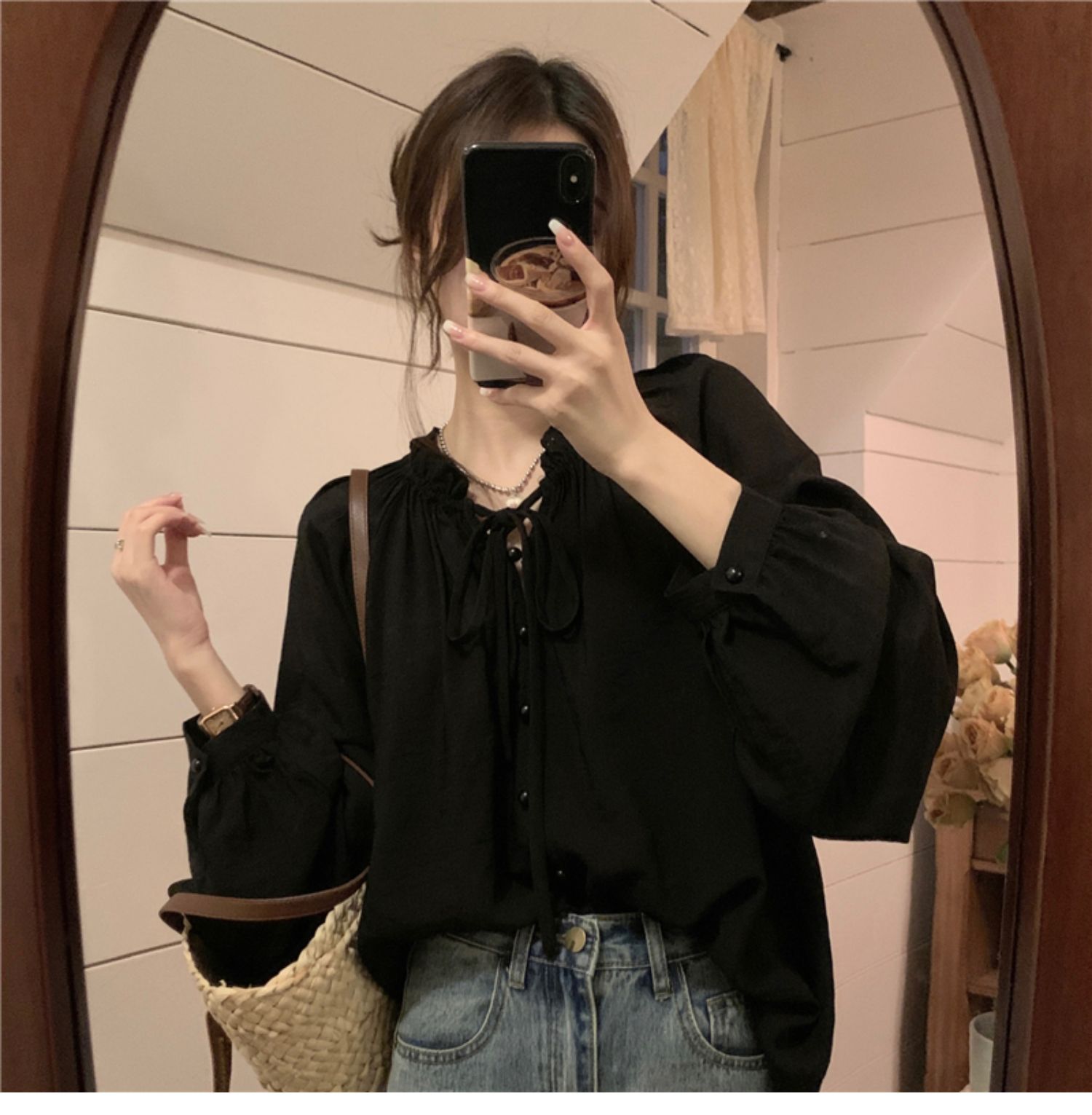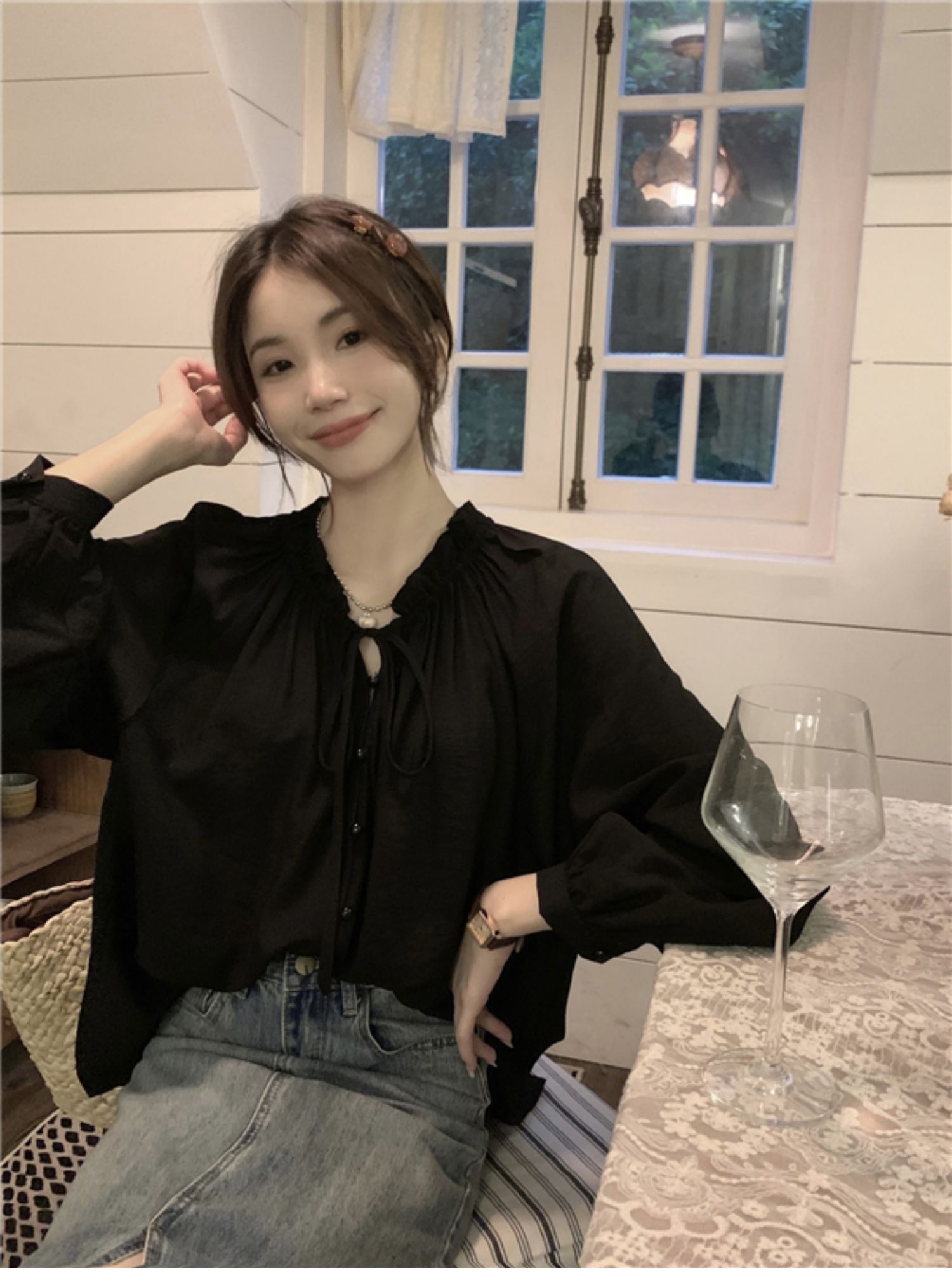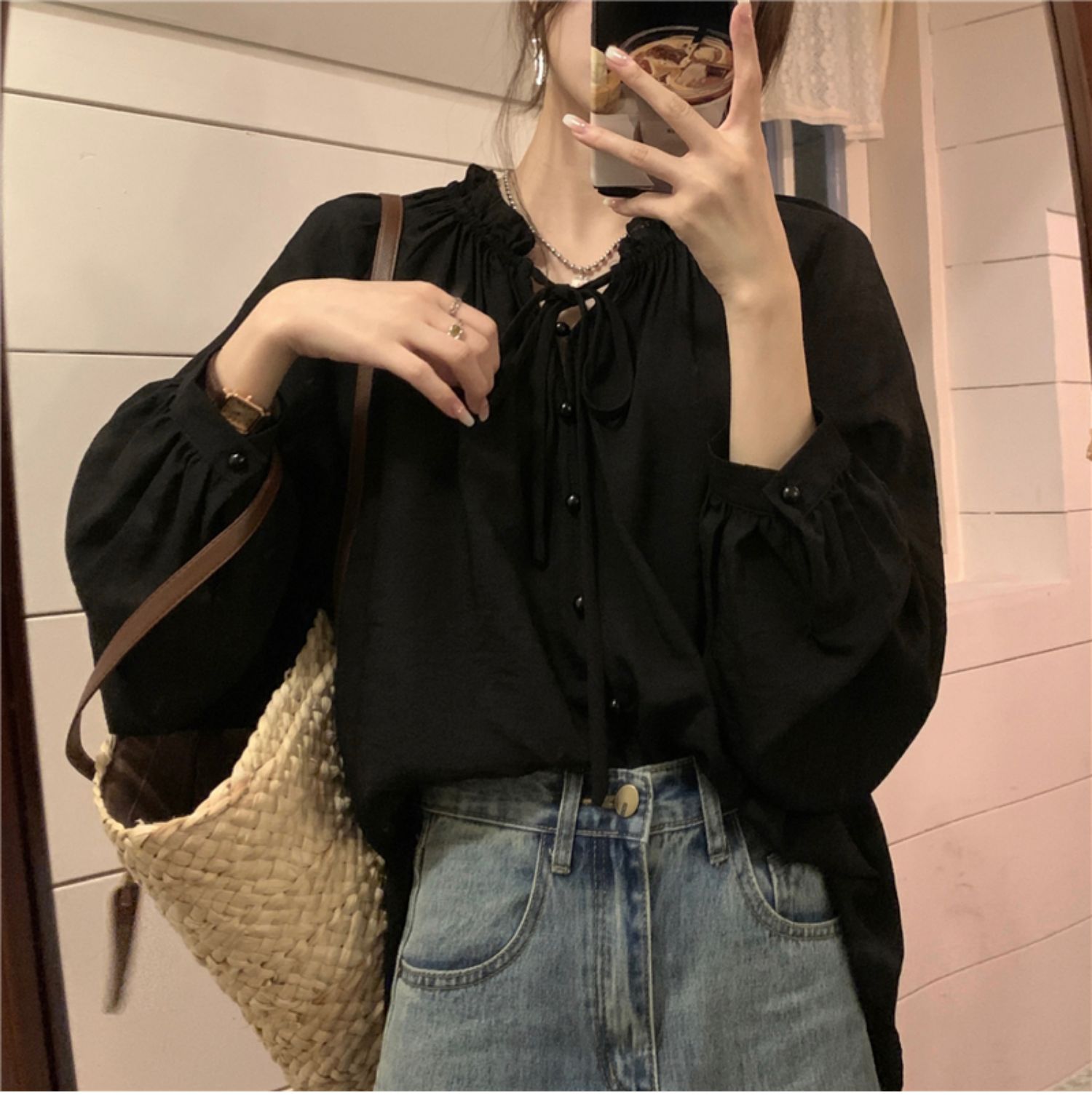 白色系帶長袖襯衫女夏薄款法式燈籠袖娃娃衫設計感小衆上衣白襯衣