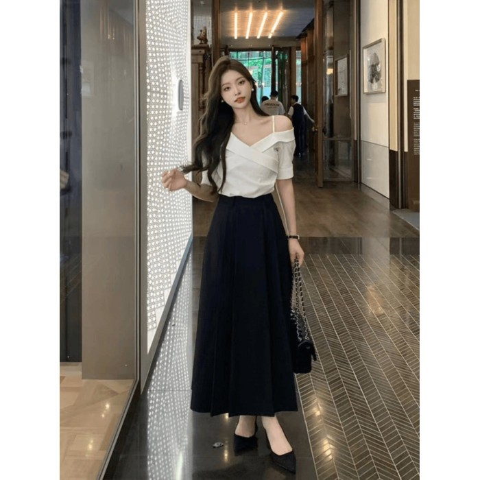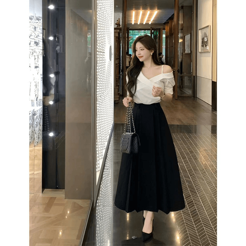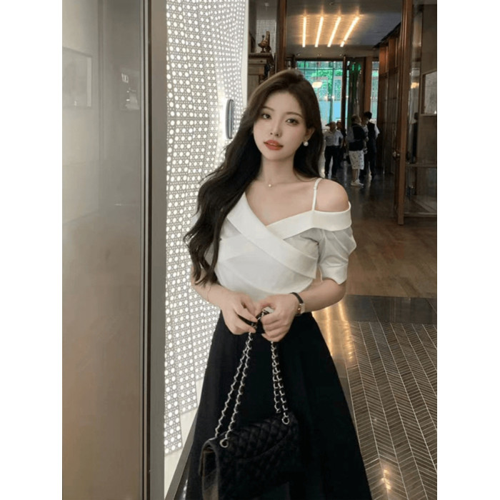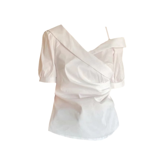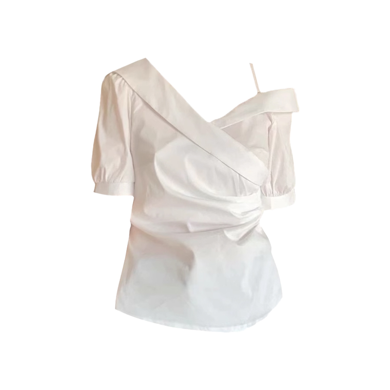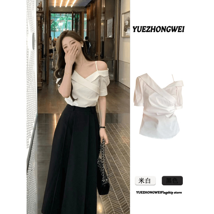 法式氣質白色吊帶短袖襯衫女夏季2025新款獨特超好看修身露肩上衣